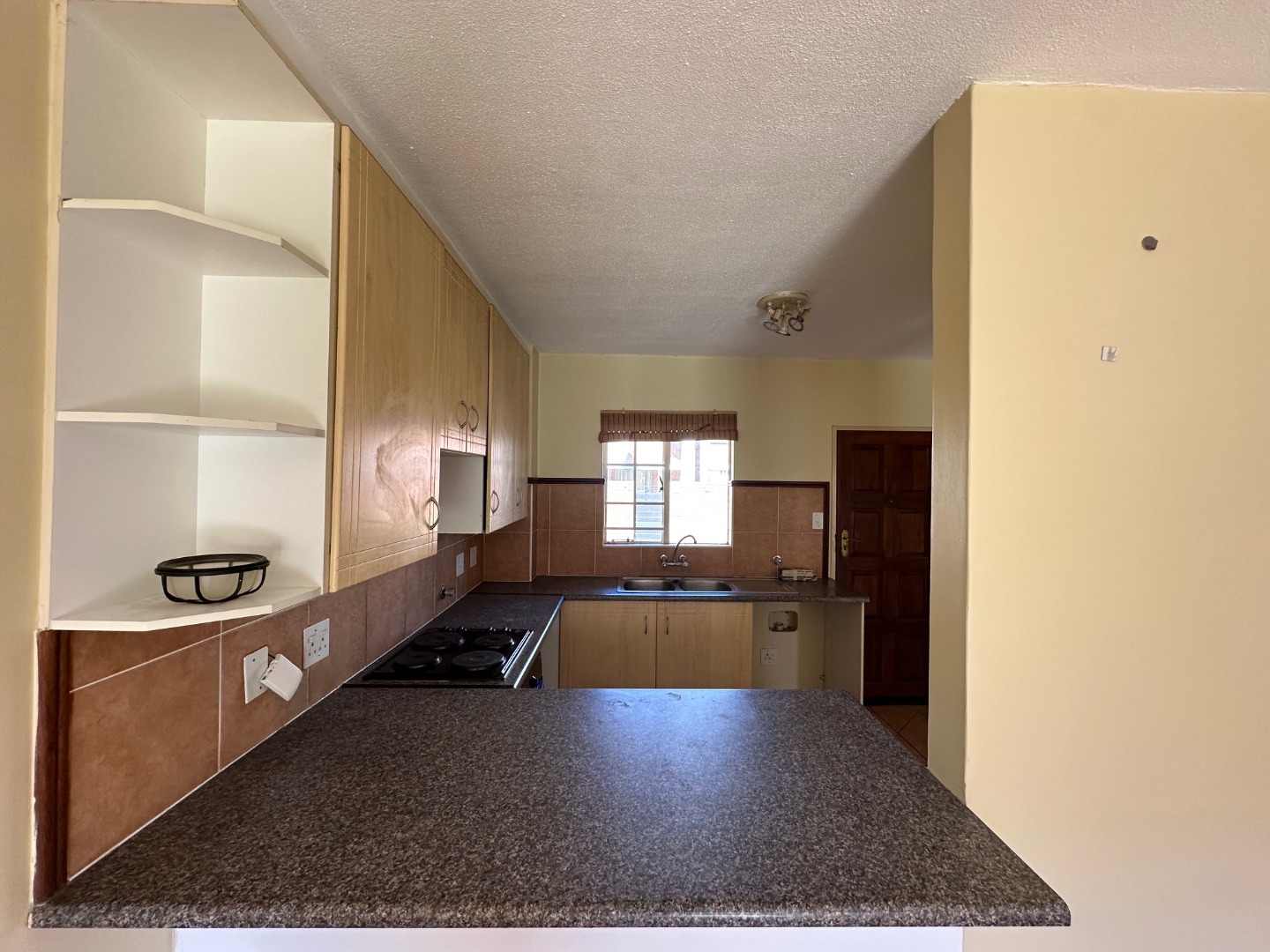 The home offers a spacious open-plan lounge and dining area, flowing into a modern kitchen with a breakfast counter and space for all appliances. Both bedrooms are well-sized with built-in cupboards, and the bathroom is neat and functional.