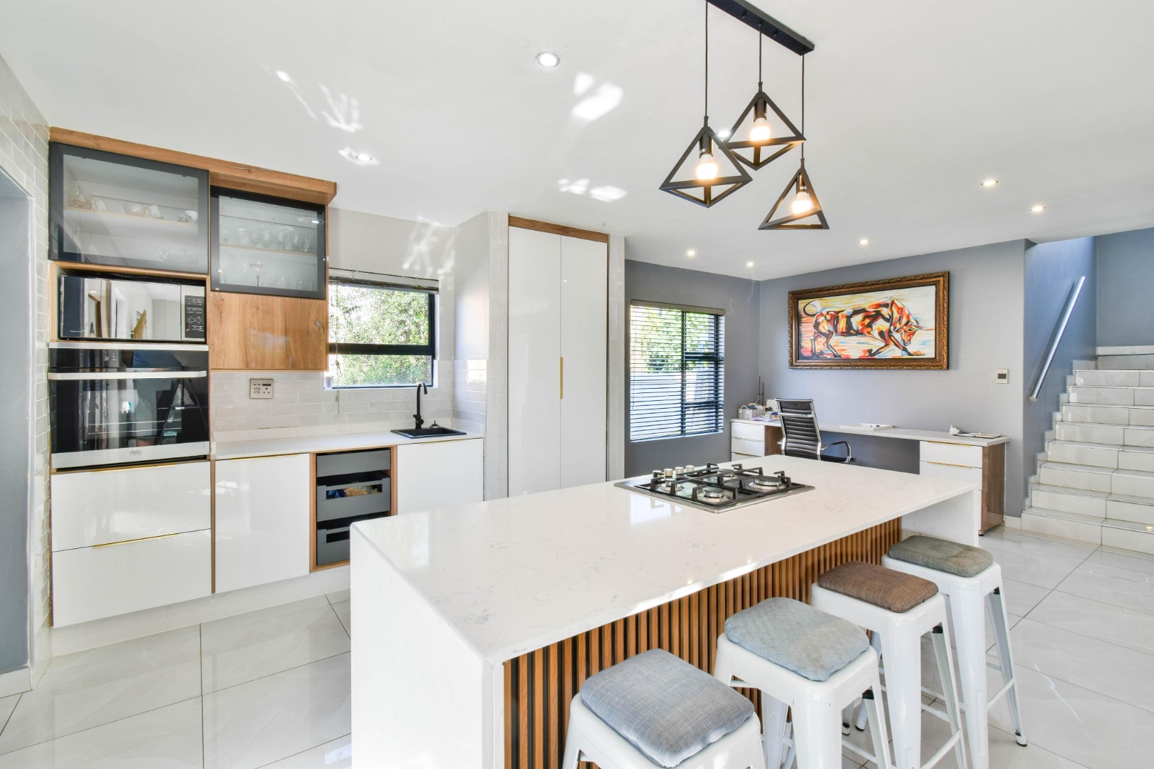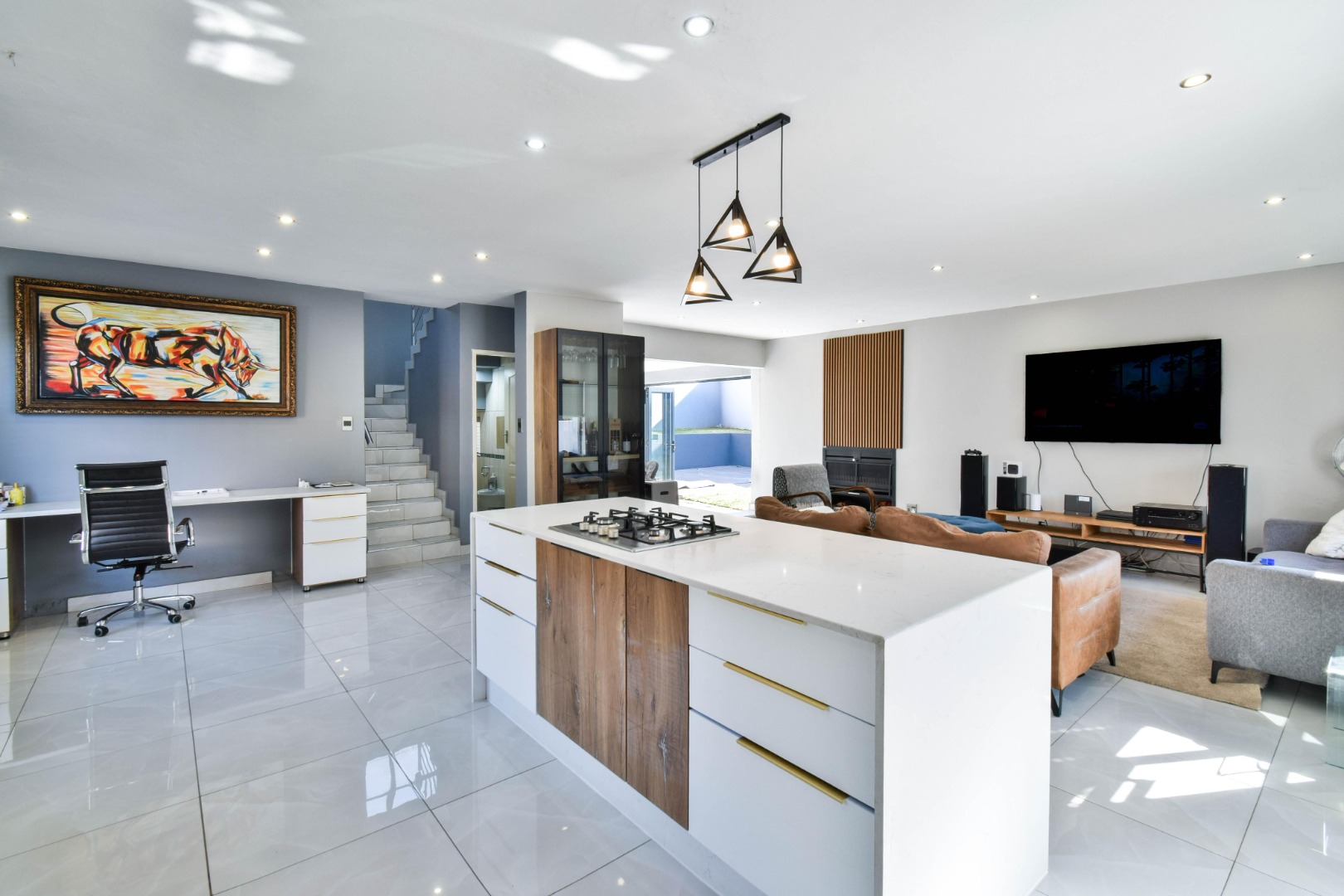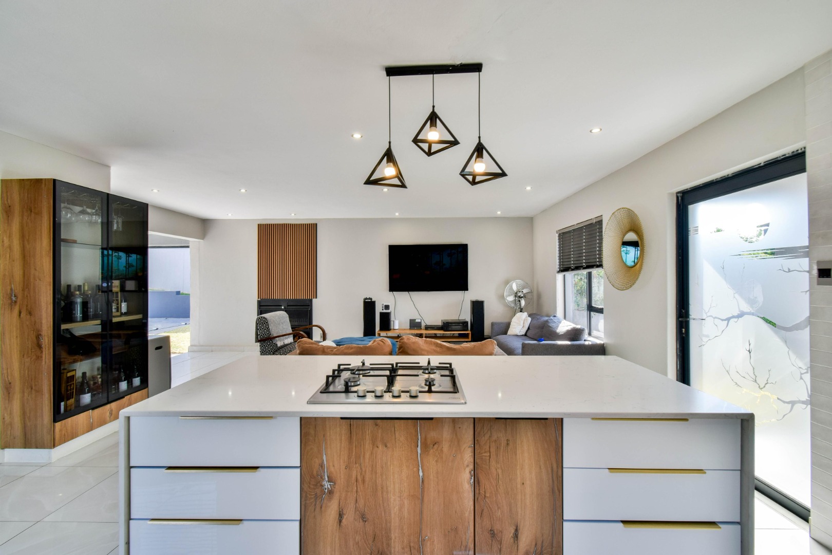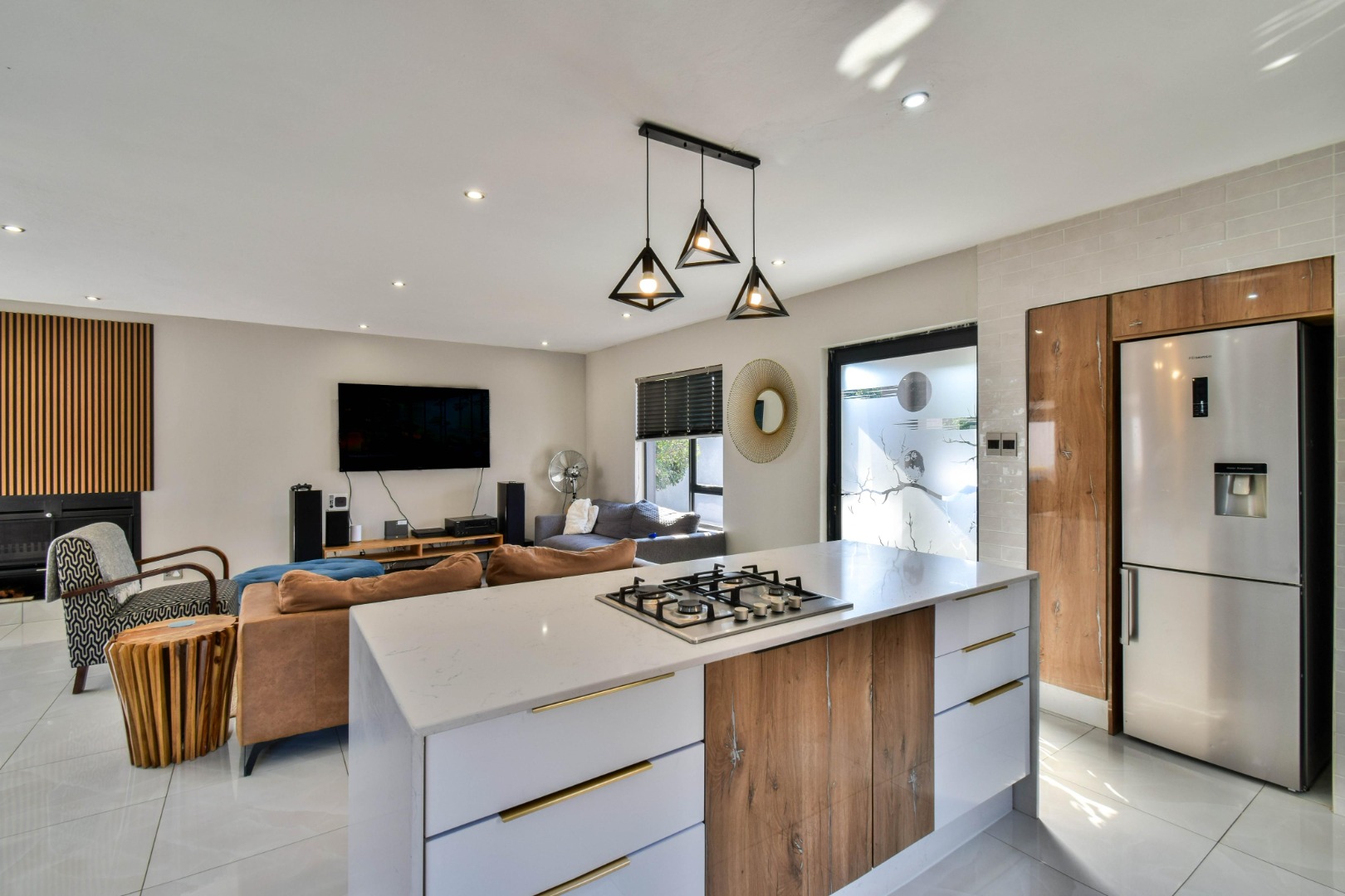 Step into a bright and inviting open-plan layout where the kitchen becomes the heart of the home. Boasting Caesarstone countertops, a center island, gas hob, eye-level oven, pantry cupboard, and a separate scullery with space for two appliances, it seamlessly combines practicality with style. The kitchen leads effortlessly to the dining and lounge area, where tiled floors, a cozy fireplace, built-in wine cupboard, and modern downlights create a warm yet contemporary atmosphere. Stackable doors open onto the garden and sparkling pool, making it perfect for entertaining. A guest toilet and convenient direct garage access complete the lower level.