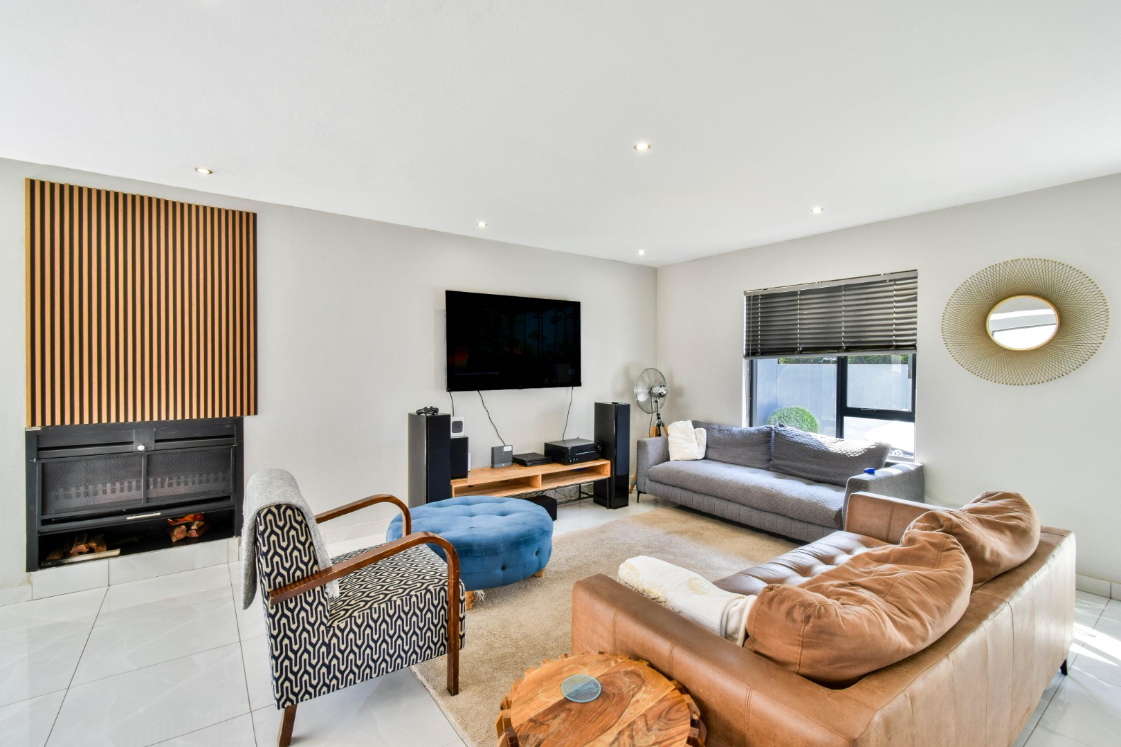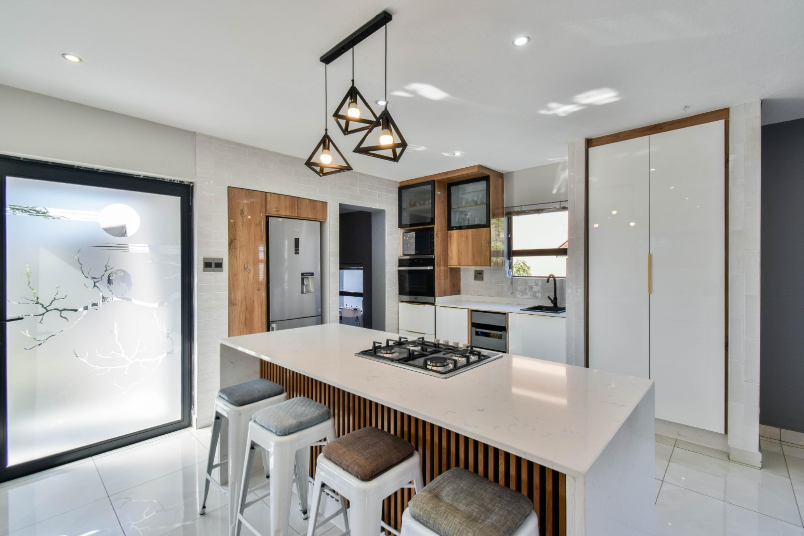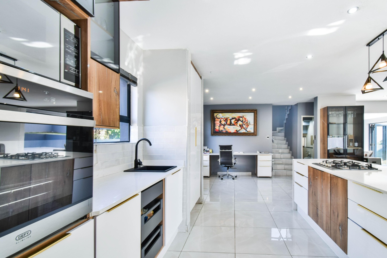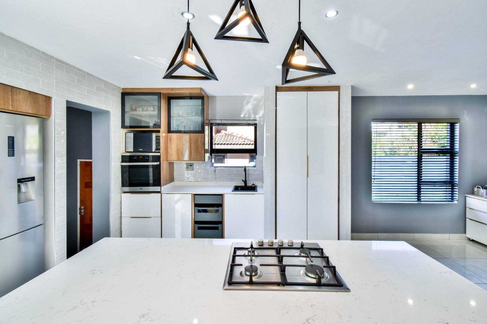 Step into a bright and inviting open-plan layout where the kitchen becomes the heart of the home. Boasting Caesarstone countertops, a center island, gas hob, eye-level oven, pantry cupboard, and a separate scullery with space for two appliances, it seamlessly combines practicality with style. The kitchen leads effortlessly to the dining and lounge area, where tiled floors, a cozy fireplace, built-in wine cupboard, and modern downlights create a warm yet contemporary atmosphere. Stackable doors open onto the garden and sparkling pool, making it perfect for entertaining. A guest toilet and convenient direct garage access complete the lower level.