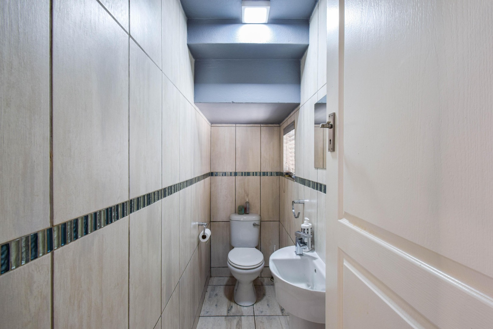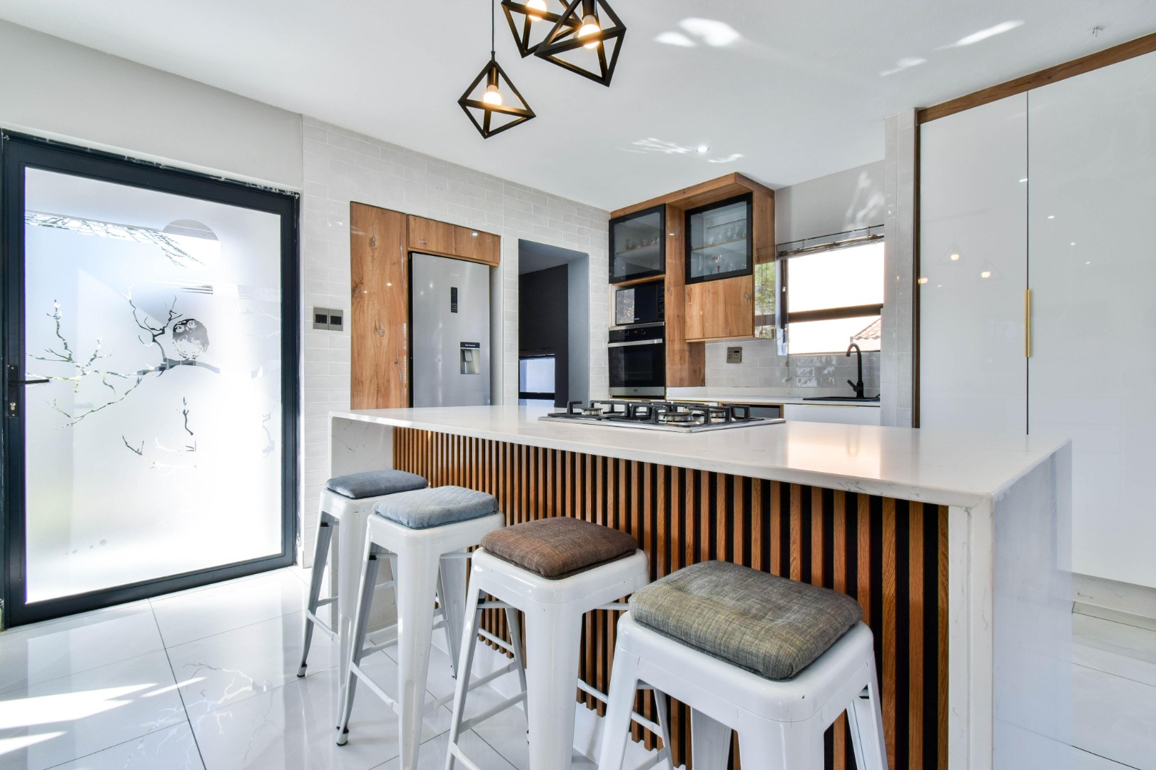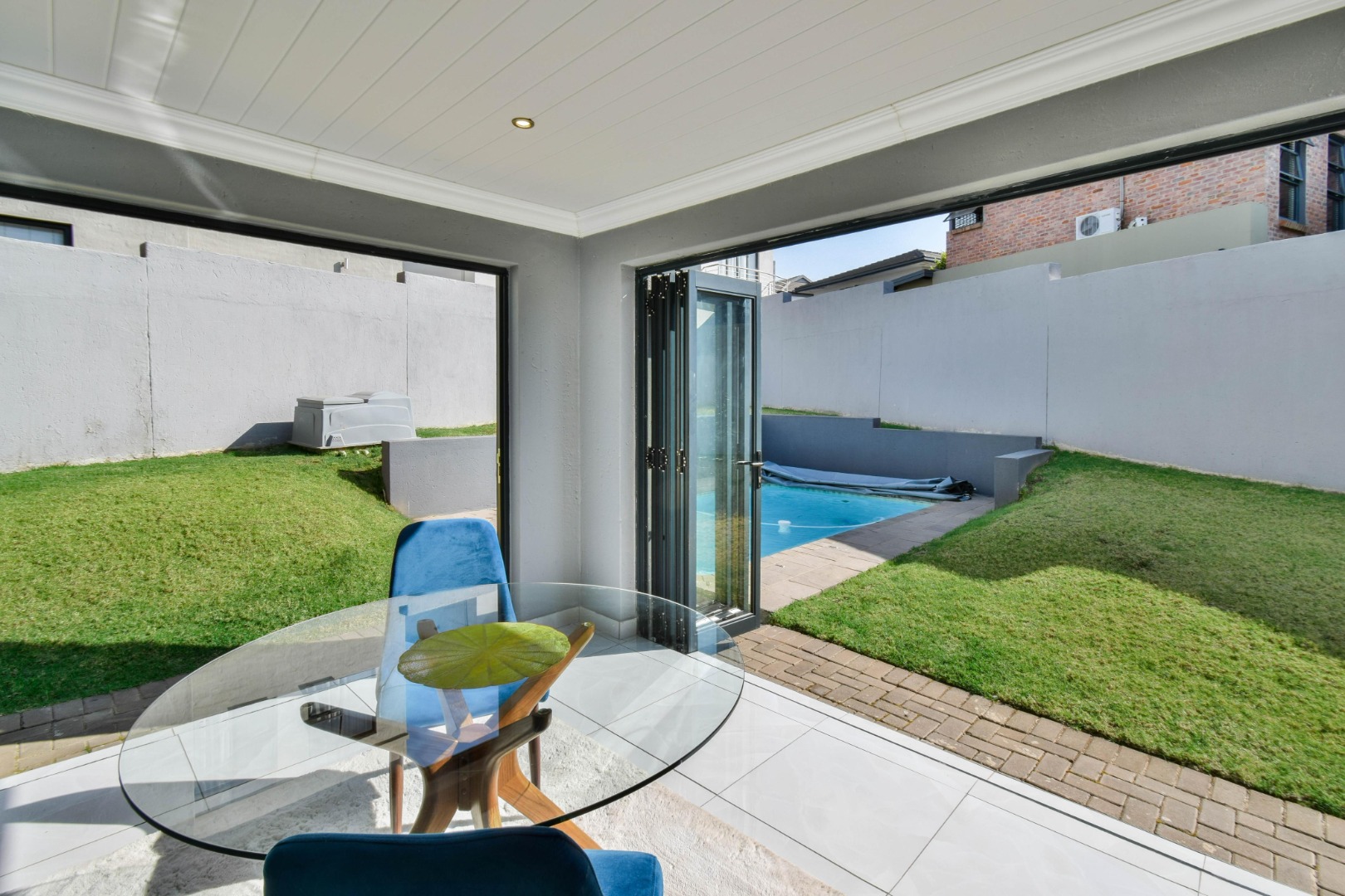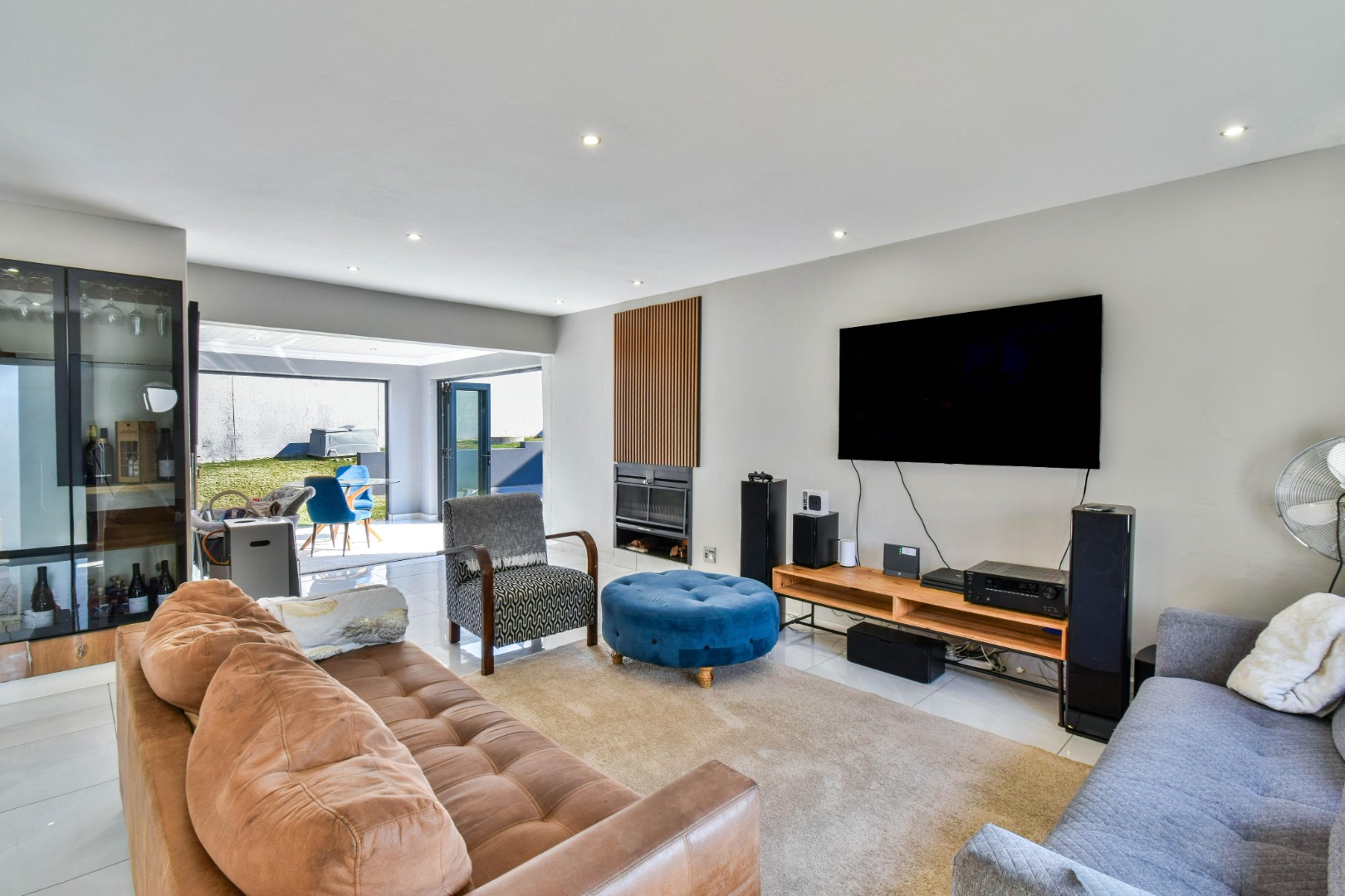 Step into a bright and inviting open-plan layout where the kitchen becomes the heart of the home. Boasting Caesarstone countertops, a center island, gas hob, eye-level oven, pantry cupboard, and a separate scullery with space for two appliances, it seamlessly combines practicality with style. The kitchen leads effortlessly to the dining and lounge area, where tiled floors, a cozy fireplace, built-in wine cupboard, and modern downlights create a warm yet contemporary atmosphere. Stackable doors open onto the garden and sparkling pool, making it perfect for entertaining. A guest toilet and convenient direct garage access complete the lower level.