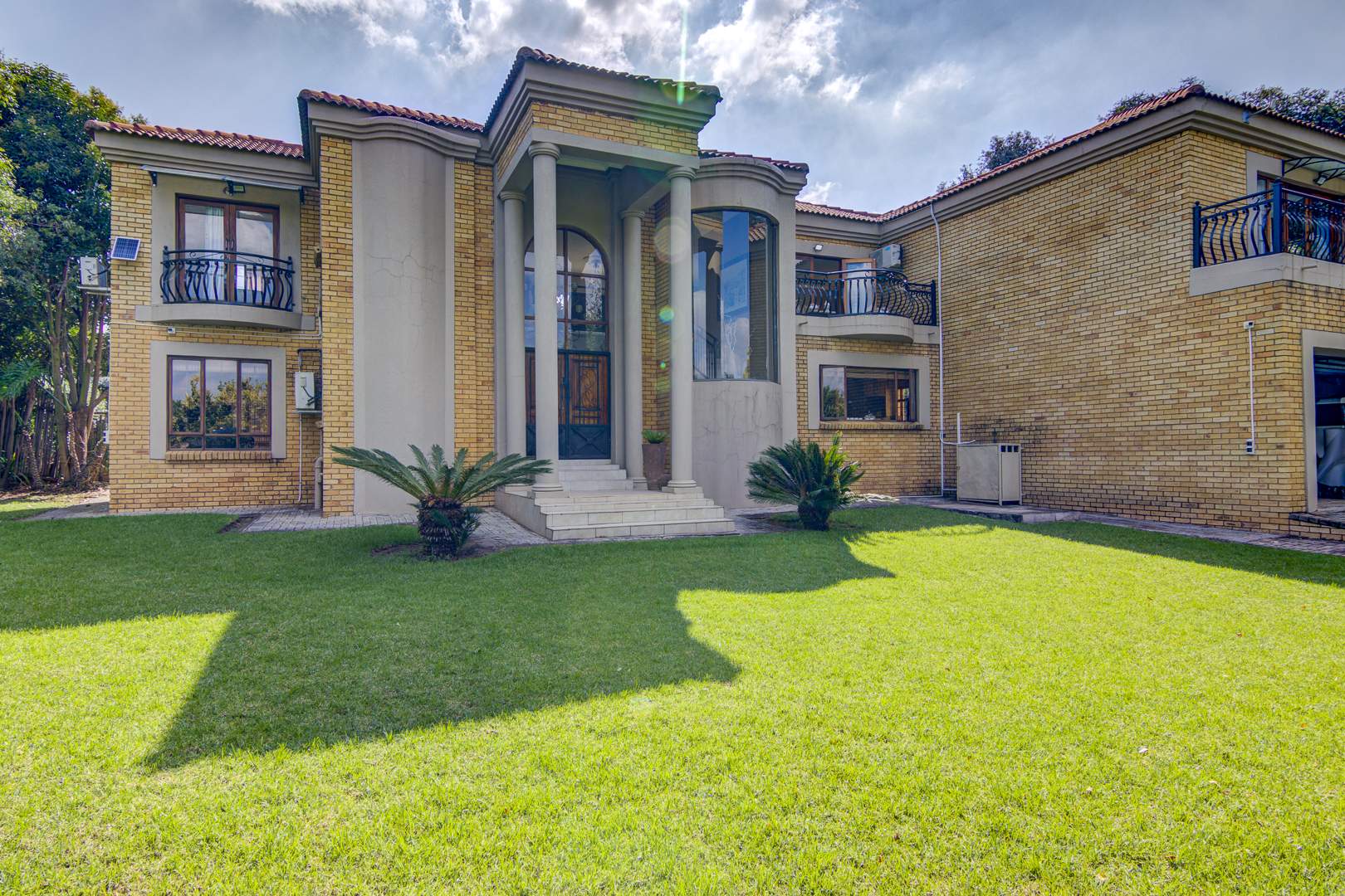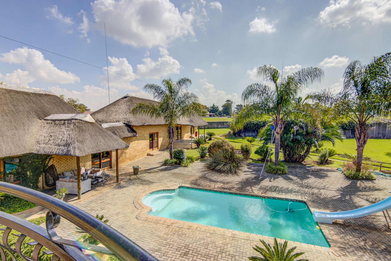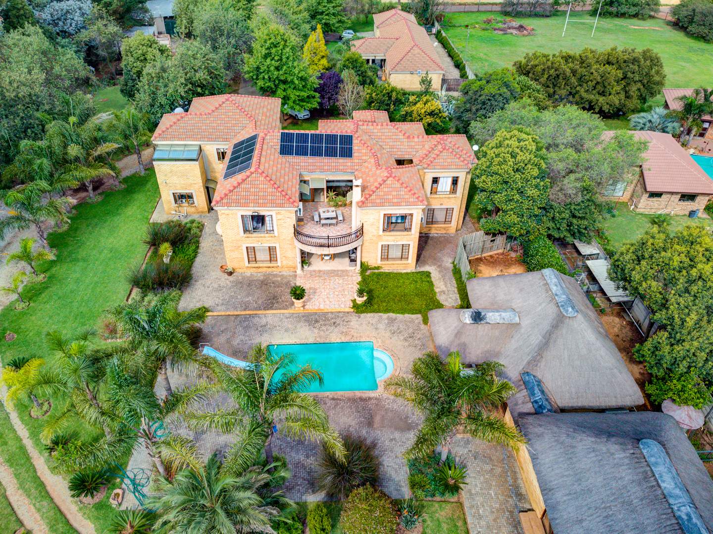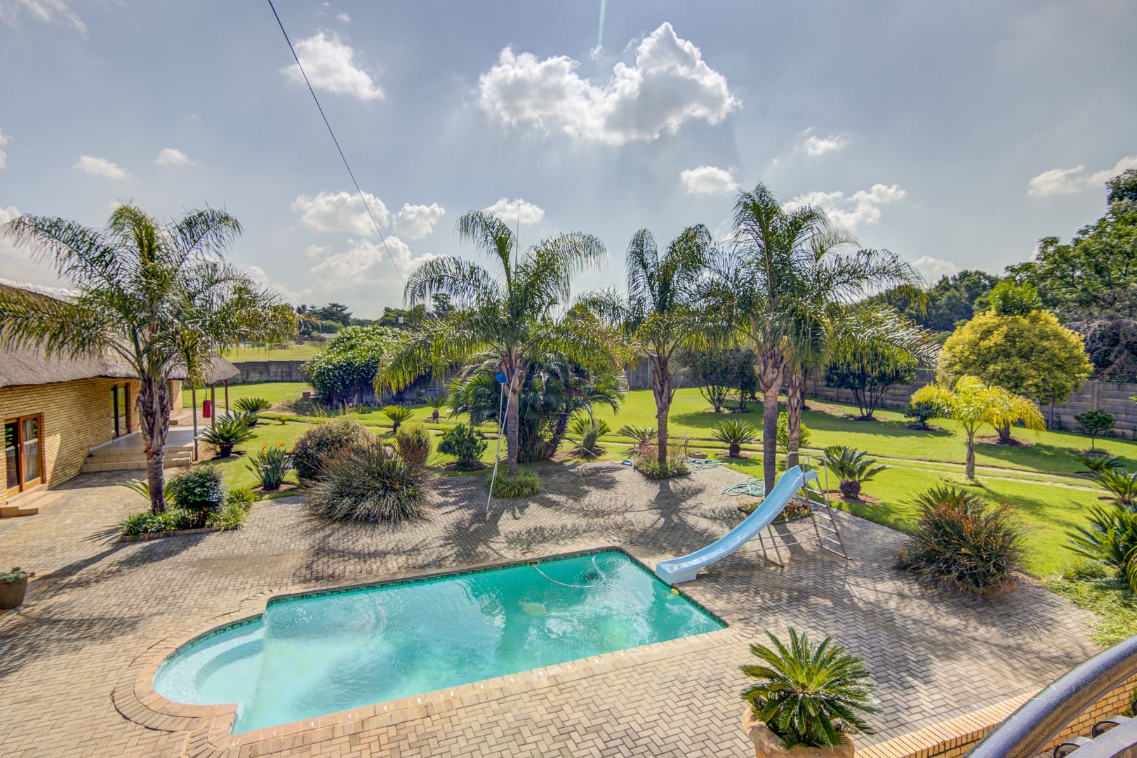 The property's outdoor amenities are designed for a luxurious lifestyle. Enjoy a lush sparkling swimming pool featuring a slide, alongside a relaxing jacuzzi and a charming lapa, perfect for outdoor gatherings. The extensive, lush gardens are beautifully maintained, offering a serene environment with mature trees and paved pathways. Additional features include multiple balconies and a triple garage. Pets are welcome, making this an ideal family home.