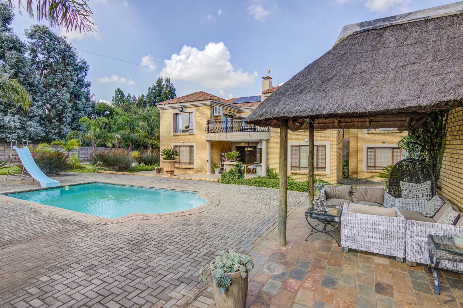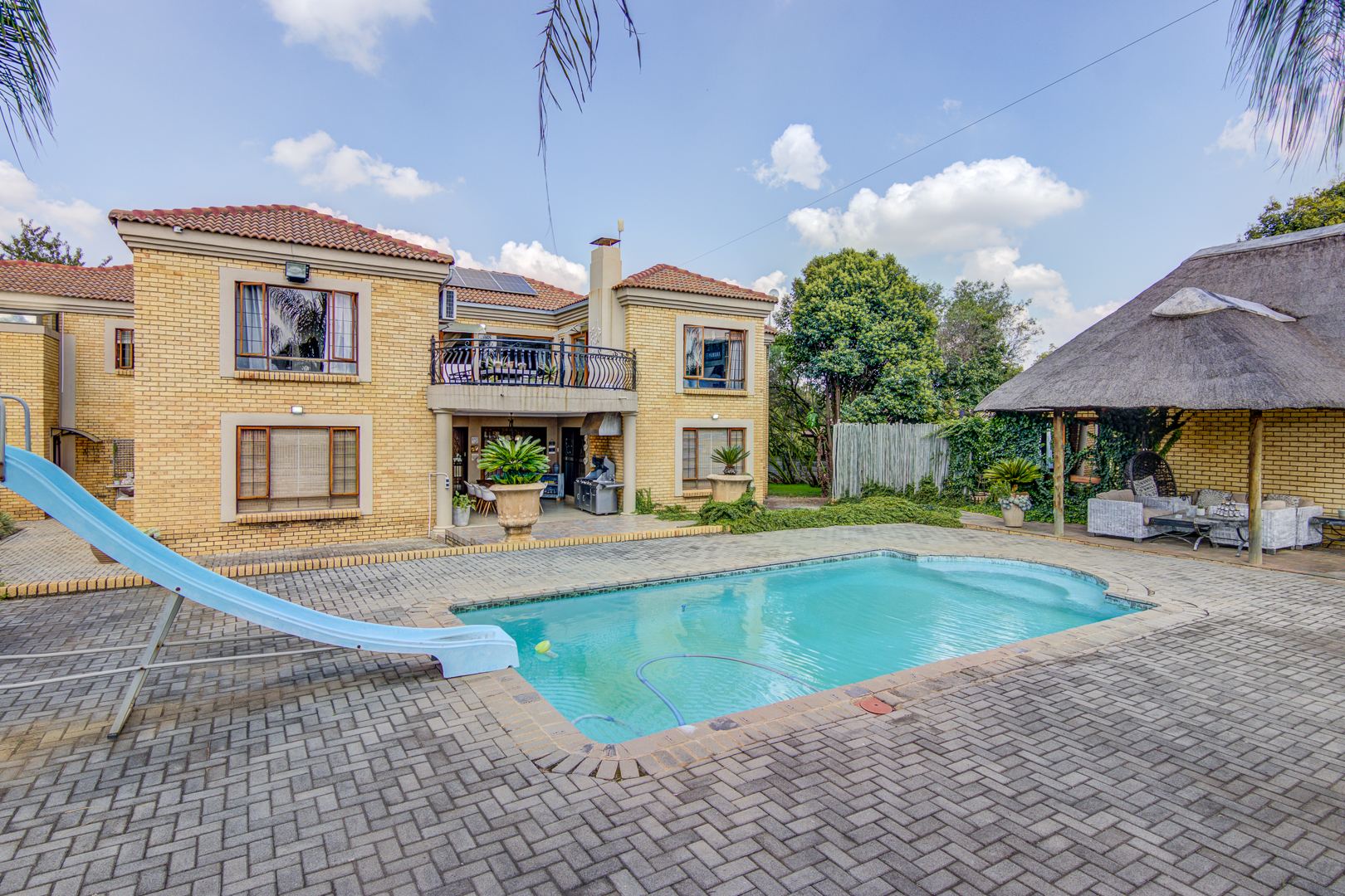 The property's outdoor amenities are designed for a luxurious lifestyle. Enjoy a lush sparkling swimming pool featuring a slide, alongside a relaxing jacuzzi and a charming lapa, perfect for outdoor gatherings. The extensive, lush gardens are beautifully maintained, offering a serene environment with mature trees and paved pathways. Additional features include multiple balconies and a triple garage. Pets are welcome, making this an ideal family home.