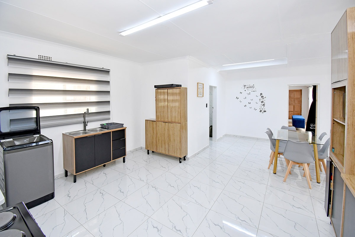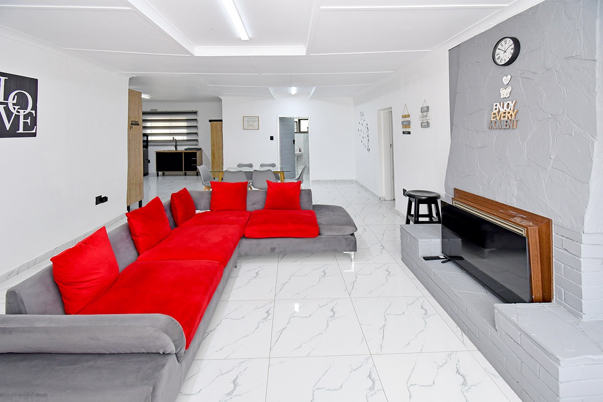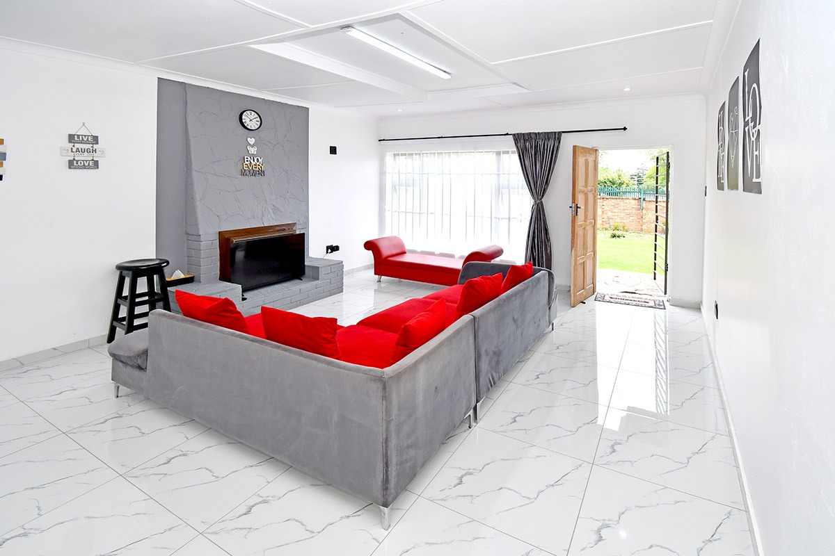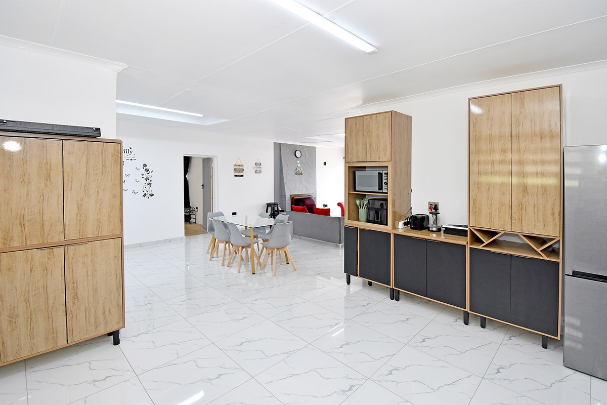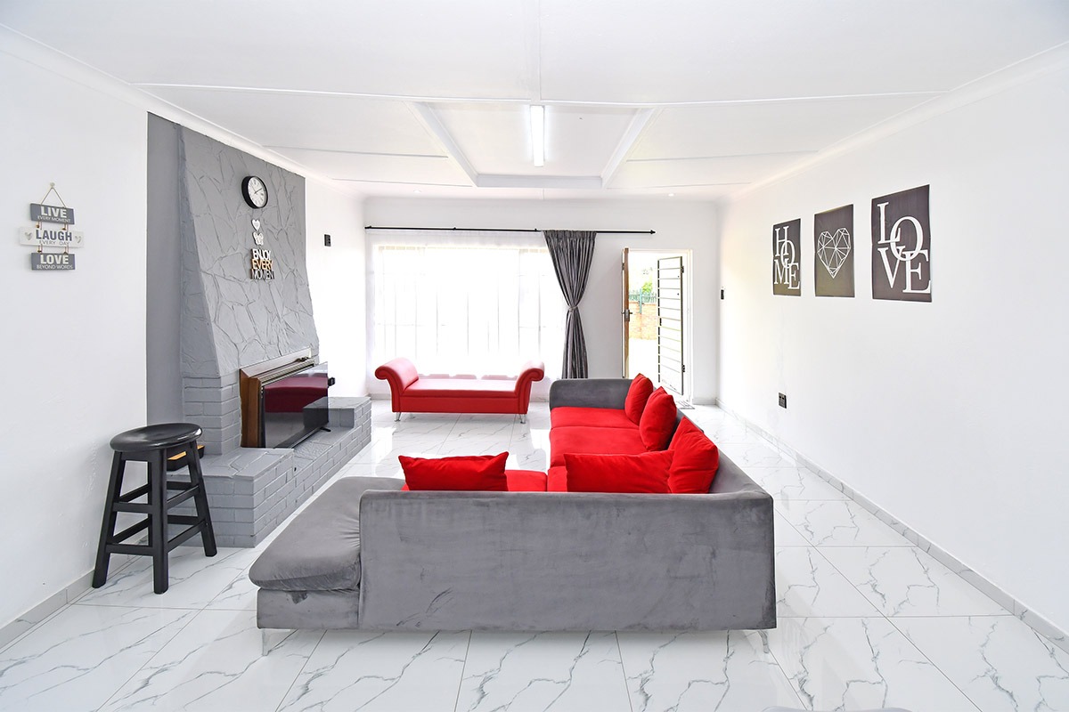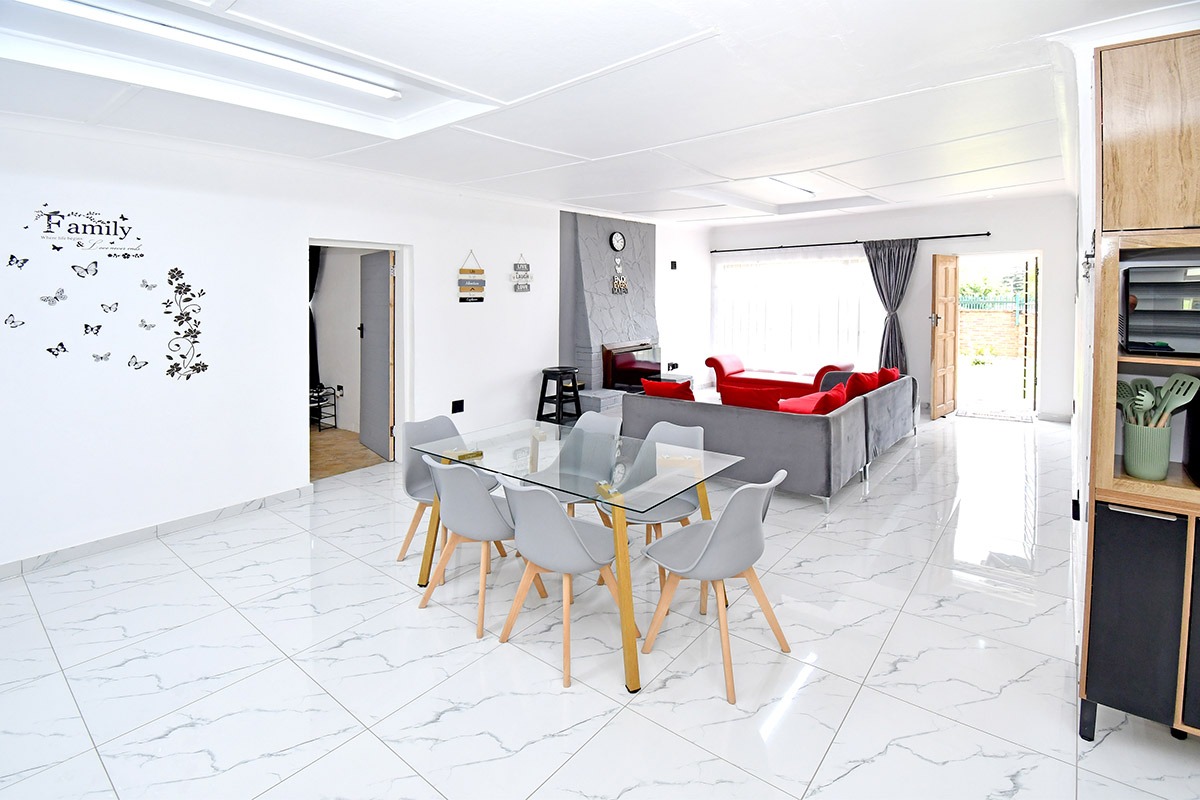 This home offers a contemporary living experience with its bright, open-plan design. The interior boasts clean white walls and modern marble-look tiled flooring throughout, creating a fresh and inviting atmosphere. The property features two comfortable lounges and a dedicated dining room, providing ample space for relaxation and entertaining. Unique to this home are two distinct kitchen areas, offering flexibility and convenience for various culinary needs, equipped with essential freestanding appliances. A decorative fireplace feature adds a touch of character to the main living space.