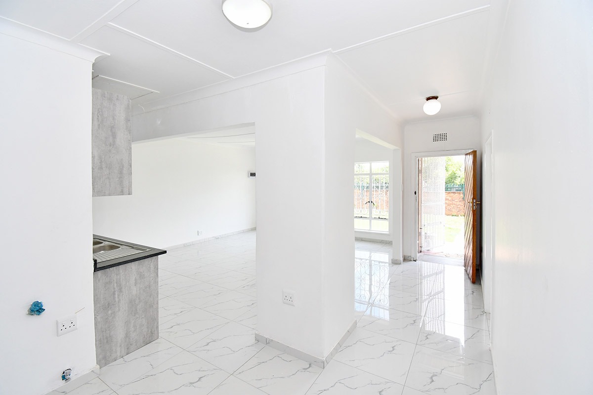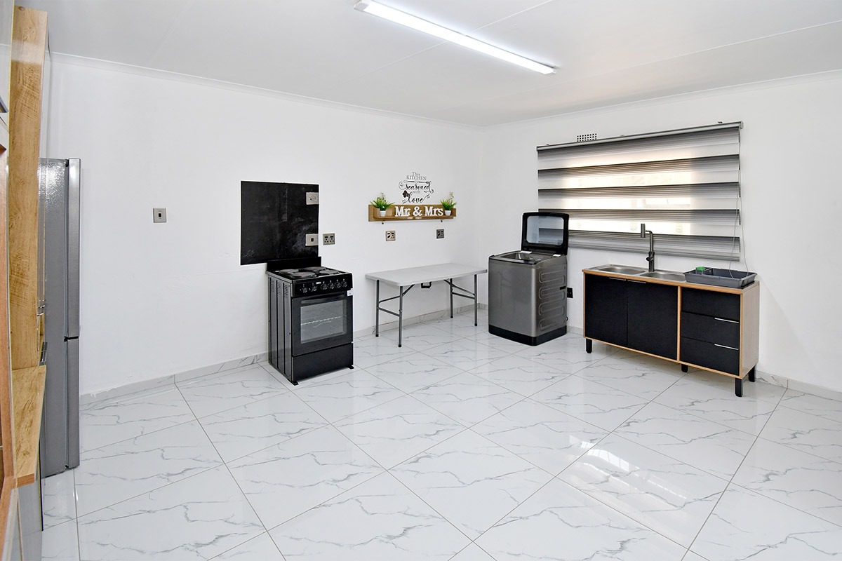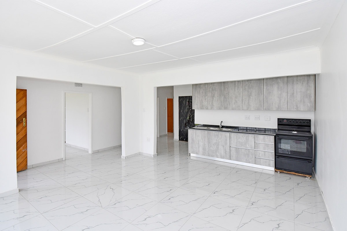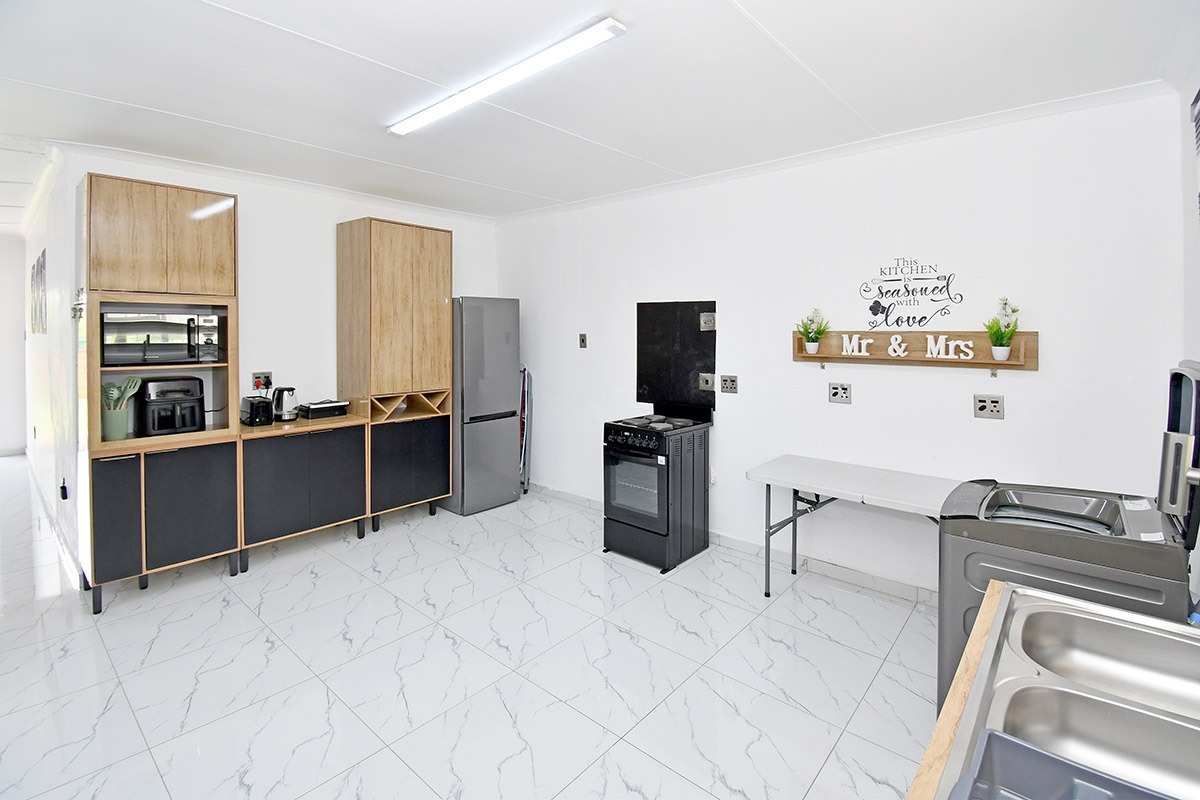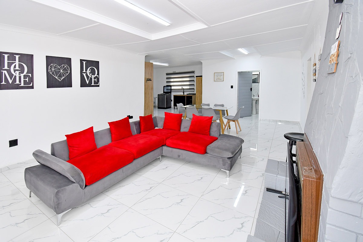 This home offers a contemporary living experience with its bright, open-plan design. The interior boasts clean white walls and modern marble-look tiled flooring throughout, creating a fresh and inviting atmosphere. The property features two comfortable lounges and a dedicated dining room, providing ample space for relaxation and entertaining. Unique to this home are two distinct kitchen areas, offering flexibility and convenience for various culinary needs, equipped with essential freestanding appliances. A decorative fireplace feature adds a touch of character to the main living space.