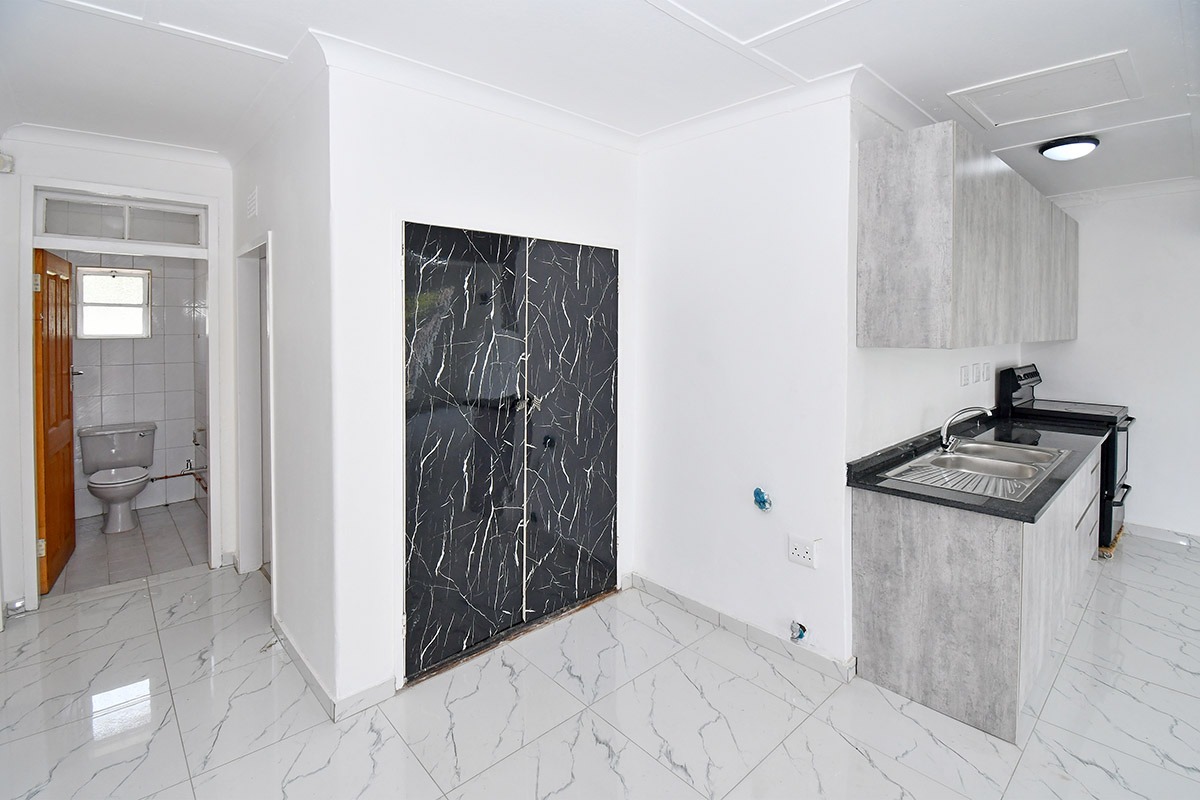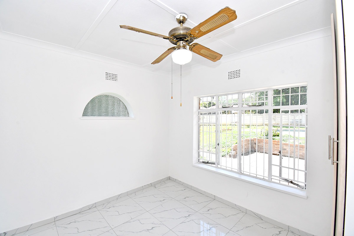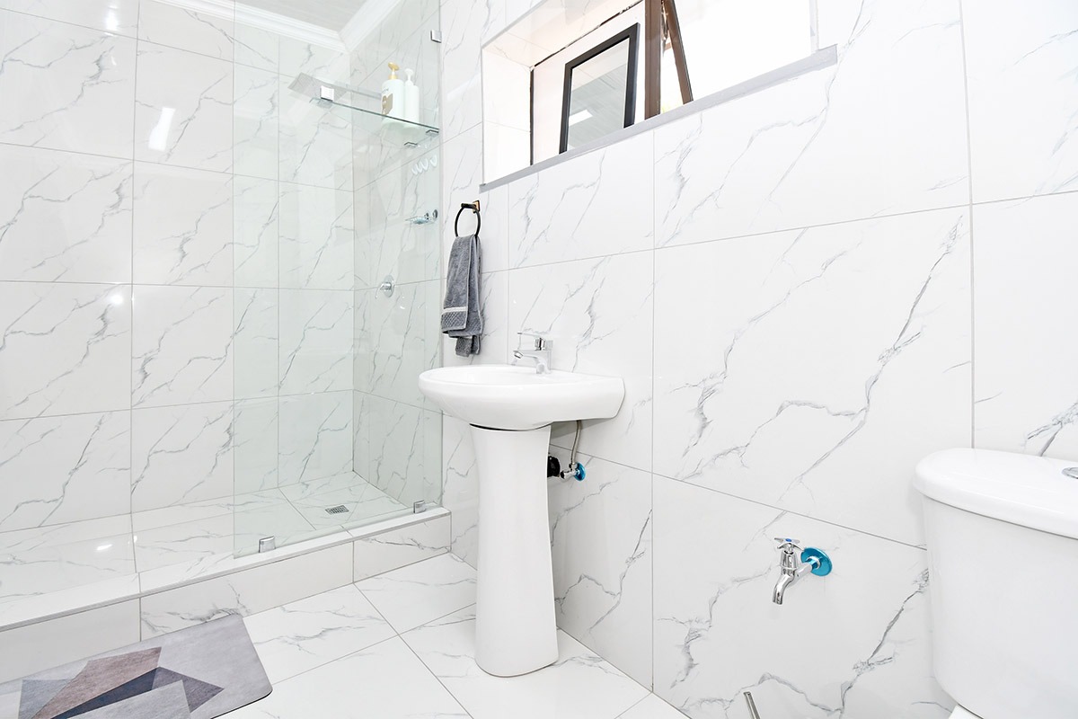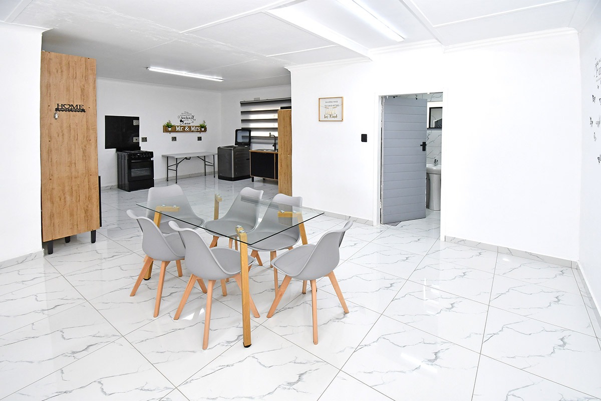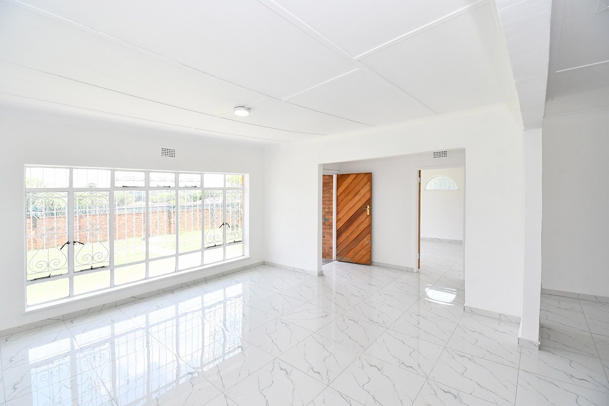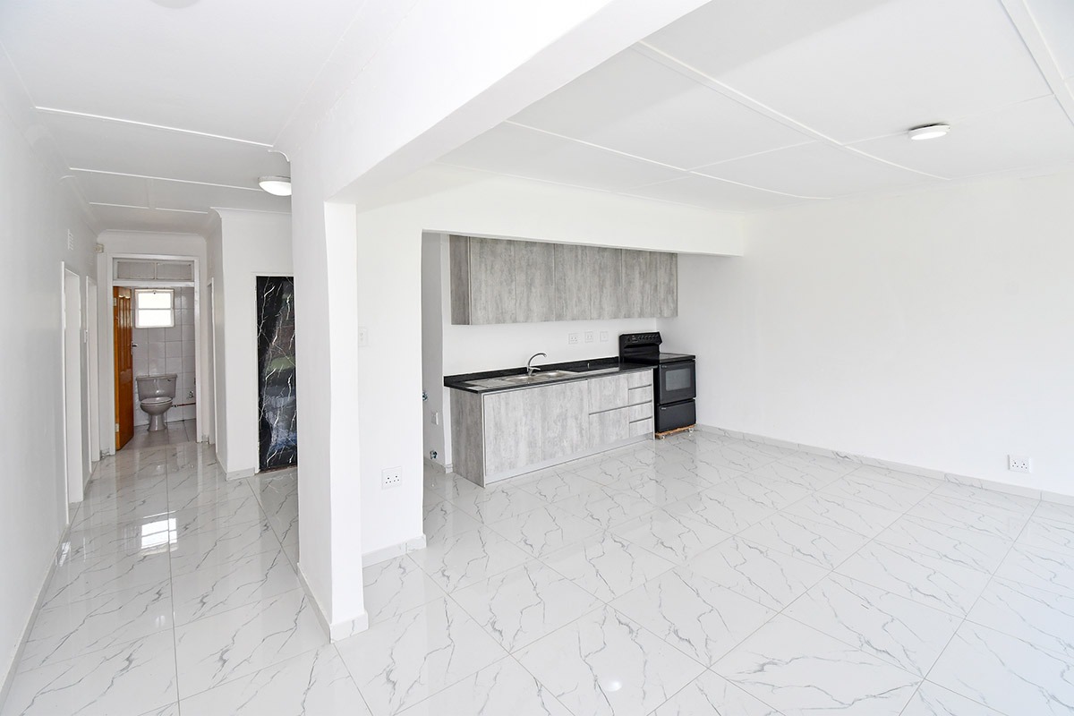 This home offers a contemporary living experience with its bright, open-plan design. The interior boasts clean white walls and modern marble-look tiled flooring throughout, creating a fresh and inviting atmosphere. The property features two comfortable lounges and a dedicated dining room, providing ample space for relaxation and entertaining. Unique to this home are two distinct kitchen areas, offering flexibility and convenience for various culinary needs, equipped with essential freestanding appliances. A decorative fireplace feature adds a touch of character to the main living space.