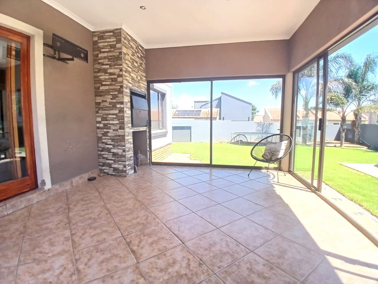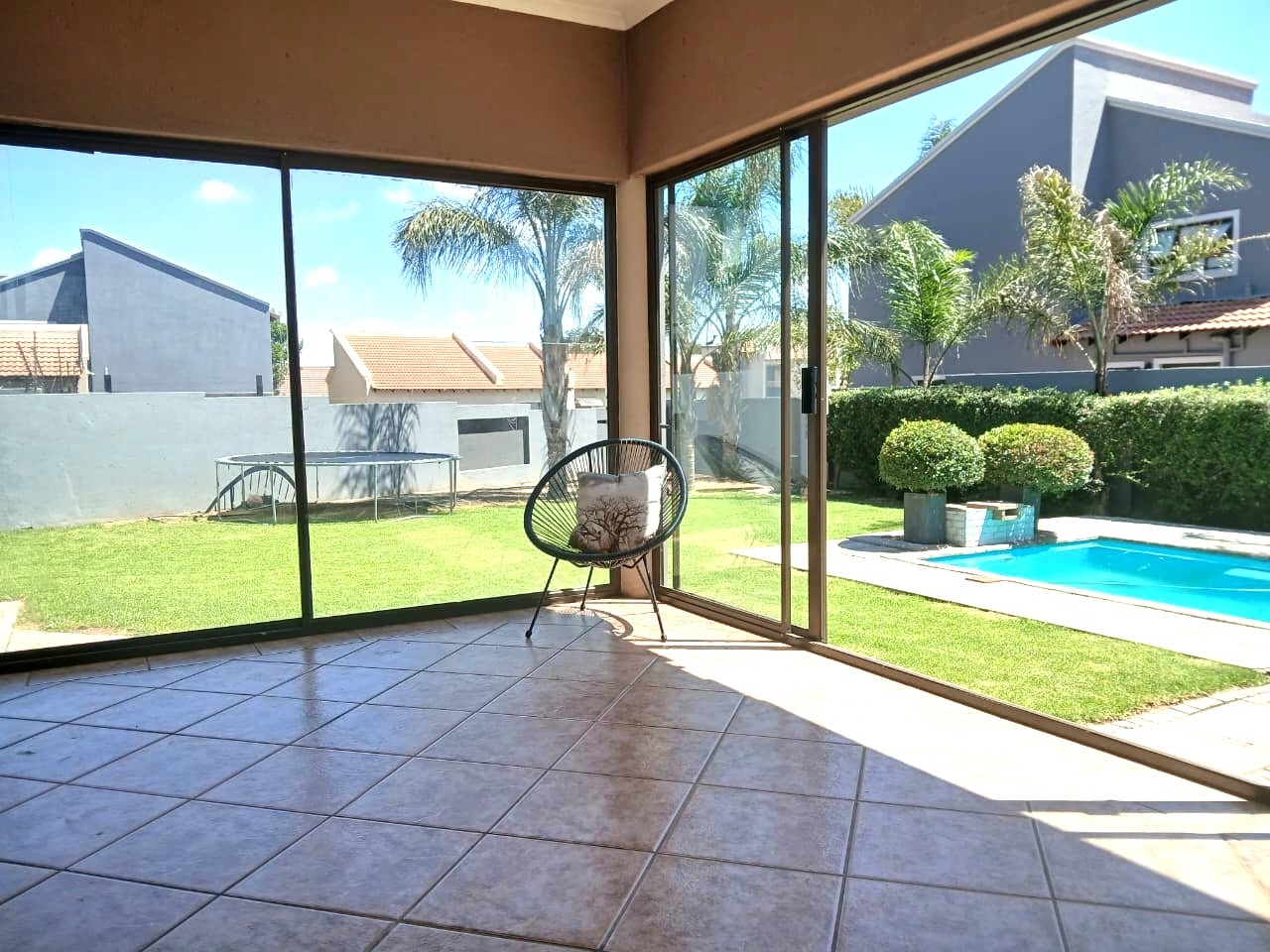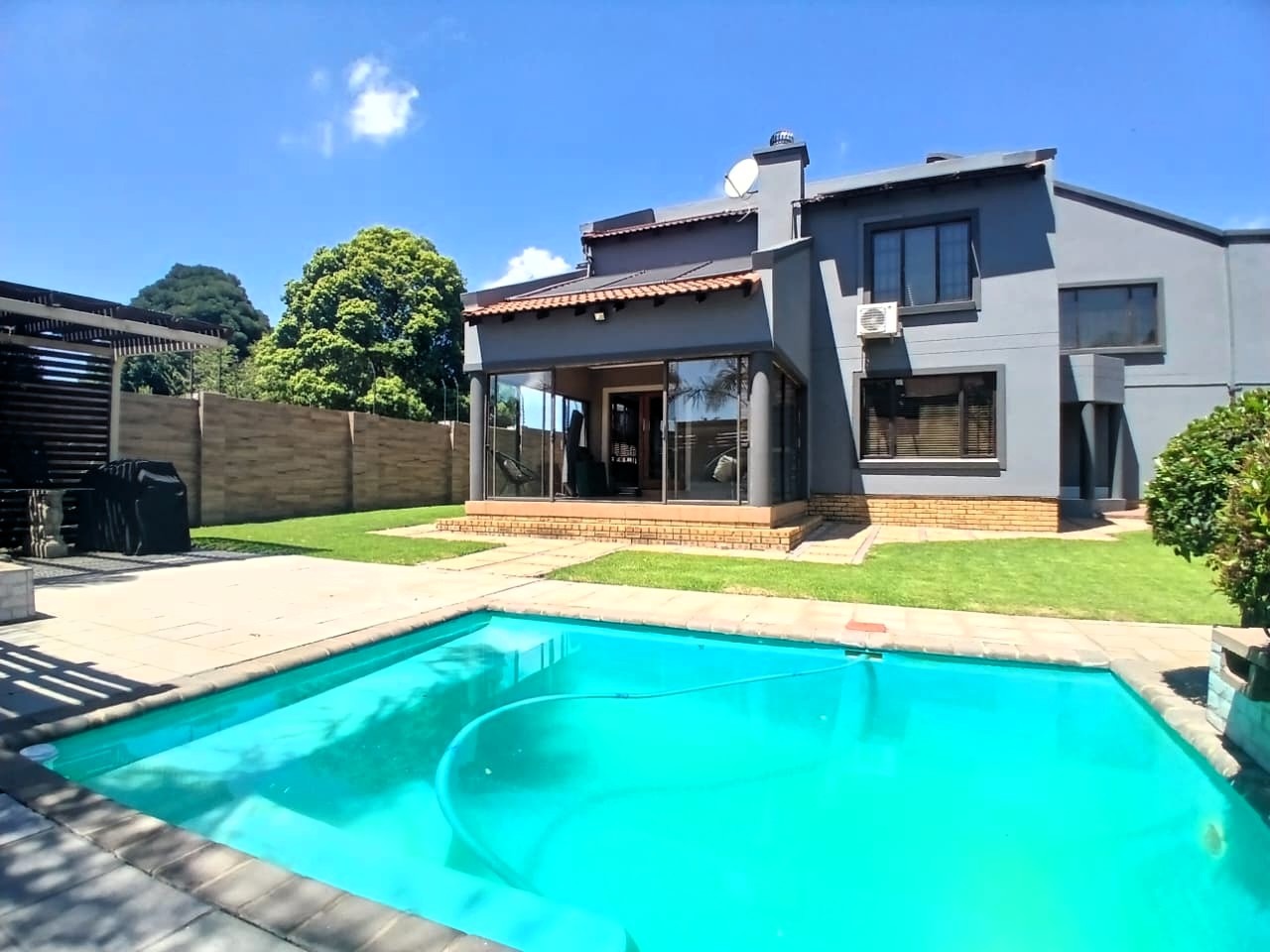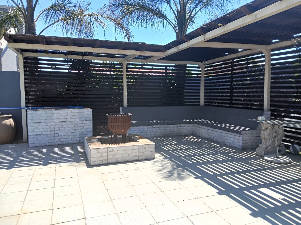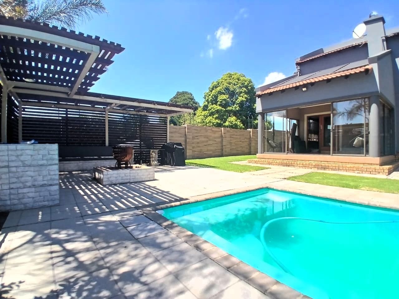 Step outside to a private oasis designed for relaxation and entertainment. The property includes a sparkling swimming pool, a well-maintained green lawn, and a covered outdoor entertainment area complete with built-in seating and a fire pit. A glass-enclosed patio, featuring a built-in braai, provides a versatile space for year-round enjoyment, offering seamless indoor-outdoor flow via large sliding glass doors. Practical amenities include air conditioning, a double garage for secure parking, and dedicated staff quarters.