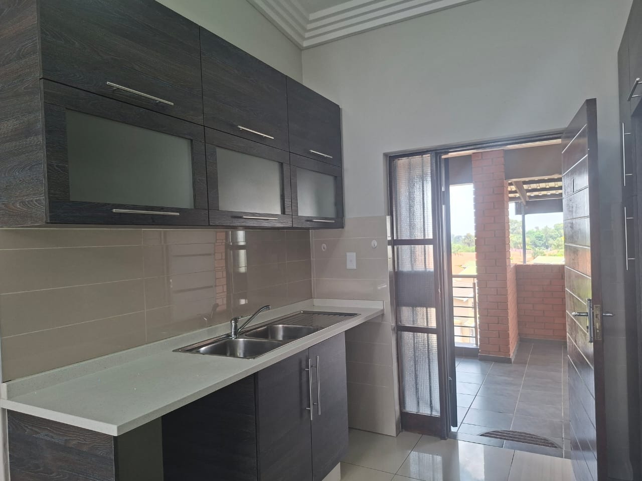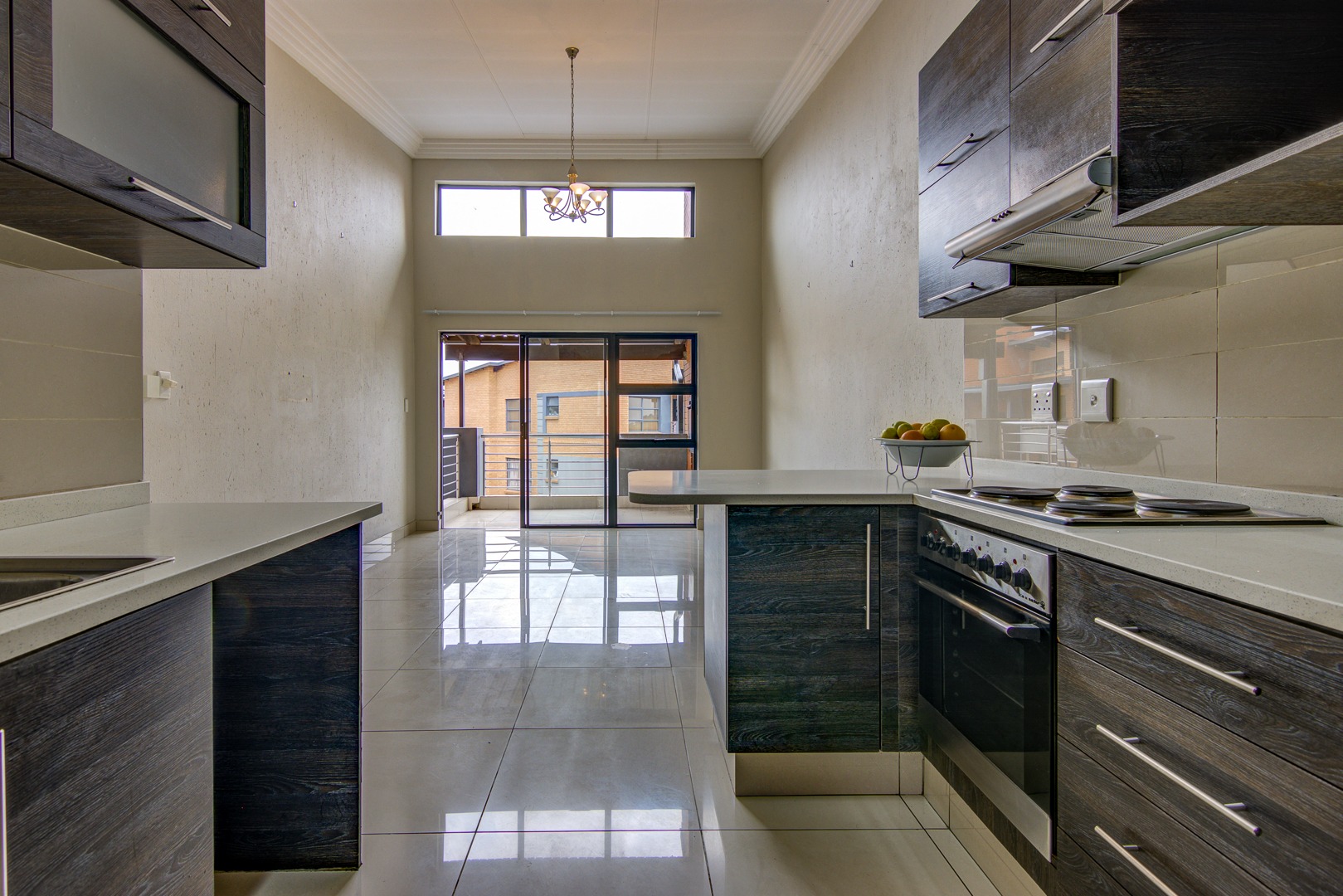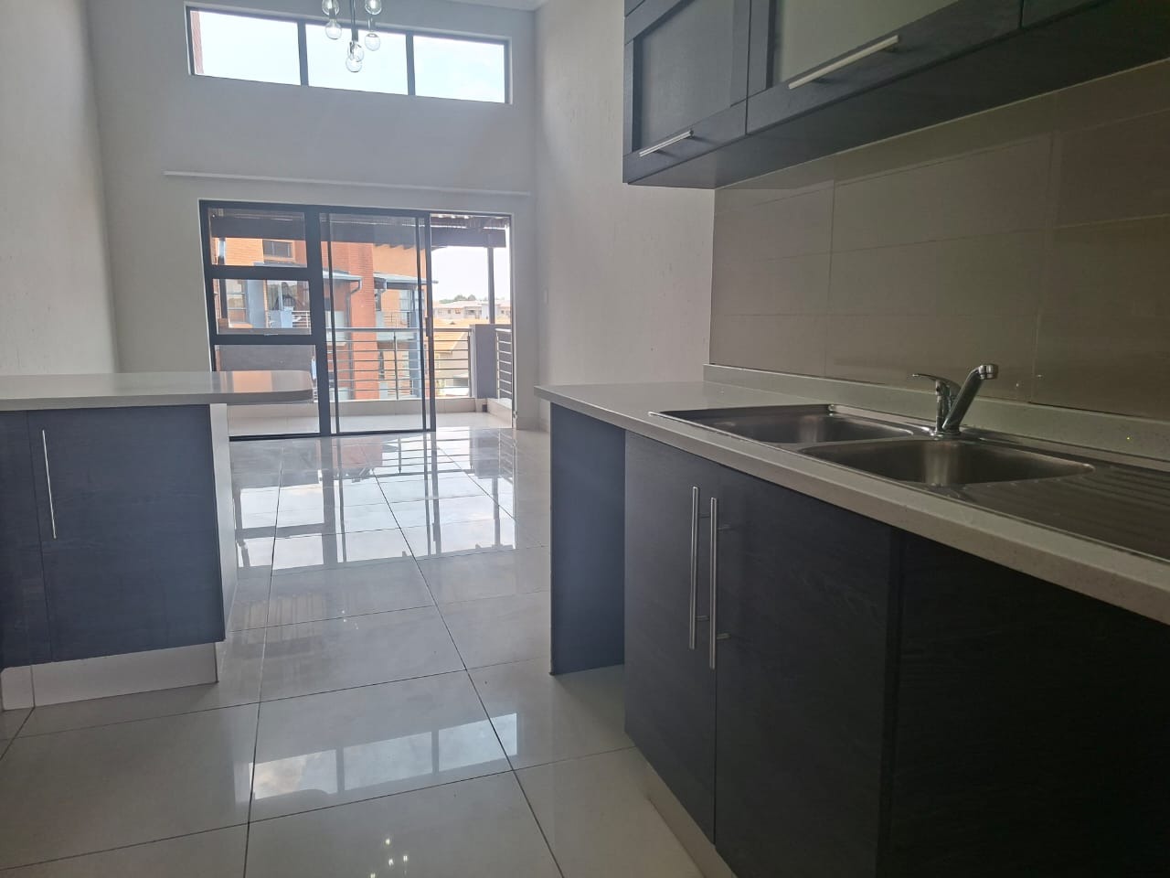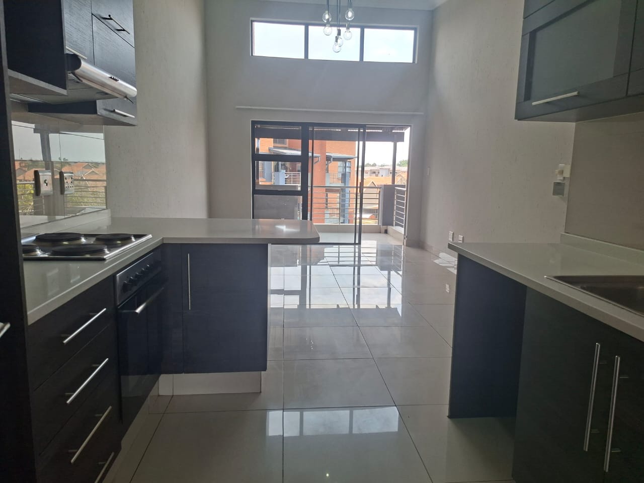 The modern kitchen features sleek dark-wrapped cabinets, elegant white granite countertops, and is open-plan to a spacious lounge and dining area. The high ceilings in the lounge create an airy, welcoming atmosphere, while glass sliding doors open onto a generous balcony with a built-in braai—perfect for entertaining while enjoying the stunning, unobstructed views.