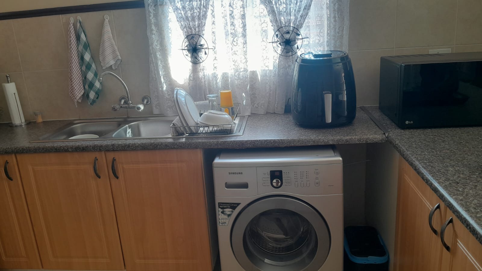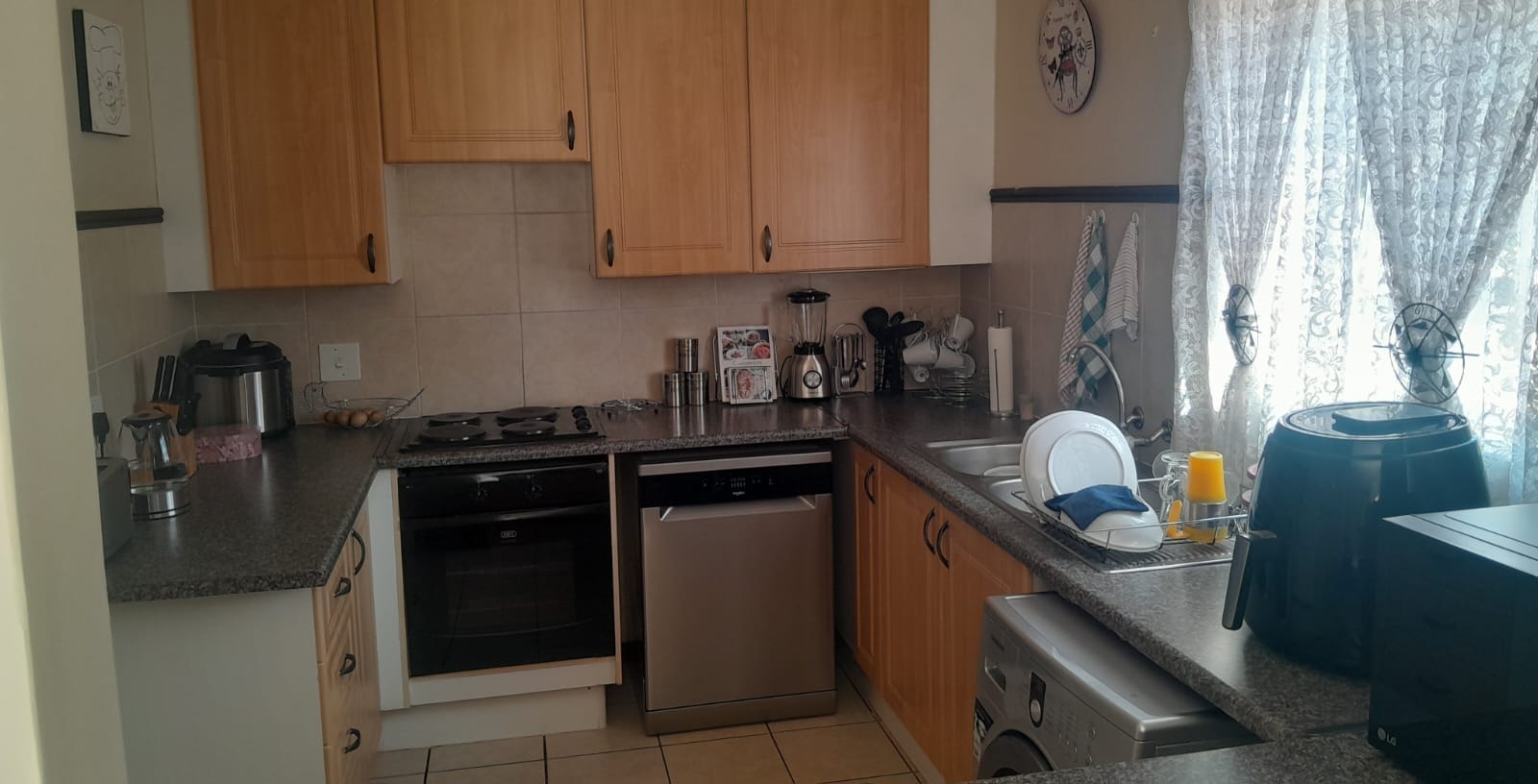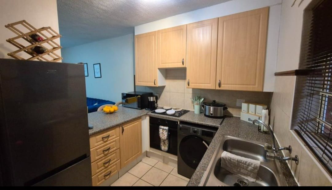 Discover this spacious 114 sqm apartment located in a secure complex in Die Hoewes, Centurion. This well-appointed unit features two bedrooms and two bathrooms, offering comfortable living. The functional kitchen is equipped with light wood cabinetry, granite-look countertops, and a tiled backsplash. It includes fitment for integrated appliances such as a built-in electric hob, oven, dishwasher, and an under-counter washing machine, complimented by a convenient double sink and a breakfast bar. The open-plan layout seamlessly connects the kitchen to the lounge area, creating an inviting space for relaxation and entertainment.