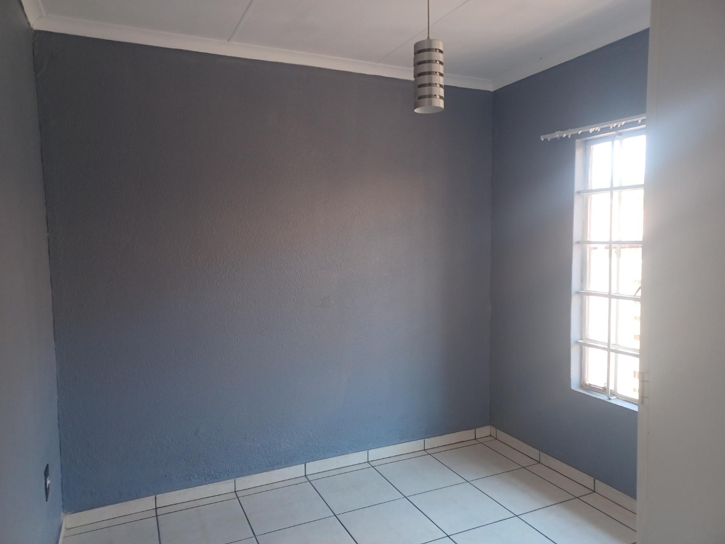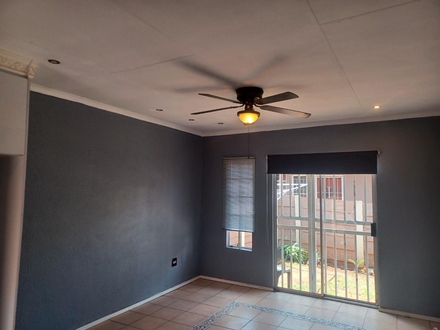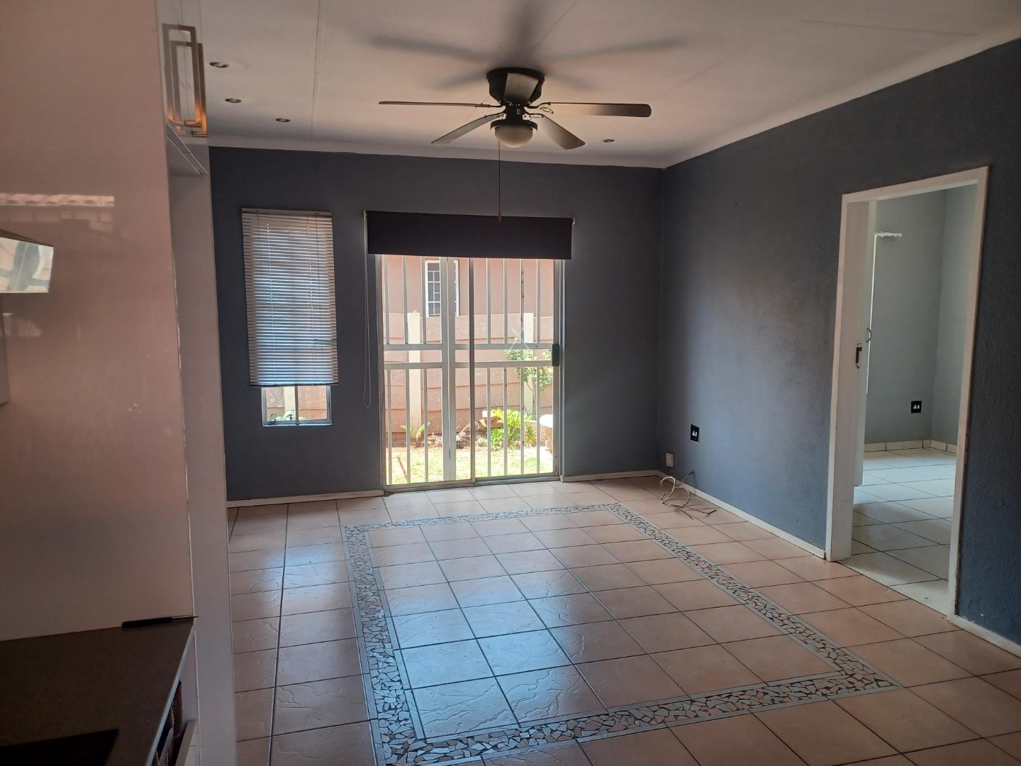 Spacious Lounge, tiled floor, sliding door to small, private garden.