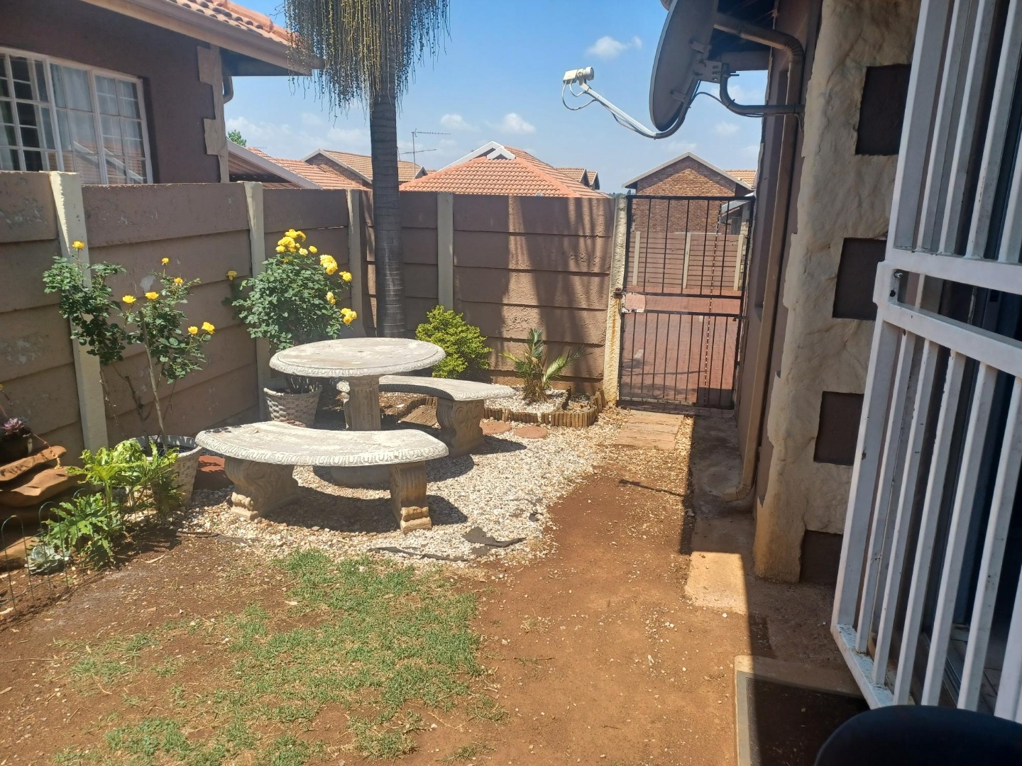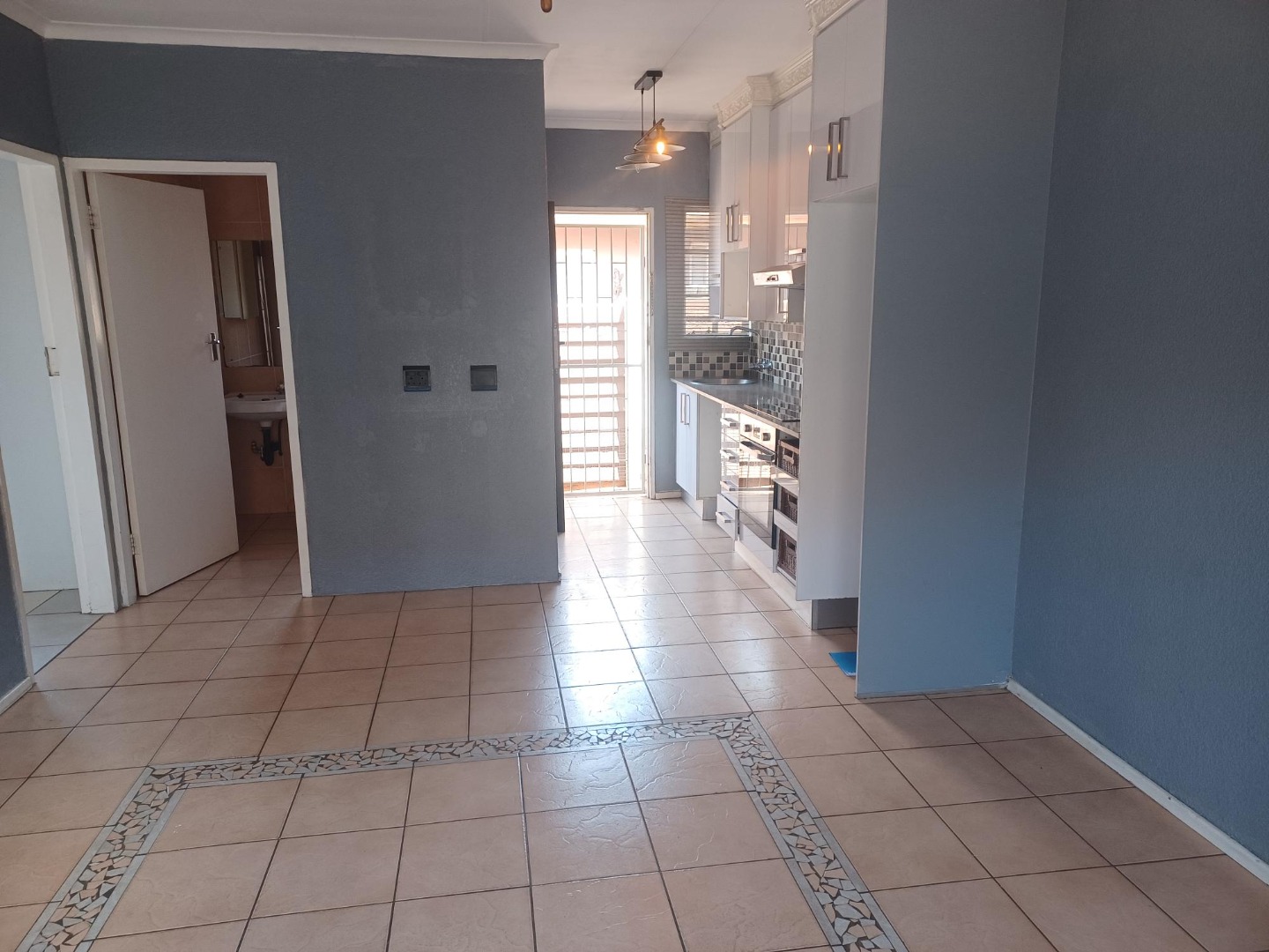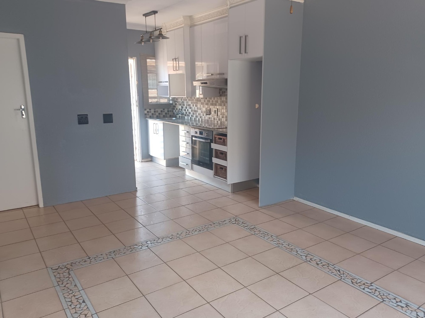 Spacious Lounge, tiled floor, sliding door to small, private garden.