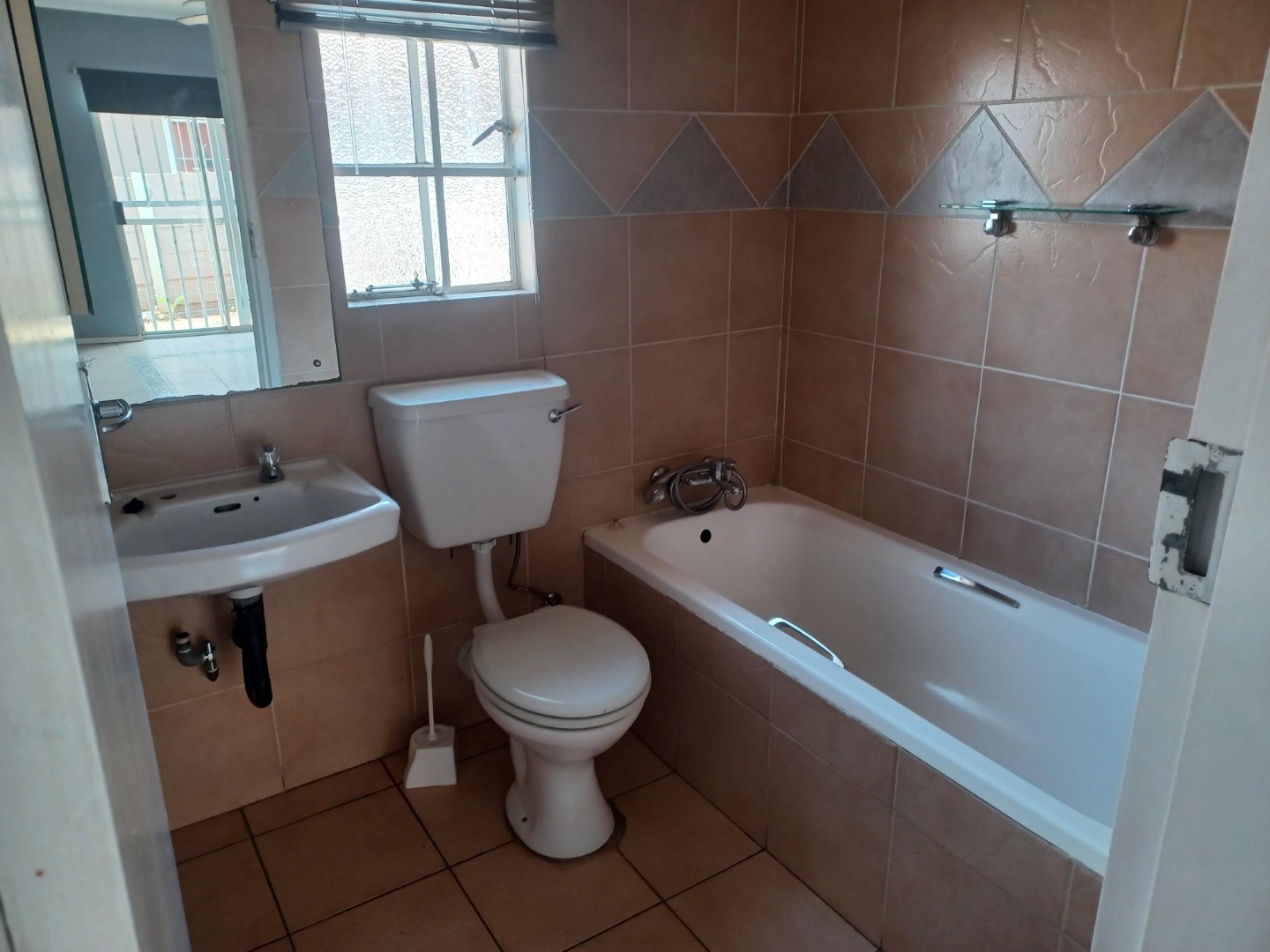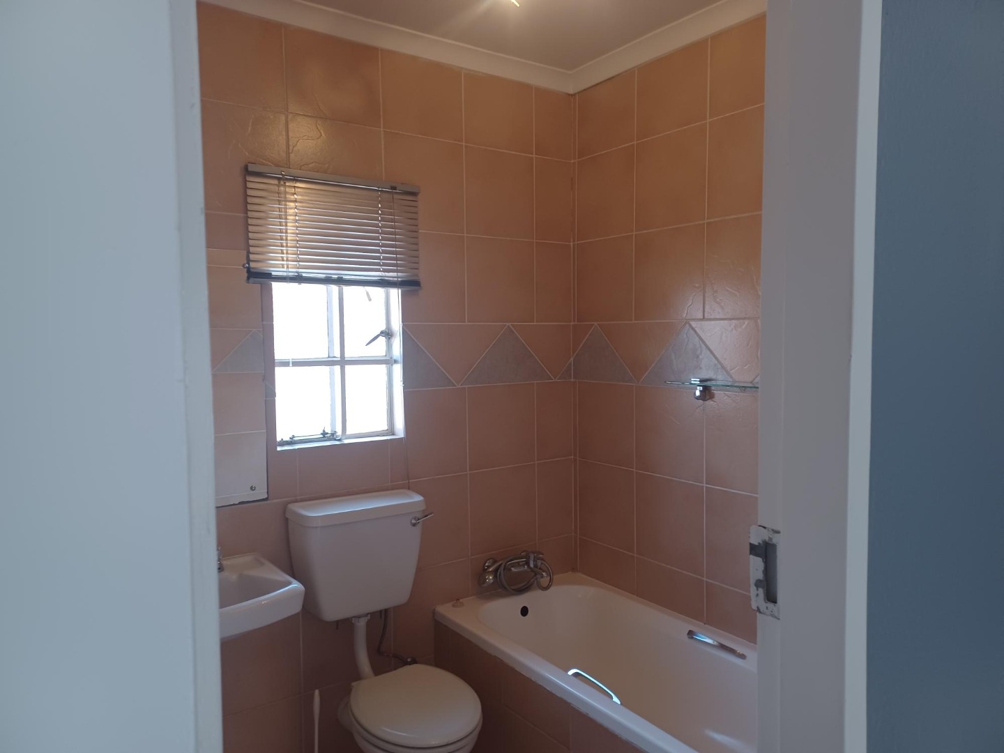 Second bathroom with bath, handbasin and toilet.