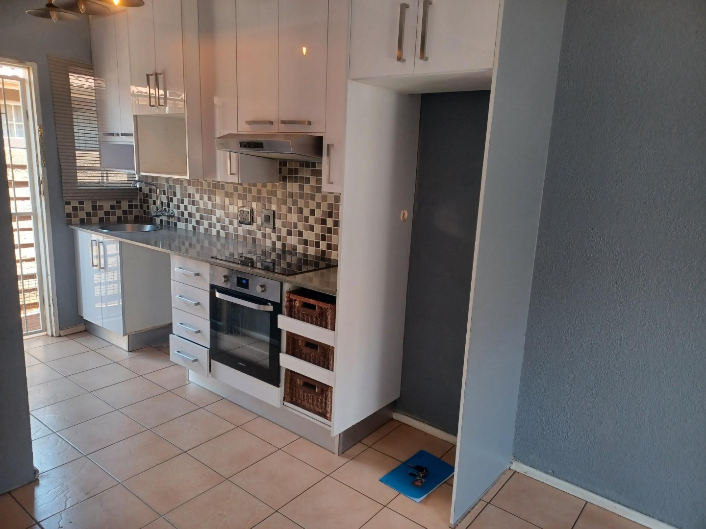Small, open plan kitchen with granite tops, space for washing machine.