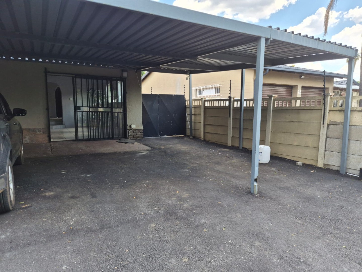 Security is a key feature, with the property located within a gated community. The main entrance is secured by a gate, and the perimeter benefits from electric fencing. Windows are fitted with security bars, providing peace of mind. A spacious carport offers covered parking for one vehicle.