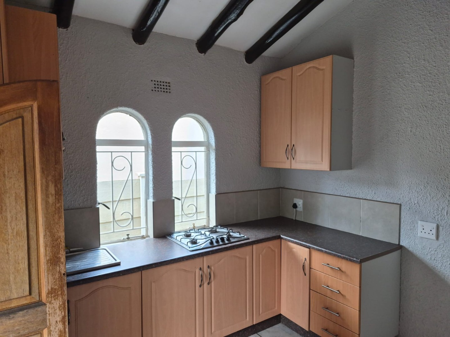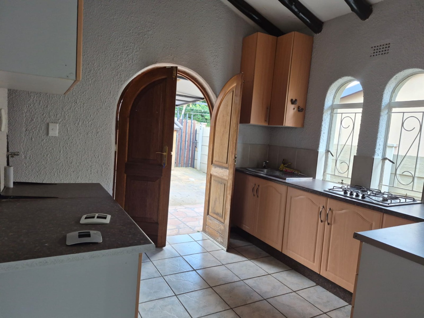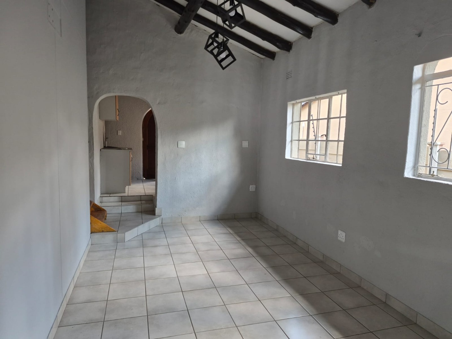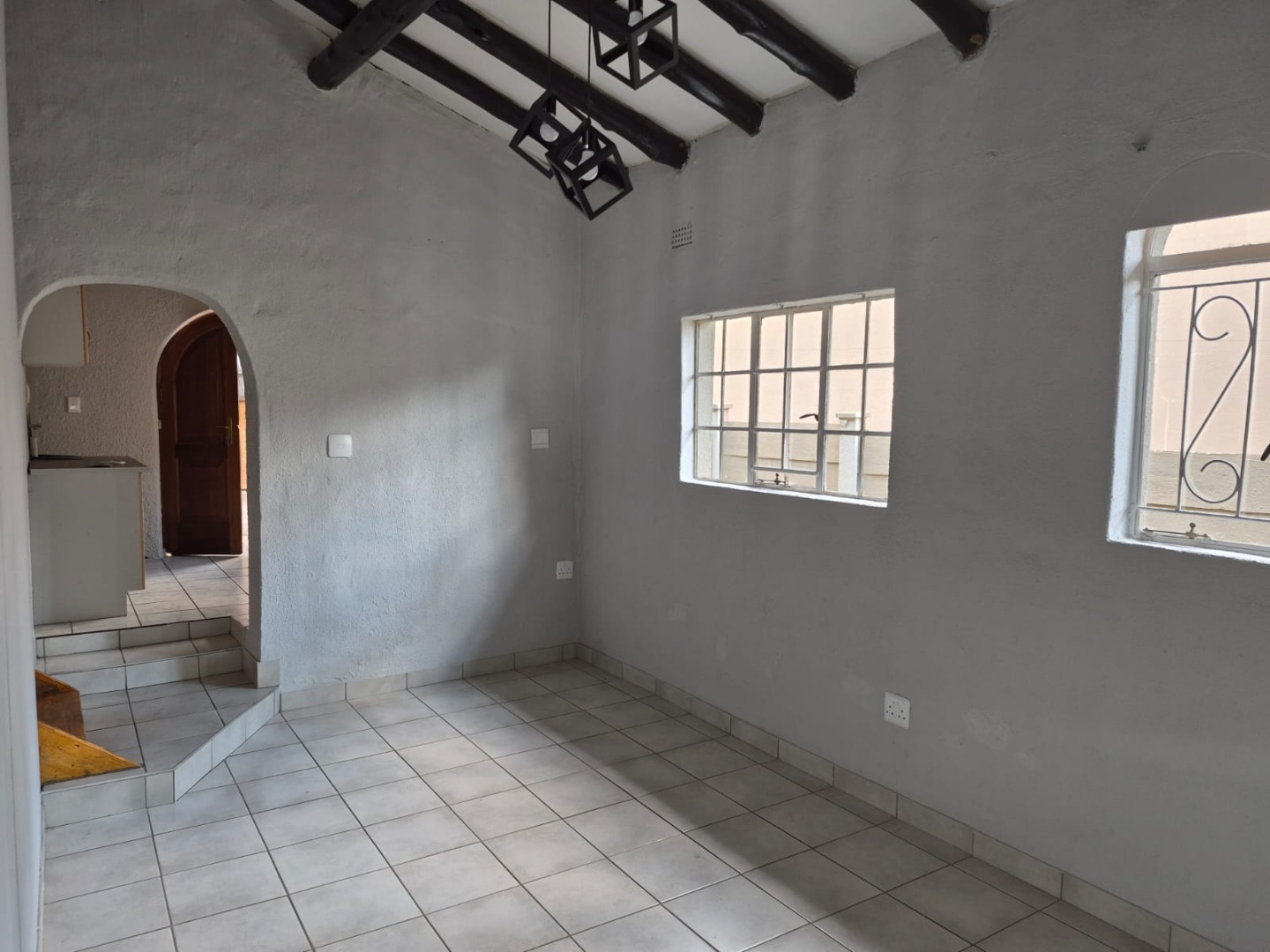 This inviting 2-bedroom, 1-bathroom rental in Glen Marais offers a practical layout designed for comfortable living. The interior boasts durable tiled flooring, complemented by exposed wooden ceiling beams and unique light fixtures that add character. The bright lounge area provides a clean canvas for personalisation, while the kitchen features an L-shaped design with light wood cabinetry, dark speckled countertops, and a built-in gas hob, all illuminated by charming arched windows.