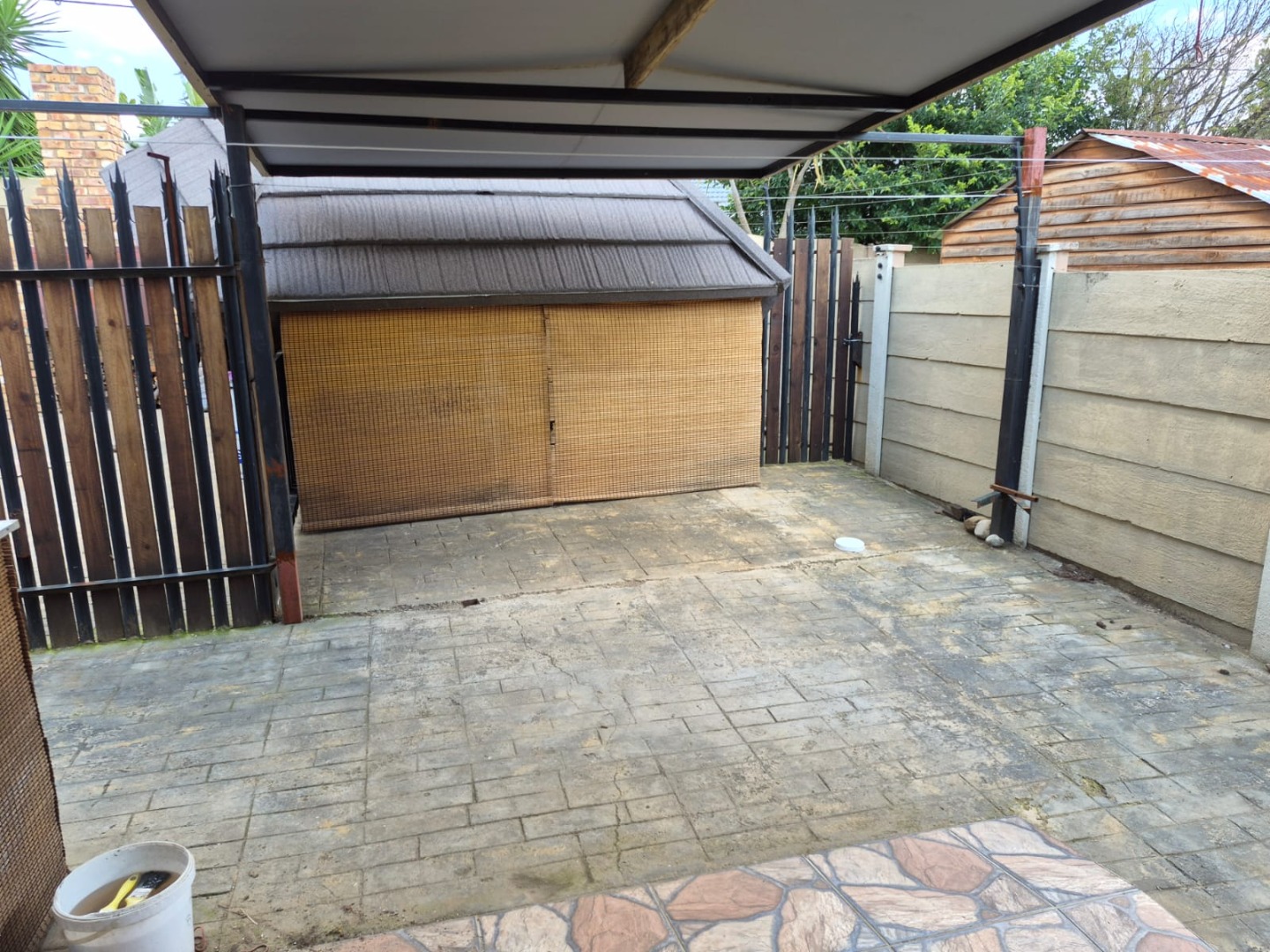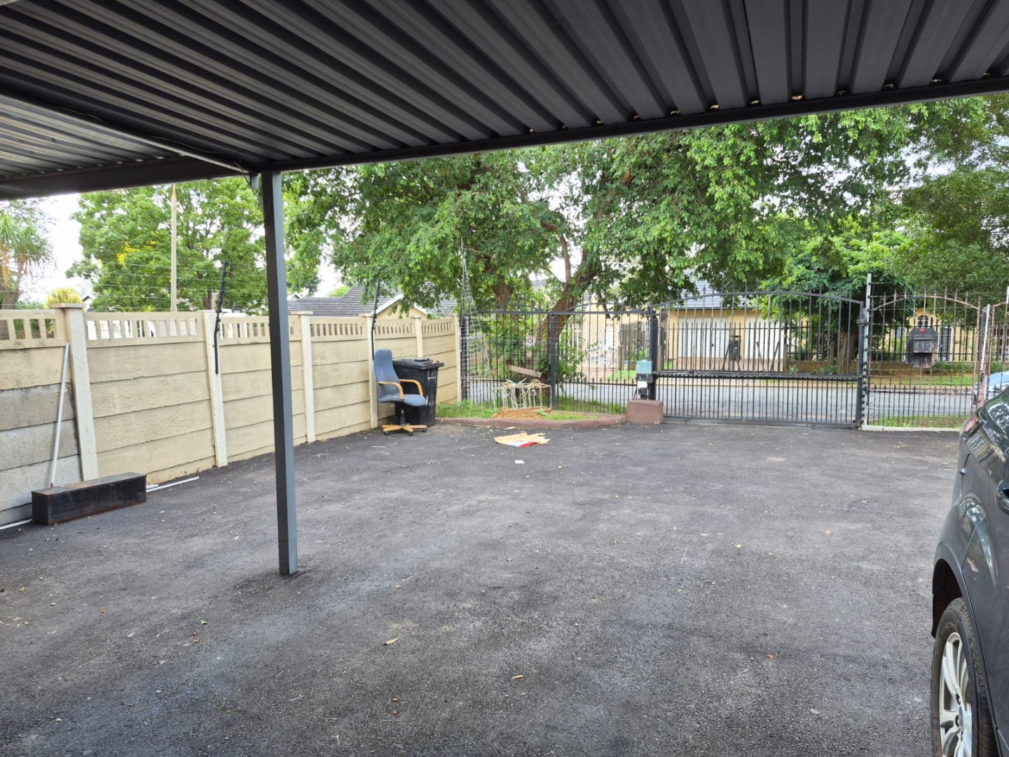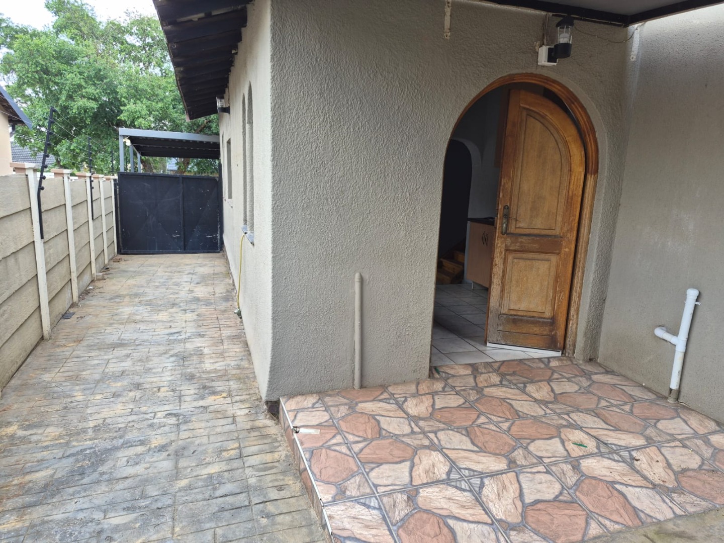 Security is a key feature, with the property located within a gated community. The main entrance is secured by a gate, and the perimeter benefits from electric fencing. Windows are fitted with security bars, providing peace of mind. A spacious carport offers covered parking for one vehicle.