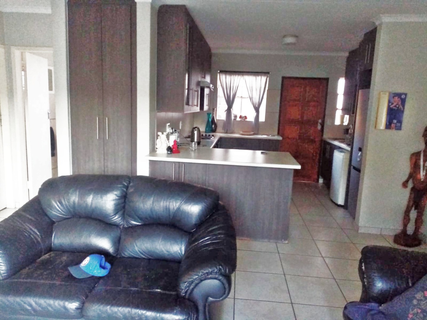 This inviting 2-bedroom, 1-bathroom rental property in Glen Marais offers a comfortable and modern living experience. The heart of the home is its open-plan living and kitchen area, designed for seamless interaction and abundant natural light. The contemporary kitchen boasts sleek dark cabinetry, ample light-coloured countertop space, a built-in four-plate hob, oven, and extractor fan, complemented by a practical tiled backsplash. A central kitchen island enhances functionality, making it ideal for both meal preparation and casual dining. The lounge area, featuring durable tiled flooring, benefits from large sliding doors that provide abundant natural light and direct access to a private outdoor space.