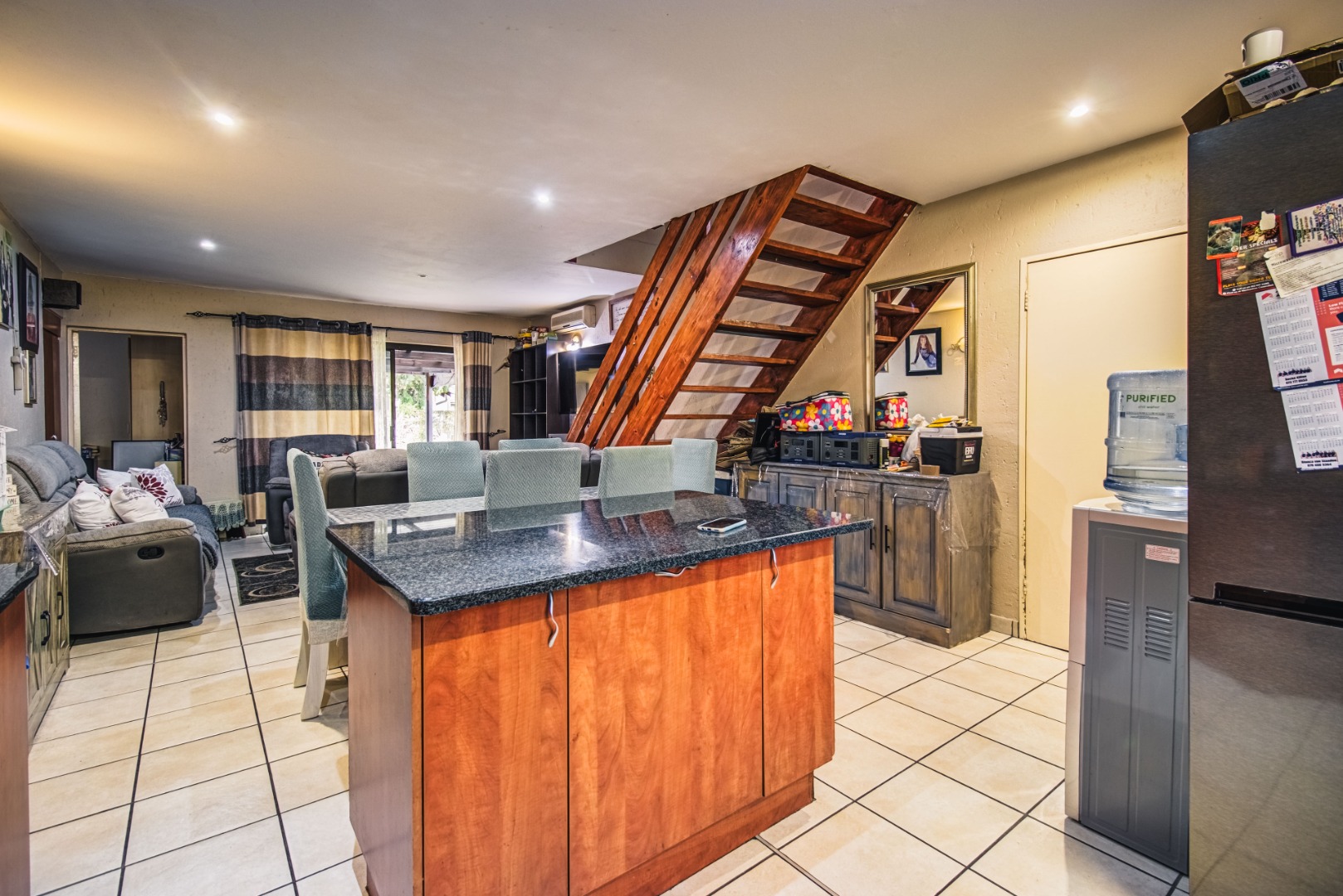 The versatile layout is ideal for families, those requiring work-from-home flexibility, or dual living options. Downstairs, an inviting open-plan lounge, dining area, and a modern kitchen create a seamless living space. The kitchen is well-appointed with built-in cupboards and a gas stove, catering to contemporary needs. The property boasts two distinct lounge areas, including a spacious second lounge or TV room located upstairs, providing ample room for relaxation and entertainment. Sliding doors enhance the open-plan feel and connect indoor and outdoor living.