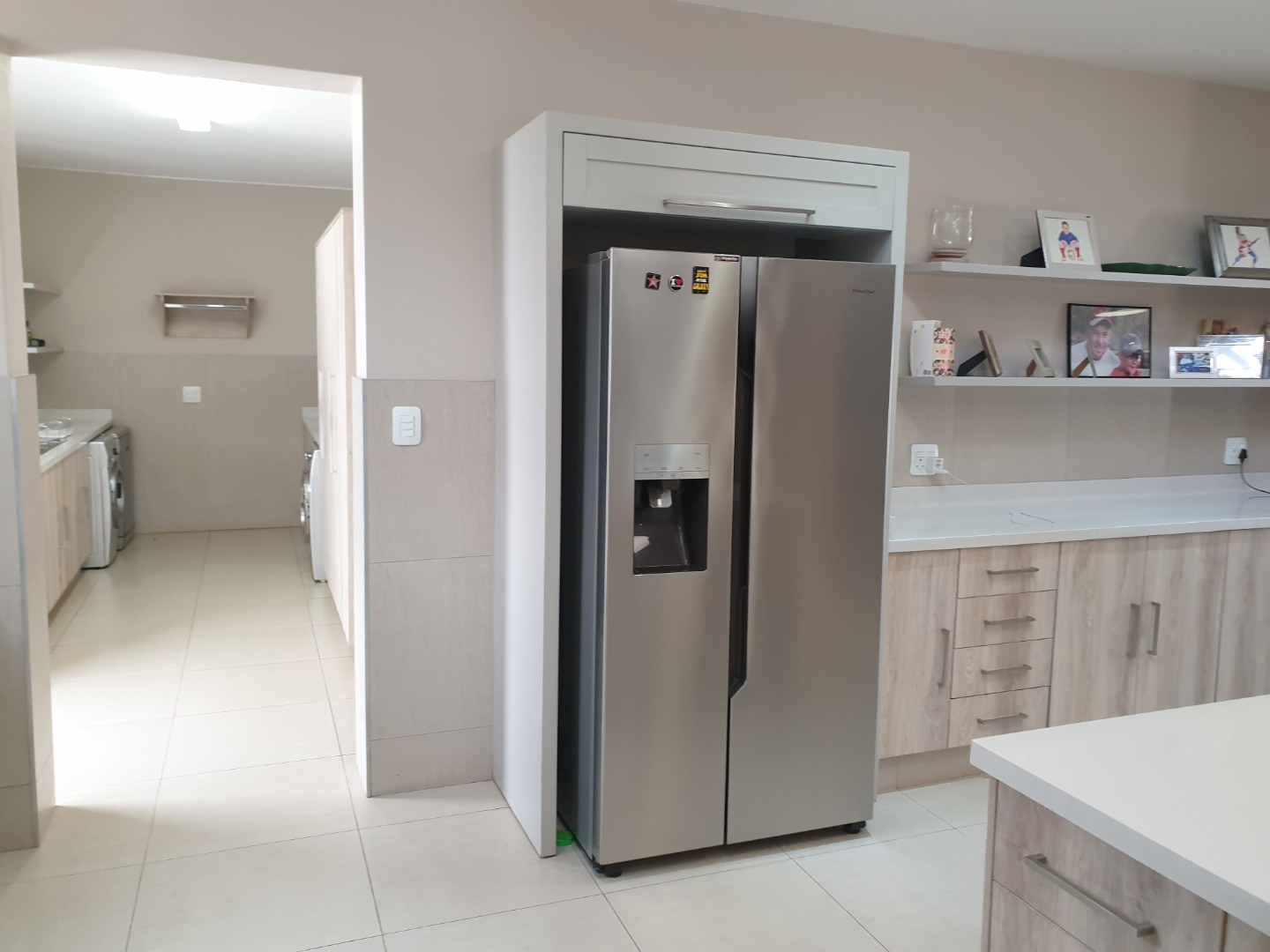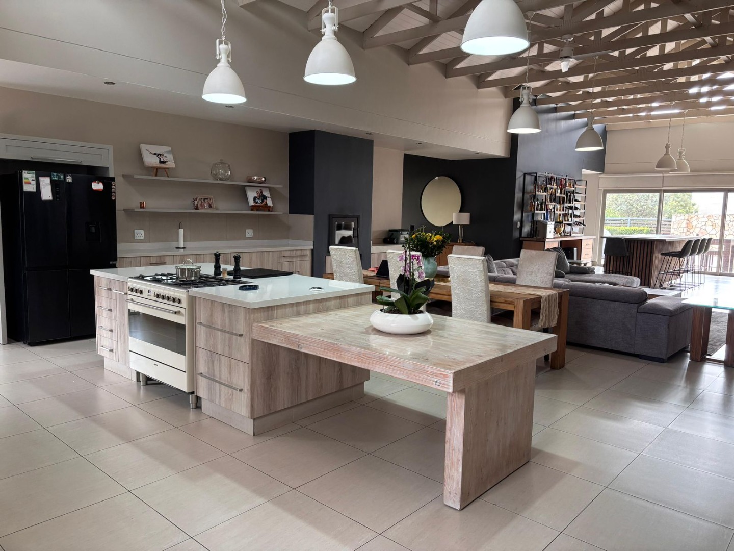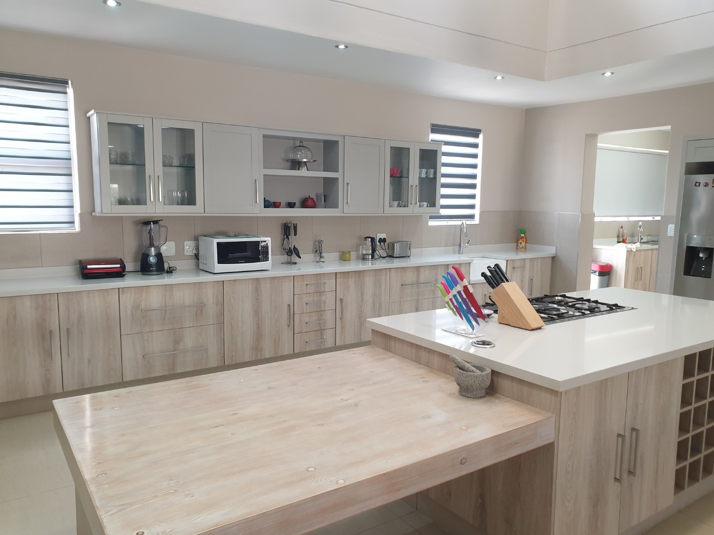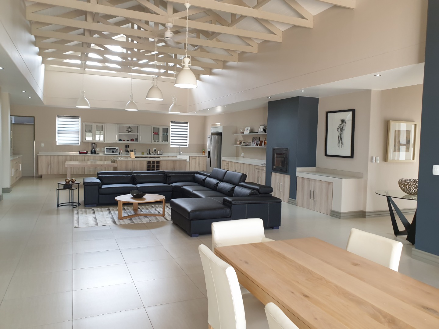This lovely 4-bedroom, 4-bathroom home in Serengeti Lifestyle Estate is ready for you to move in! You'll love the modern design with its clean lines and a super spacious open-plan layout that just feels so welcoming. Imagine cooking up a storm in the contemporary kitchen, complete with light wood-grain cabinetry, a big island with a gas hob, and plenty of counter space. Plus, there's a handy scullery and a dedicated pantry to keep everything neat and tidy. The high vaulted ceilings and exposed beams in the living area really open up the space, letting in loads of natural light, making it perfect for family time or entertaining friends.