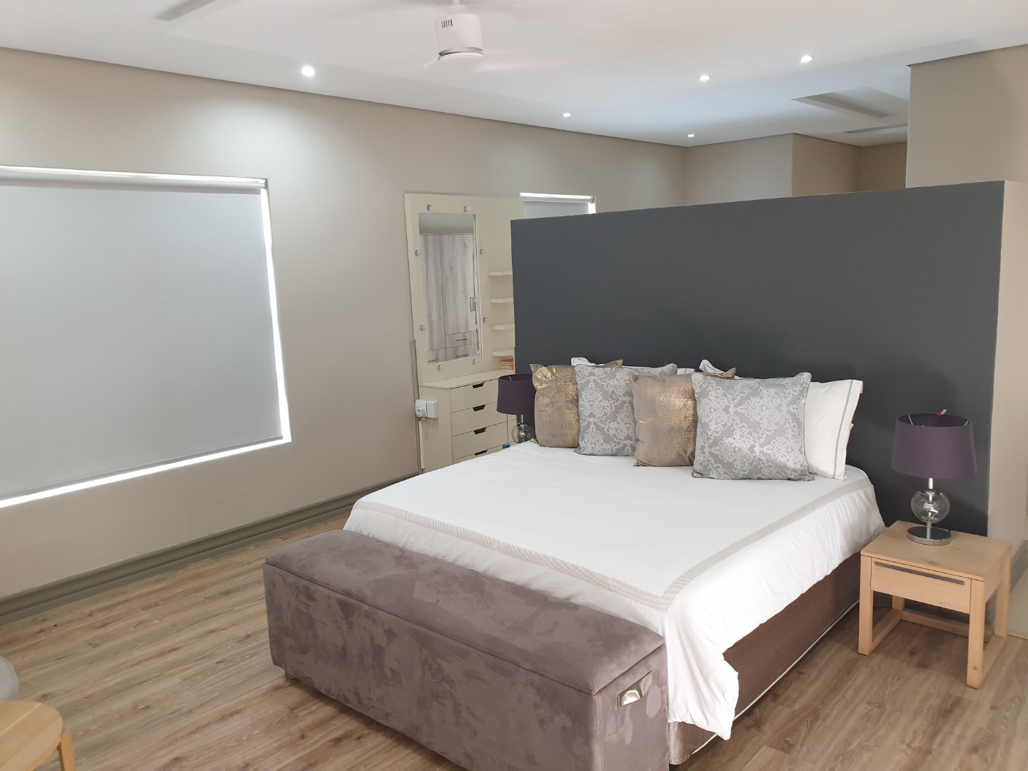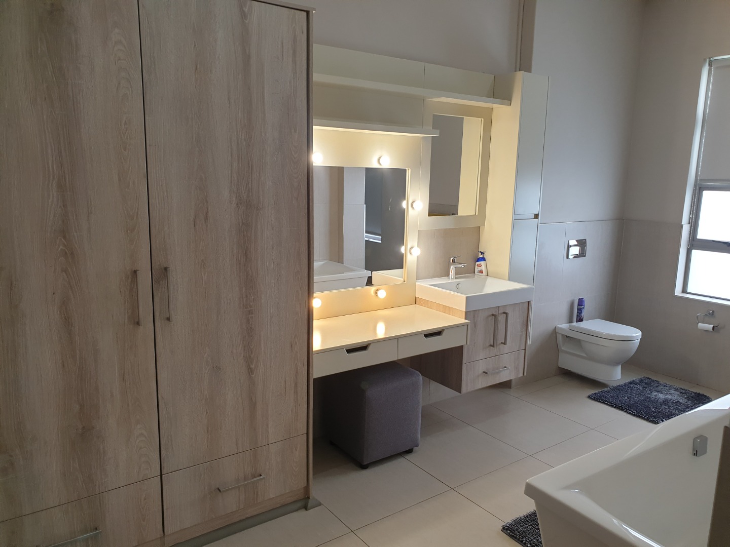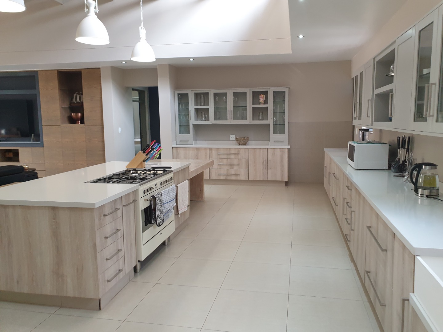 This lovely 4-bedroom, 4-bathroom home in Serengeti Lifestyle Estate is ready for you to move in! You'll love the modern design with its clean lines and a super spacious open-plan layout that just feels so welcoming. Imagine cooking up a storm in the contemporary kitchen, complete with light wood-grain cabinetry, a big island with a gas hob, and plenty of counter space. Plus, there's a handy scullery and a dedicated pantry to keep everything neat and tidy. The high vaulted ceilings and exposed beams in the living area really open up the space, letting in loads of natural light, making it perfect for family time or entertaining friends.