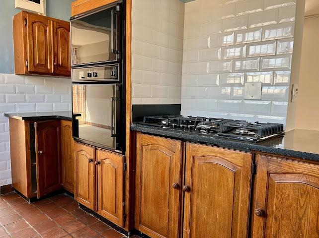 Living areas include 2 lounges – one with a cozy fireplace opening out to the garden – and a generous dining area. The kitchen is fitted with granite countertops, a gas hob, double eye-level oven, and a scullery with room for all appliances. A separate laundry and staff quarters add convenience to everyday living.