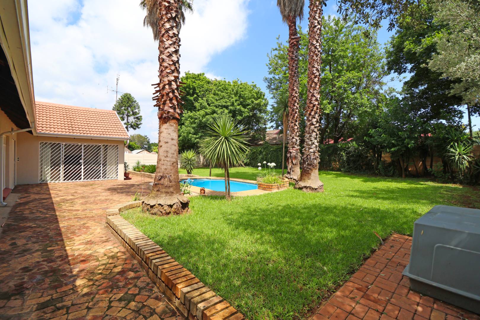 Step outside to a private oasis featuring a sparkling swimming pool, perfect for relaxation and recreation. The pool is surrounded by paving and set within a large, manicured green lawn, complemented by mature palm trees and a private hedge, creating an ideal setting for outdoor gatherings. A patio area extends the living space outdoors.