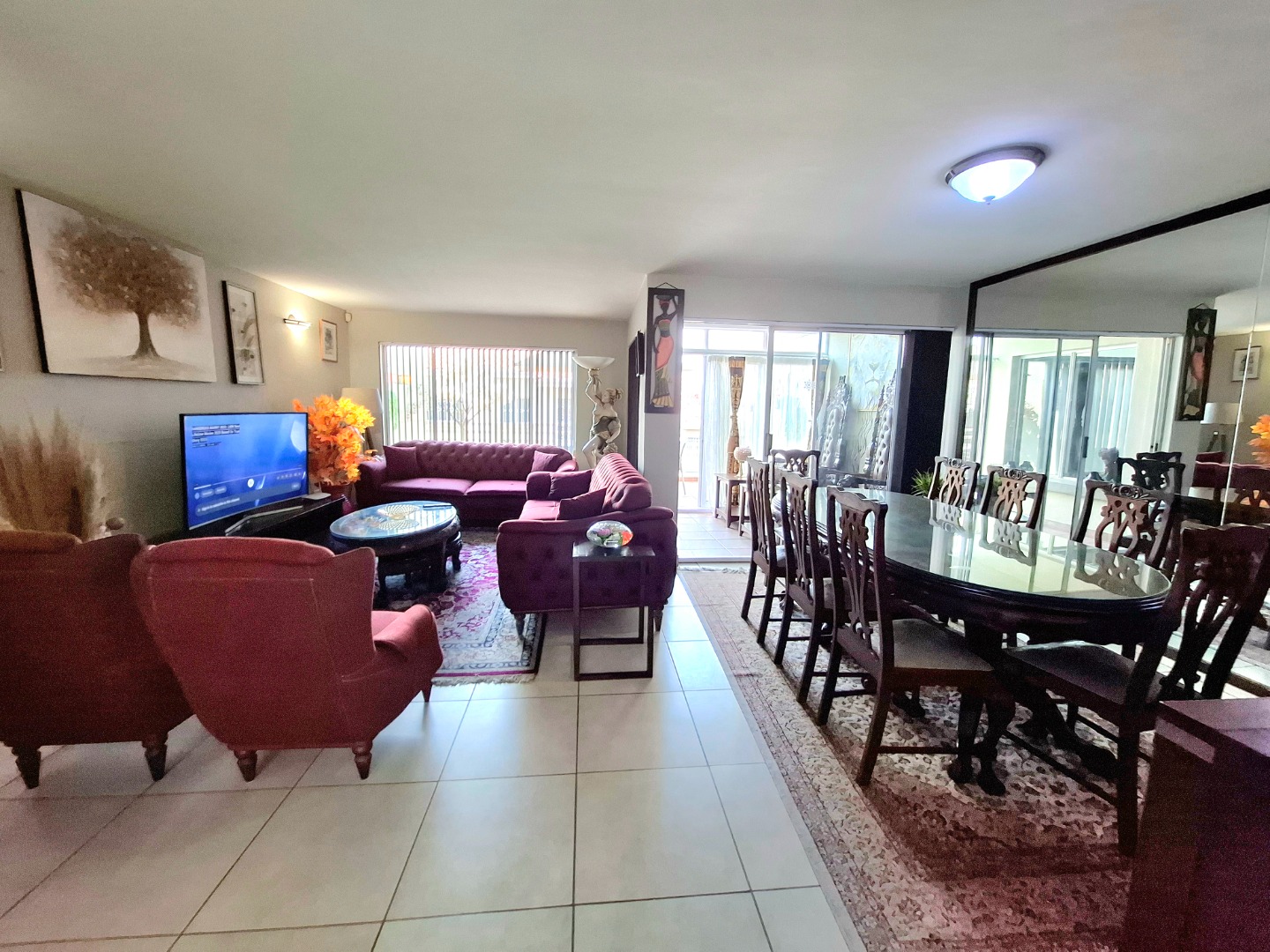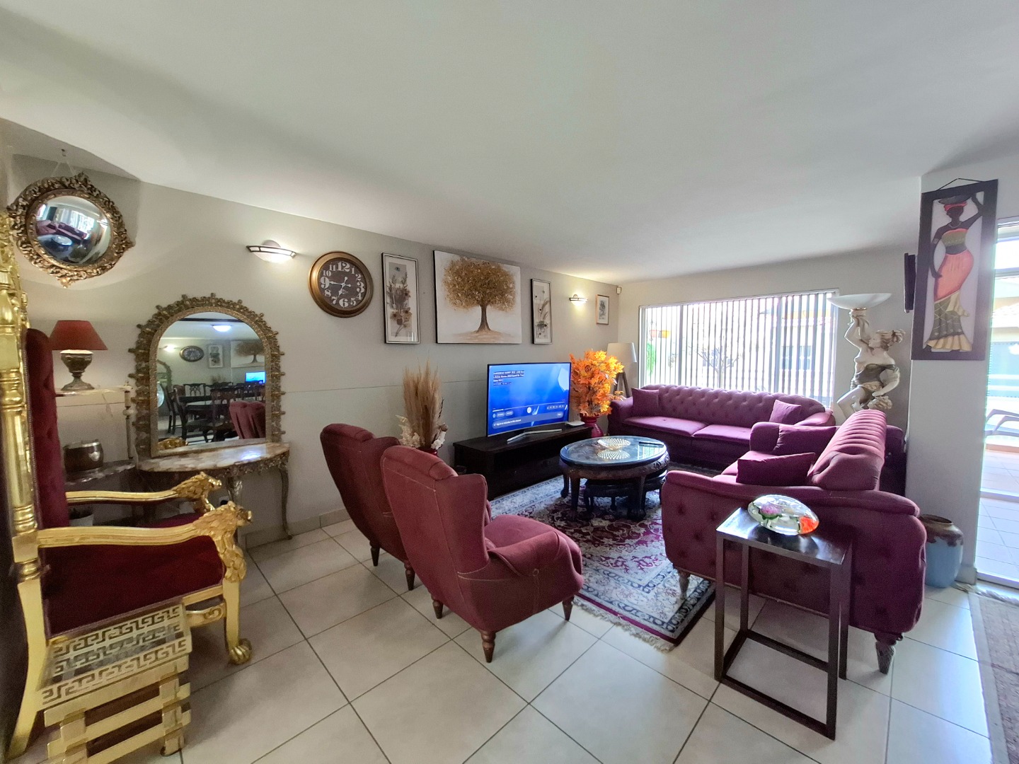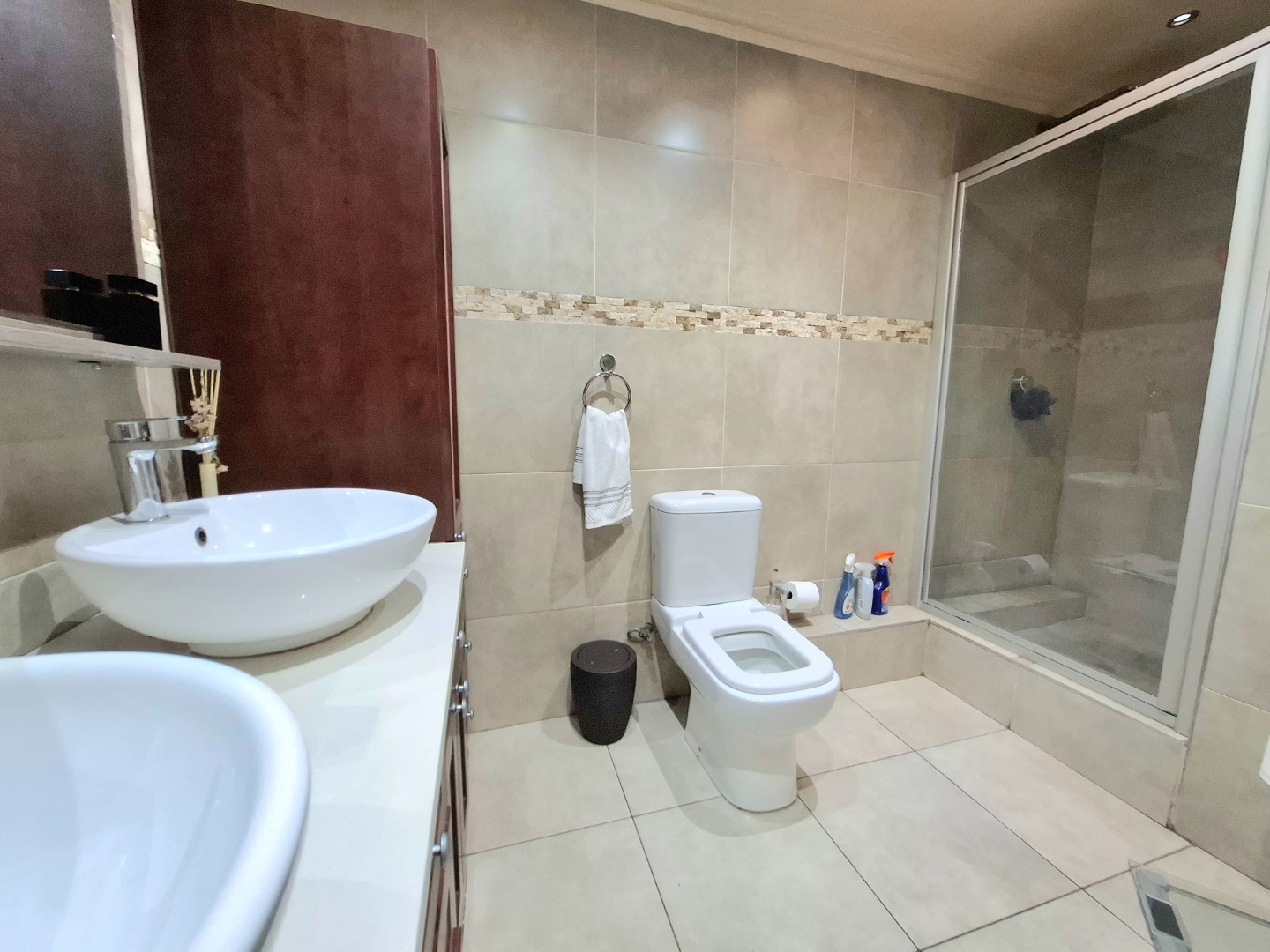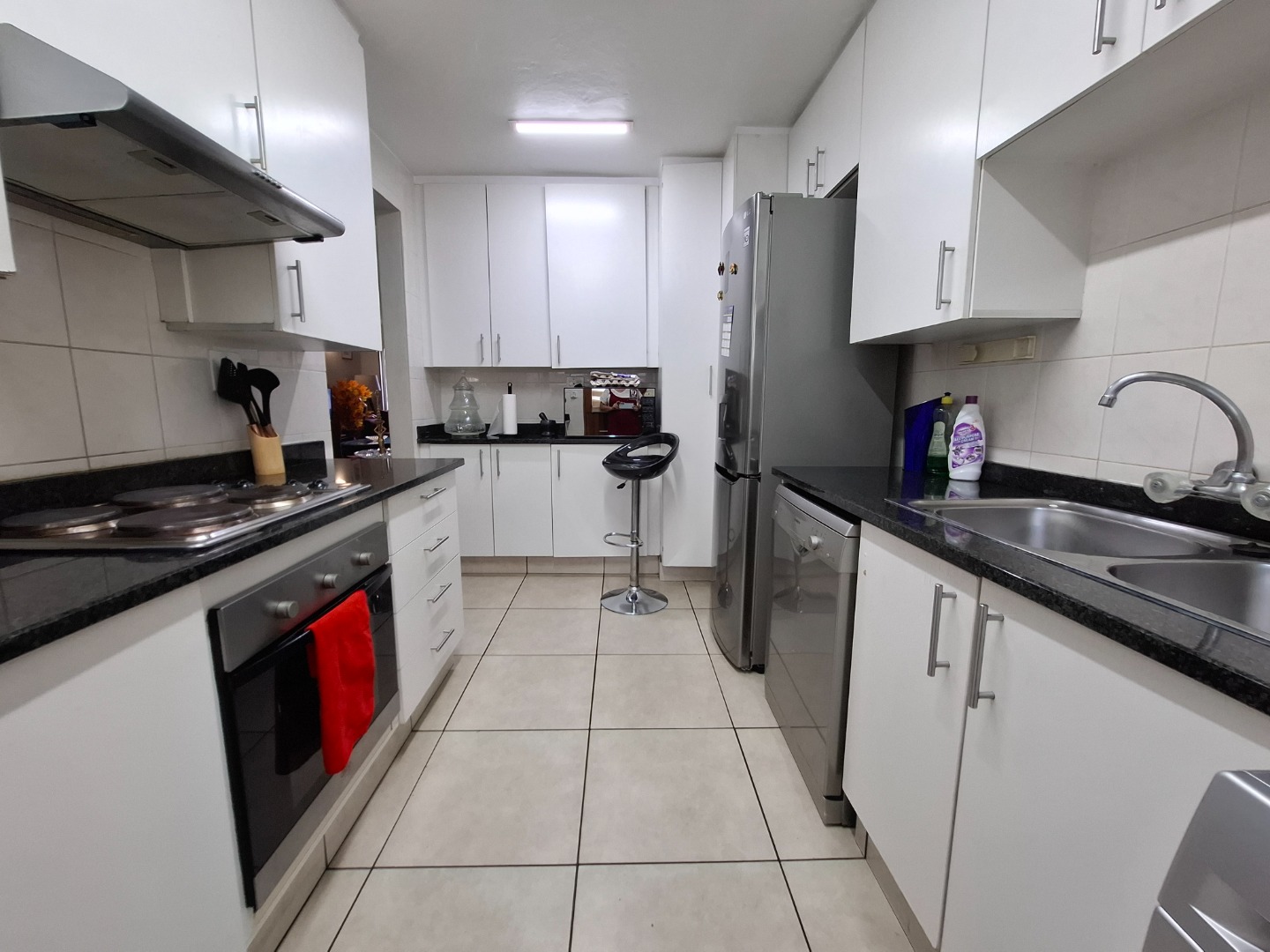 The property comprises three well proportioned bedrooms and 2.5 bathrooms, including a private en-suite, a family bathroom, and a guest toilet, all fully tiled for ease of maintenance. Additional versatile spaces include a dedicated study and a family TV room. Outdoor amenities feature a single garage and three additional parking spaces. Residents benefit from living within a secure complex, complete with 24-hour security and an access gate. Fibre connectivity and a battery inverter underscore modern convenience and uninterrupted living.