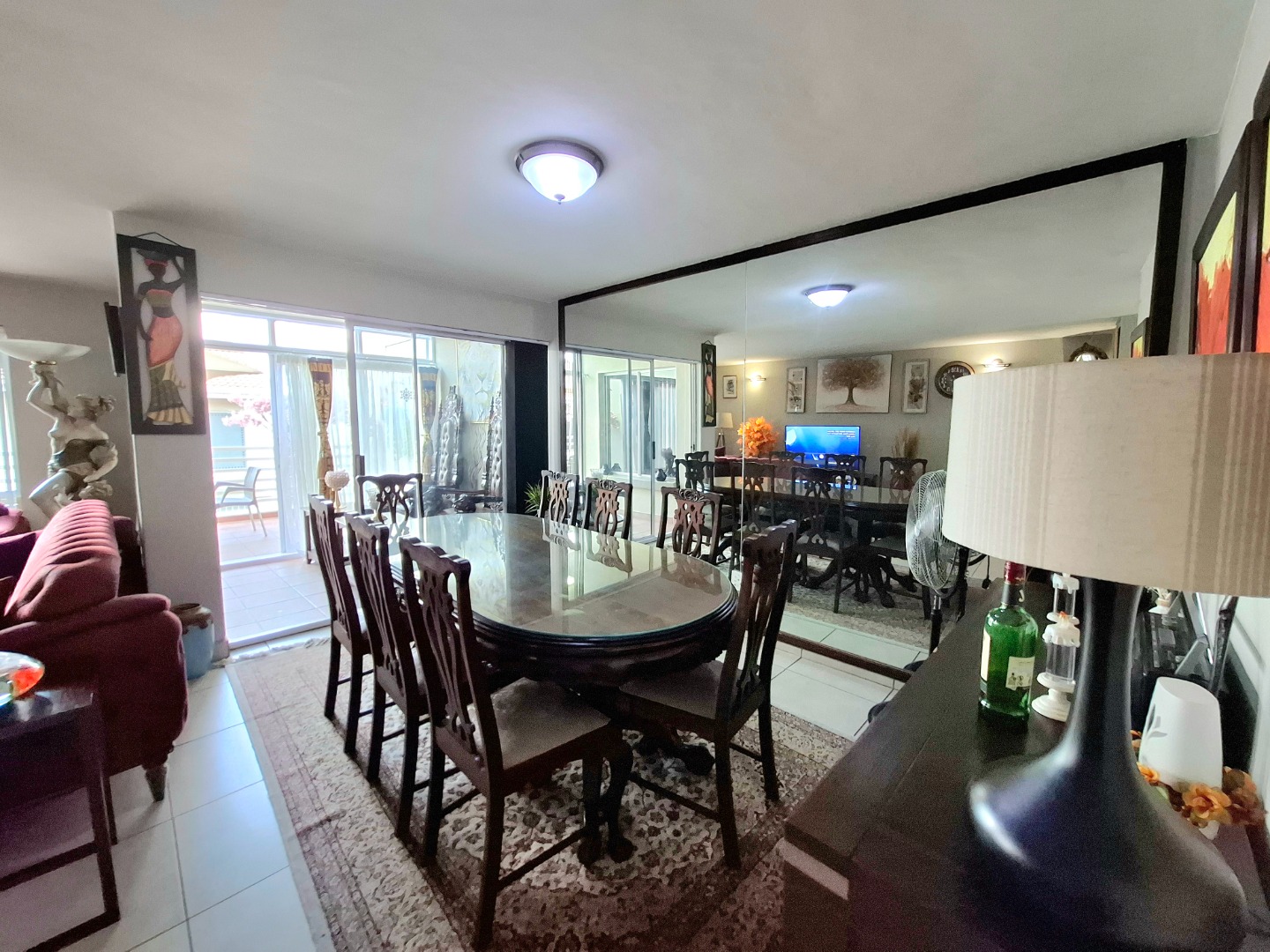 Upon entry, the residence unfolds into a spacious open-plan living and dining area, characterized by bright tiled flooring and generous natural light from large windows and sliding doors. A prominent mirrored wall in the dining area amplifies the sense of space. The adjacent modern kitchen is efficiently designed with white cabinetry, durable black granite countertops, and is fully equipped with stainless steel appliances, including a refrigerator, dishwasher, washing machine, built-in oven, gas hob, and extractor fan.