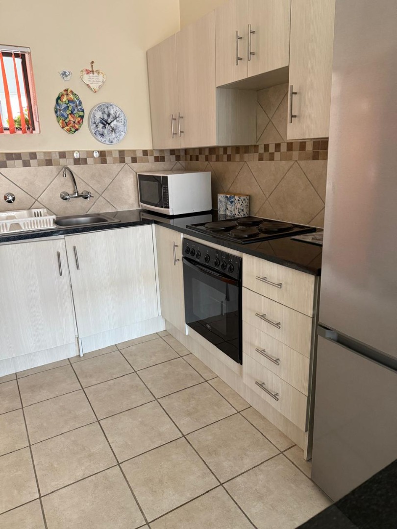The well-designed kitchen features ample cupboards and a convenient breakfast counter, making everyday living both practical and enjoyable.