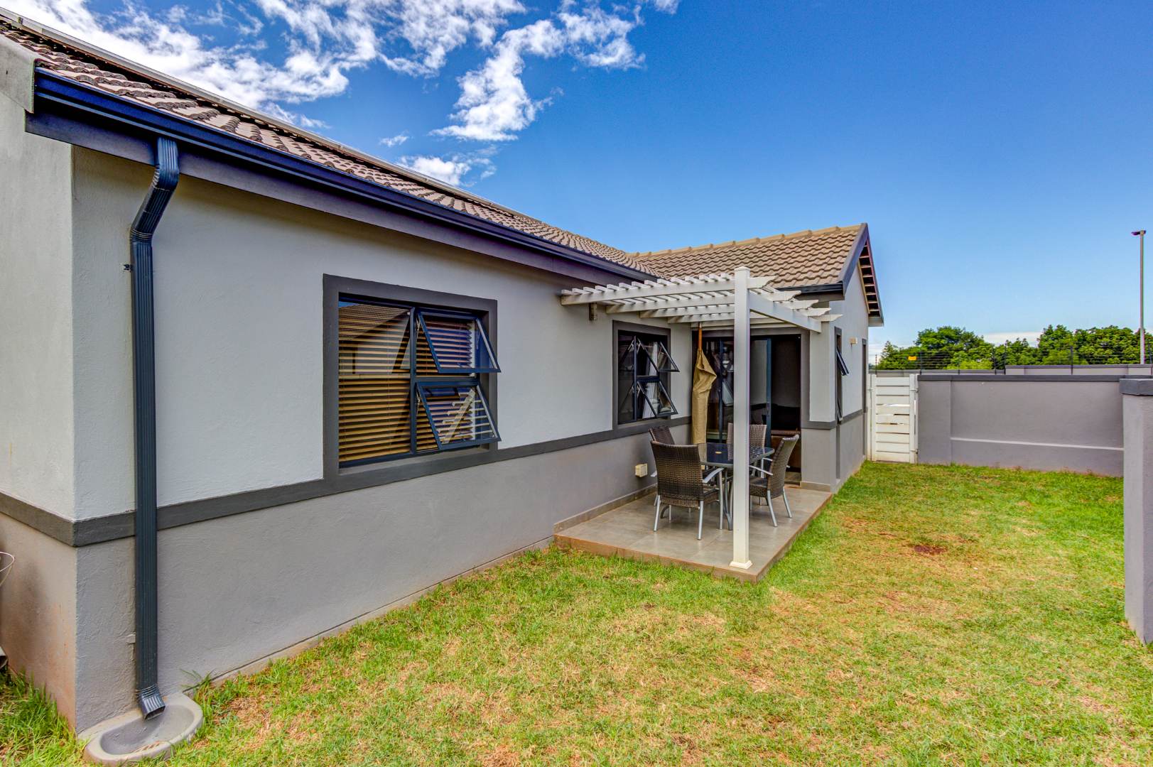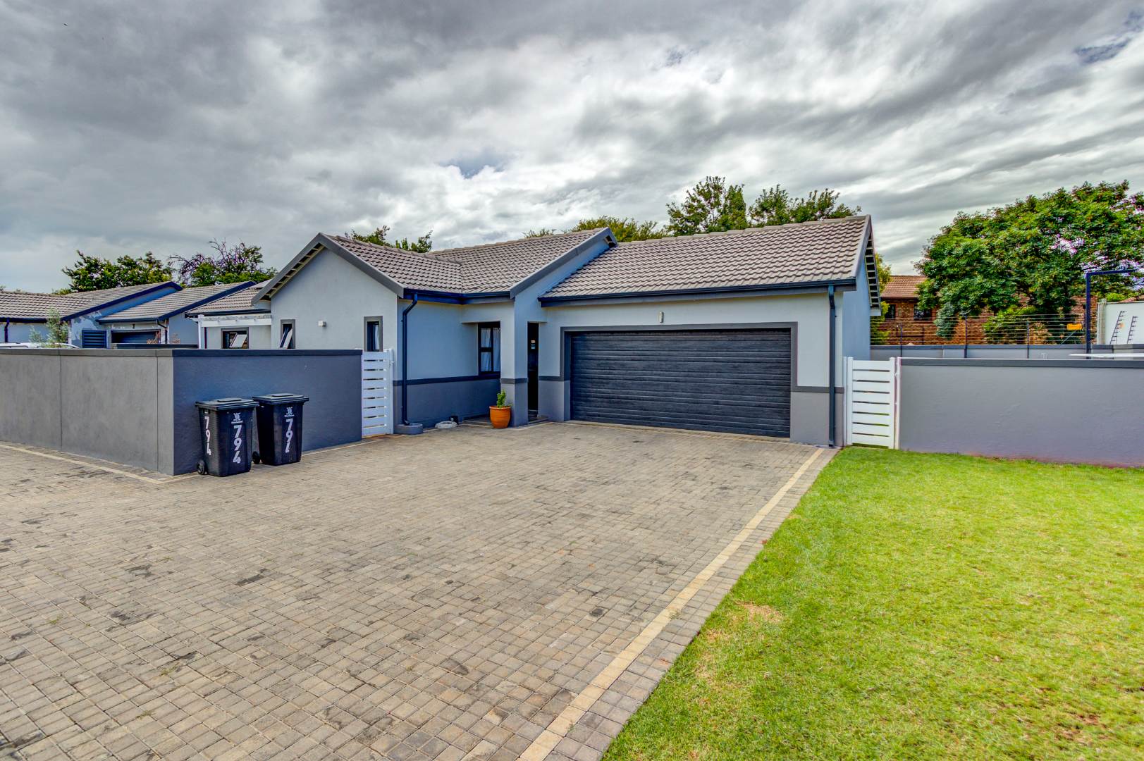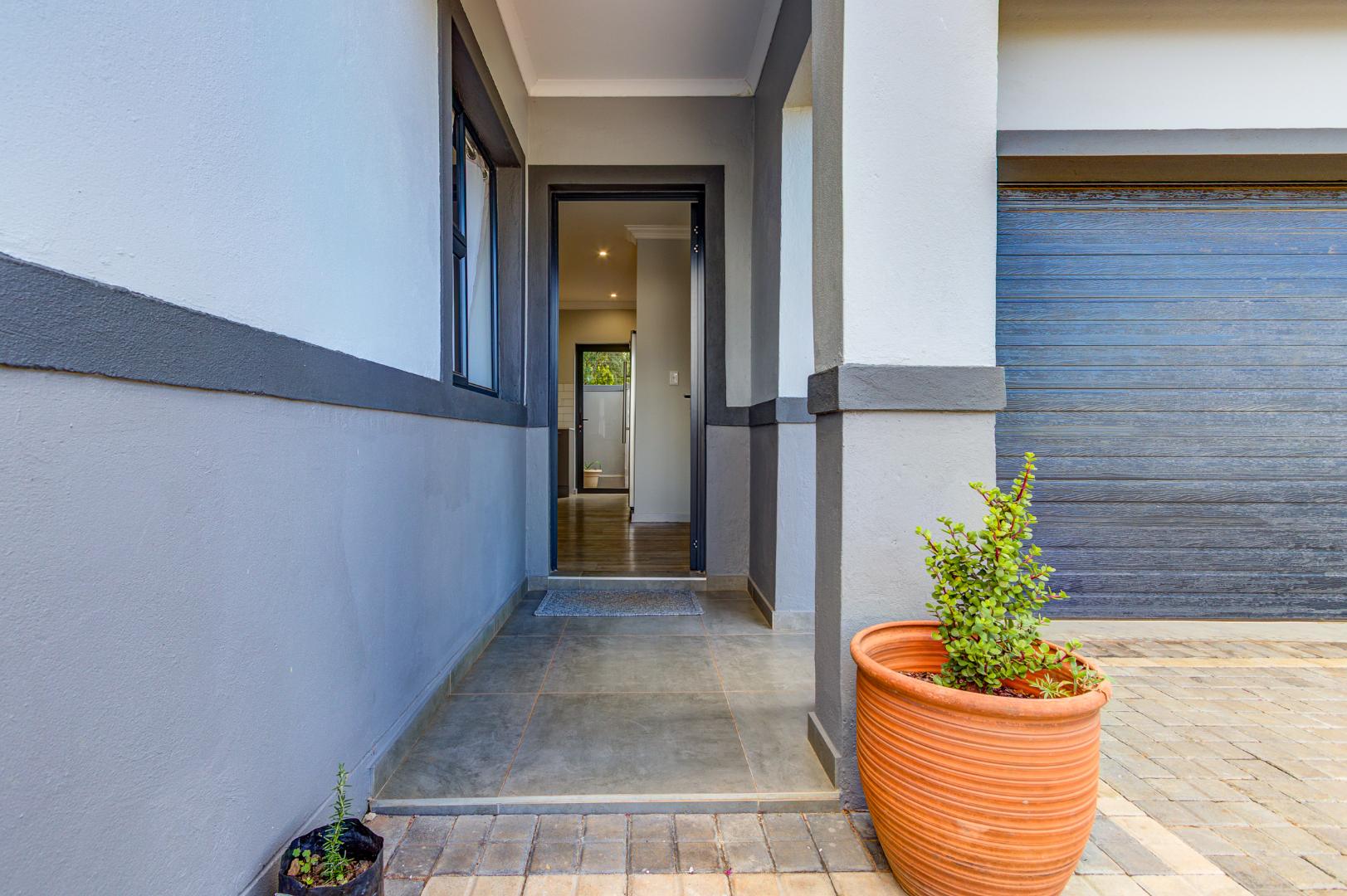 This modern family home, located within the secure Cornwall Country Estate in Country View, Benoni, offers contemporary living with excellent security and sustainable features. The property presents a welcoming kerb appeal with its stylish two-tone grey exterior, dark garage door, and paved driveway leading to a tiled entrance porch.