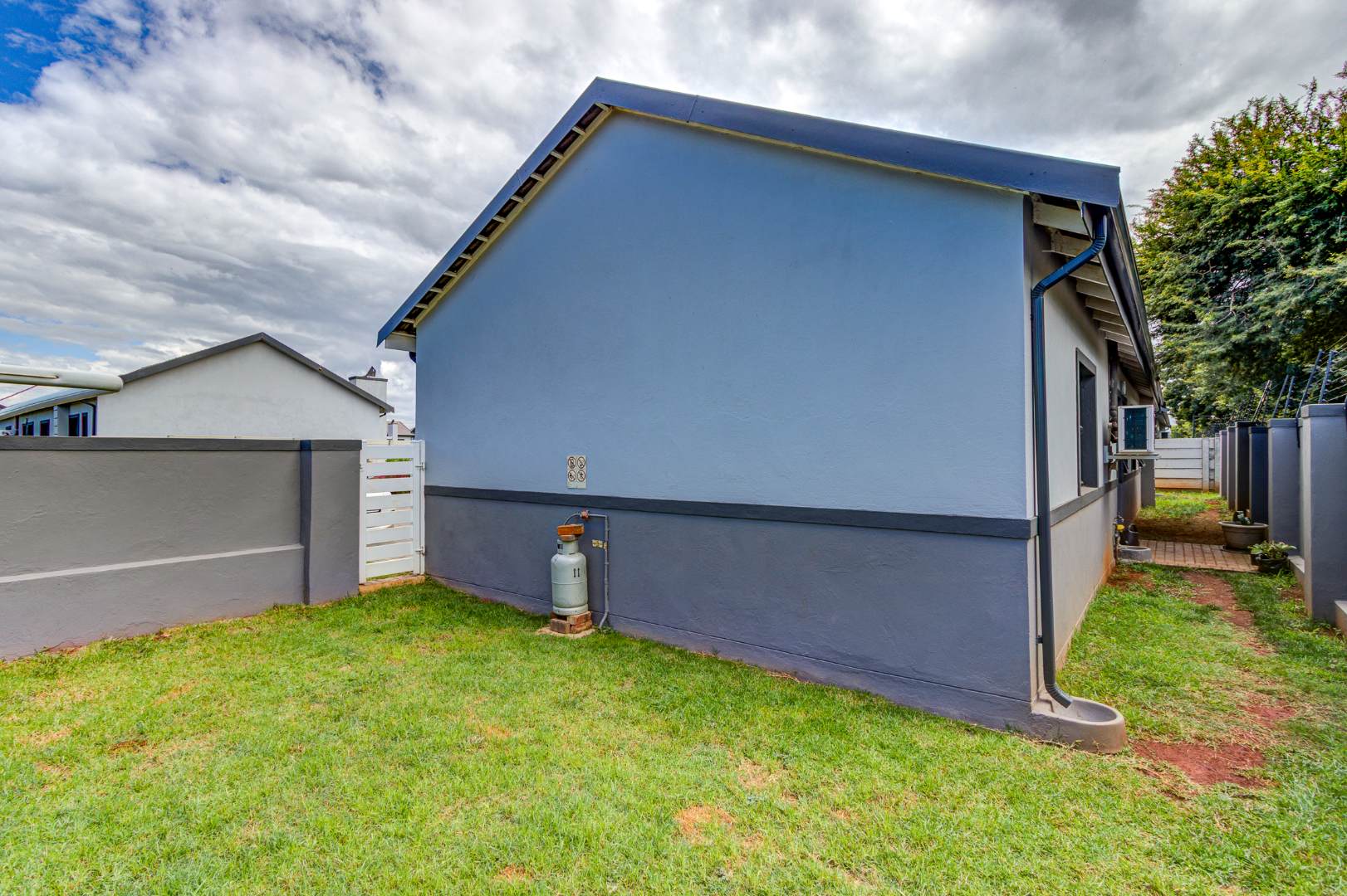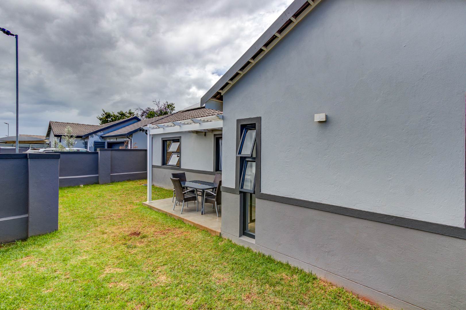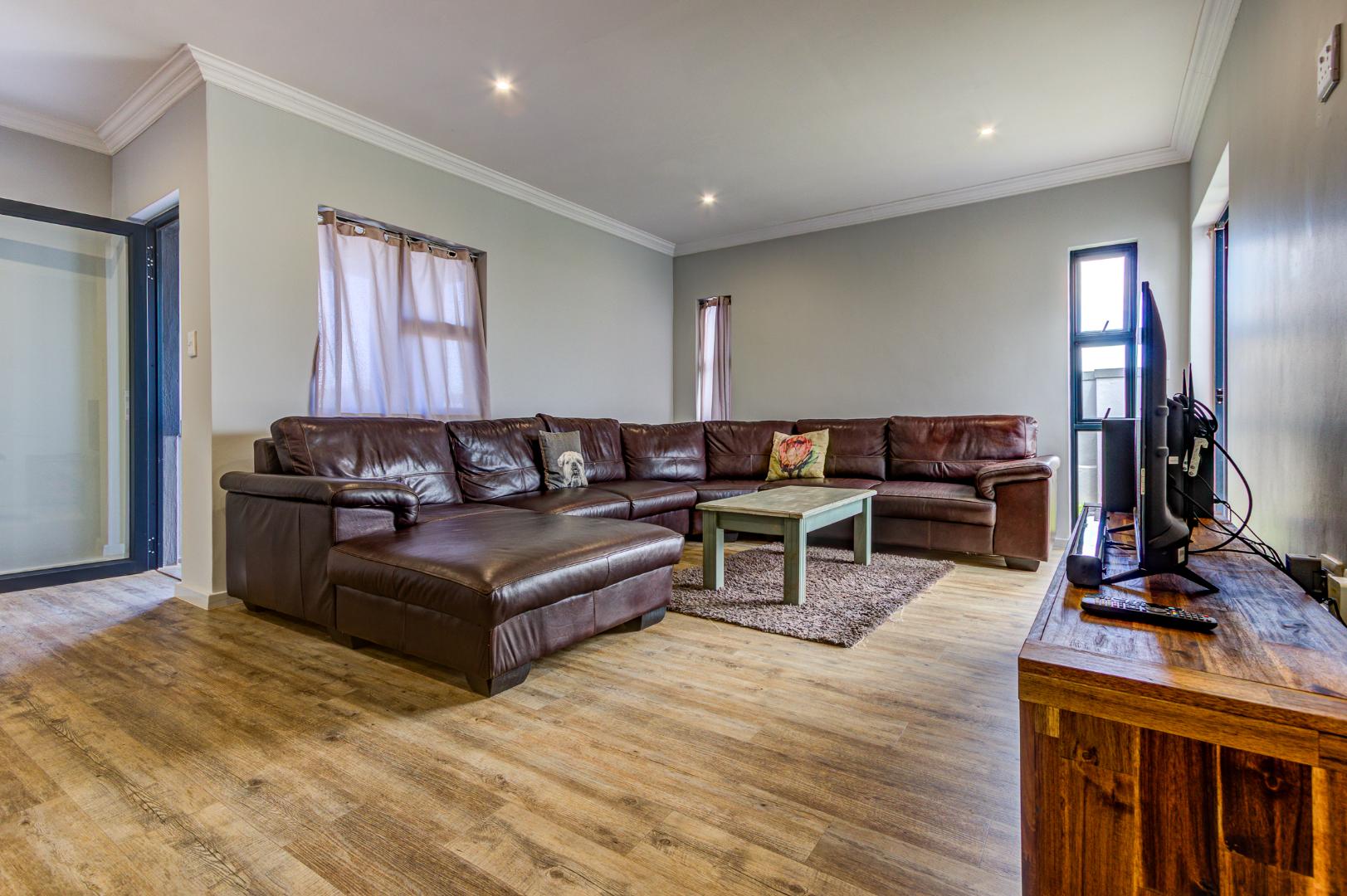 This modern family home, located within the secure Cornwall Country Estate in Country View, Benoni, offers contemporary living with excellent security and sustainable features. The property presents a welcoming kerb appeal with its stylish two-tone grey exterior, dark garage door, and paved driveway leading to a tiled entrance porch.