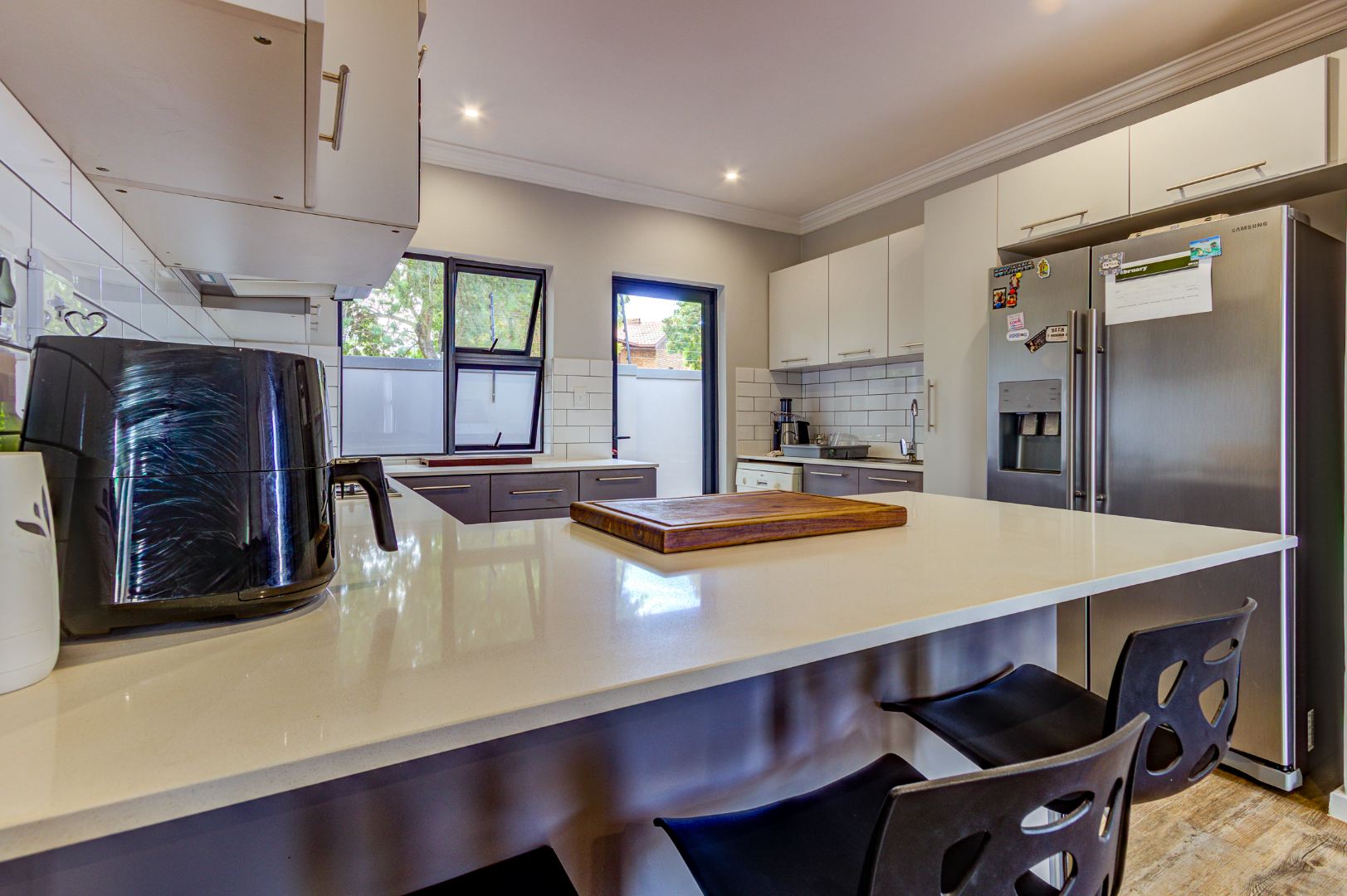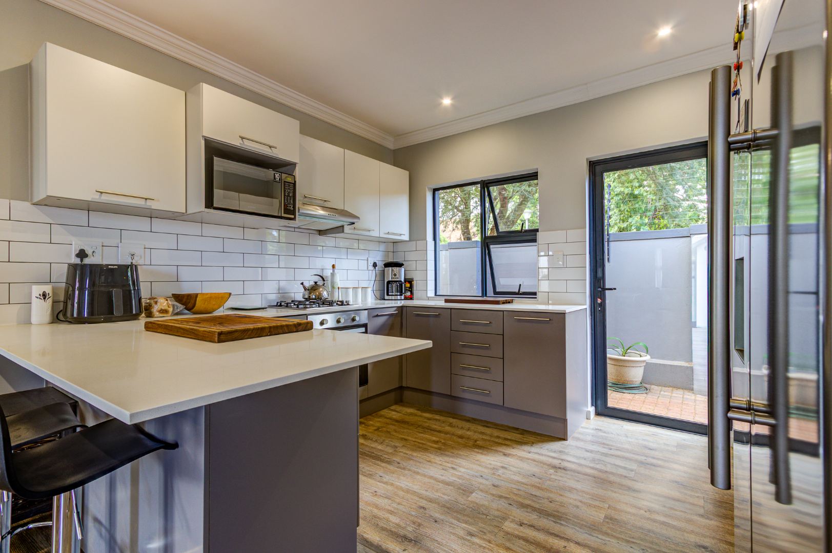 The heart of the home is a bright, modern kitchen boasting a large breakfast counter, two-tone cabinetry, a stylish subway tile backsplash, and stainless steel appliances including a gas stove and built-in microwave space. Quality finishes, including Ceasar stone counter tops not only looks beautiful but adds value. Ample storage and natural light make this kitchen both functional and aesthetically pleasing, with further outdoor access.