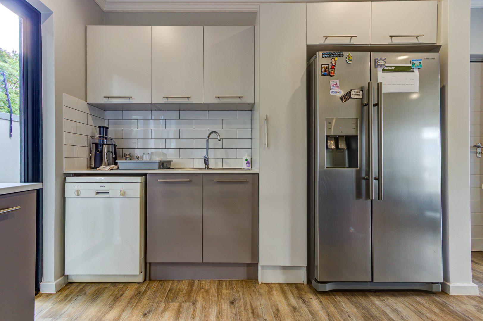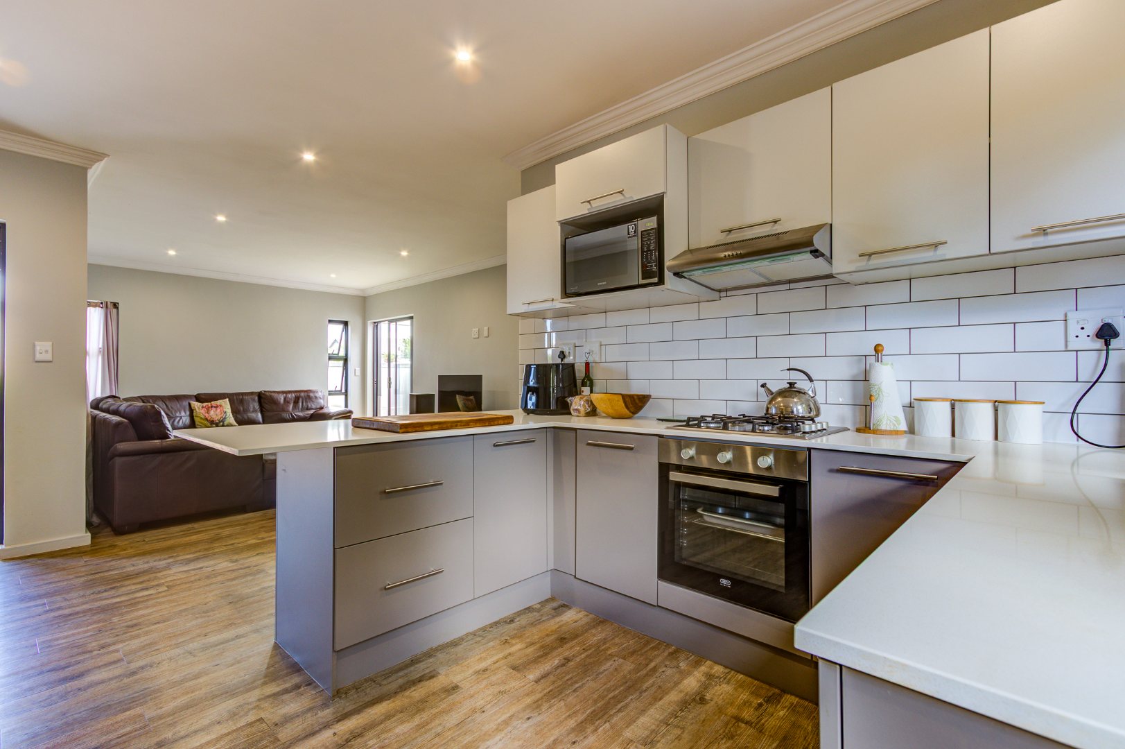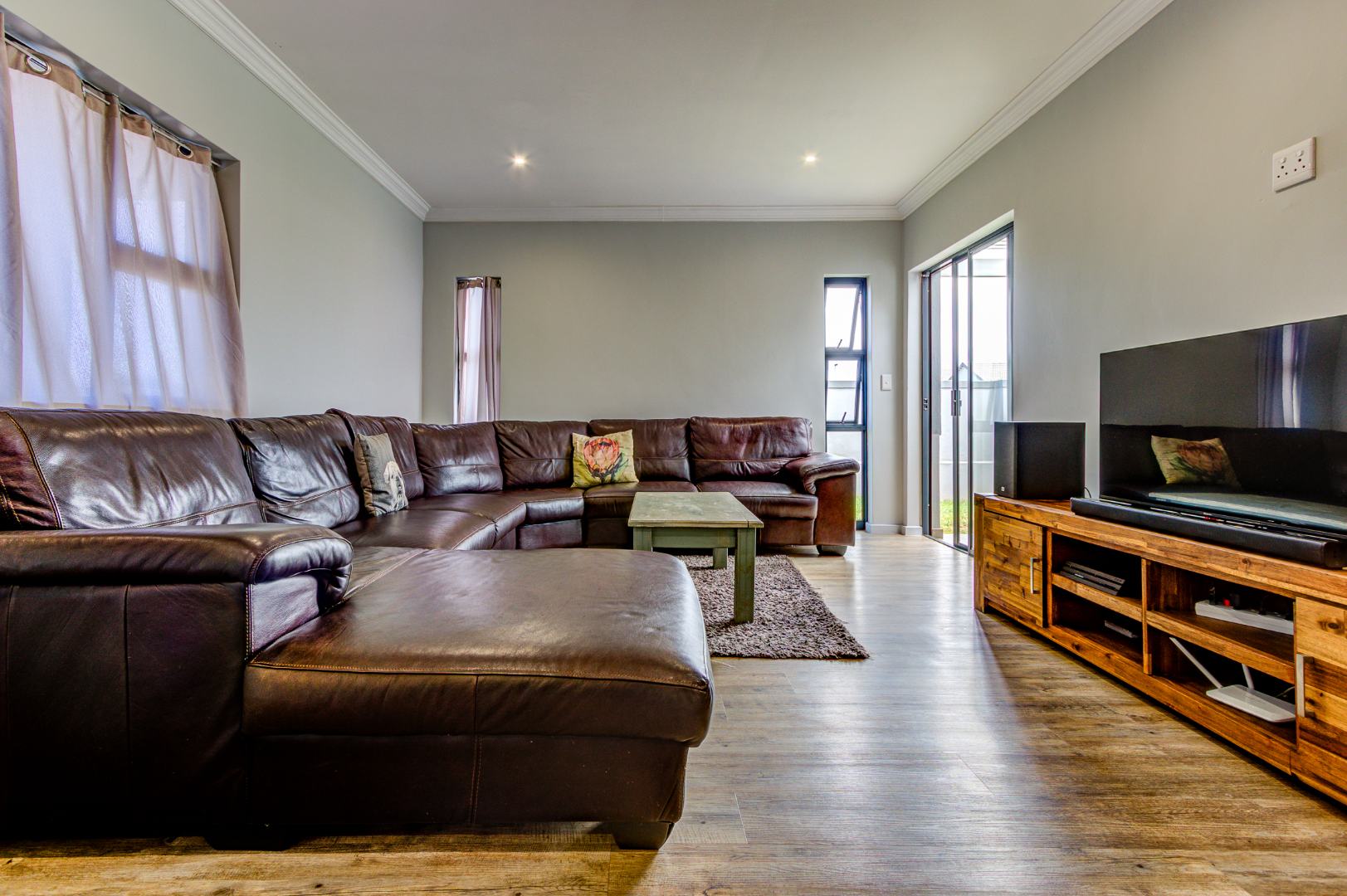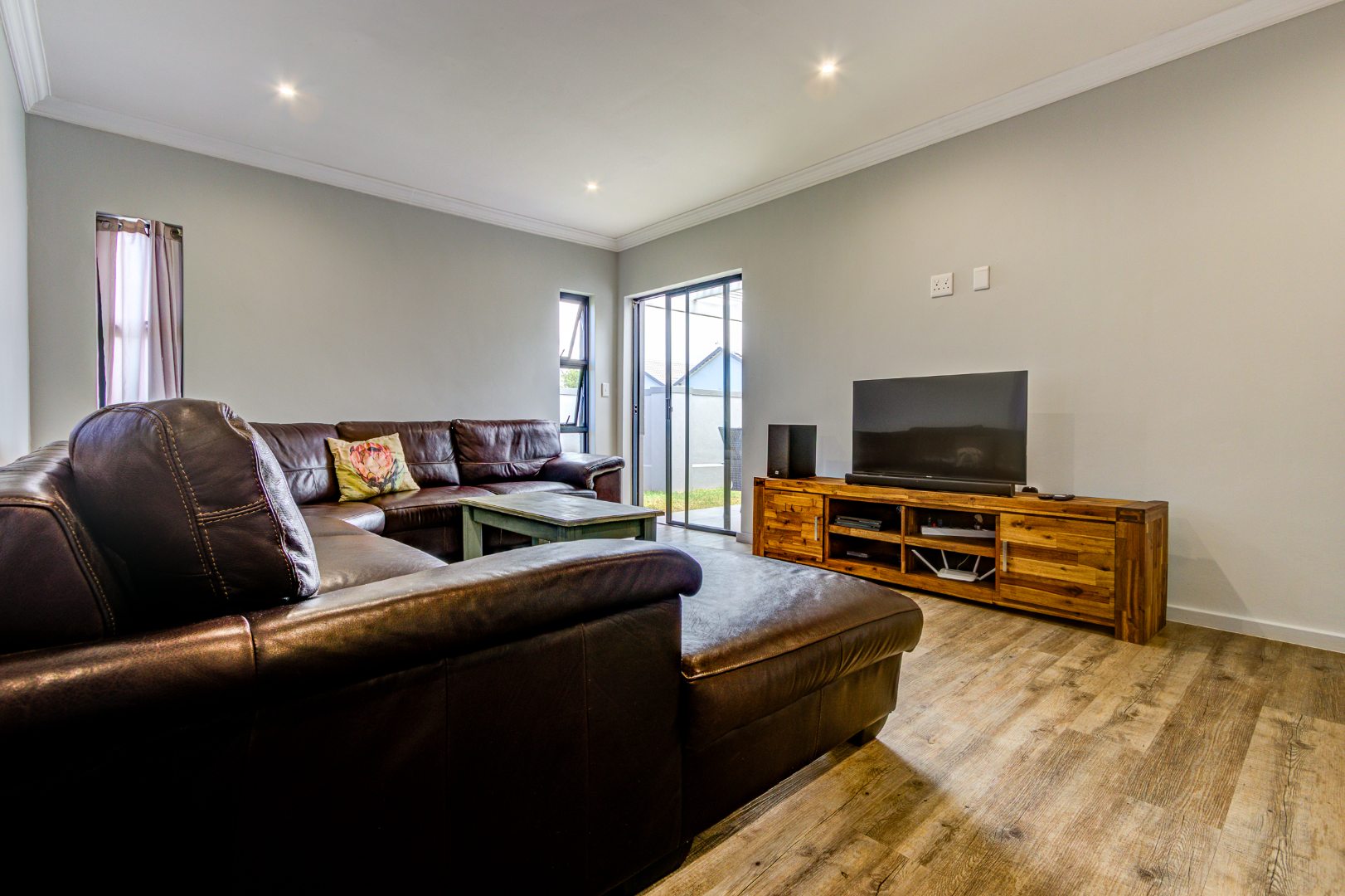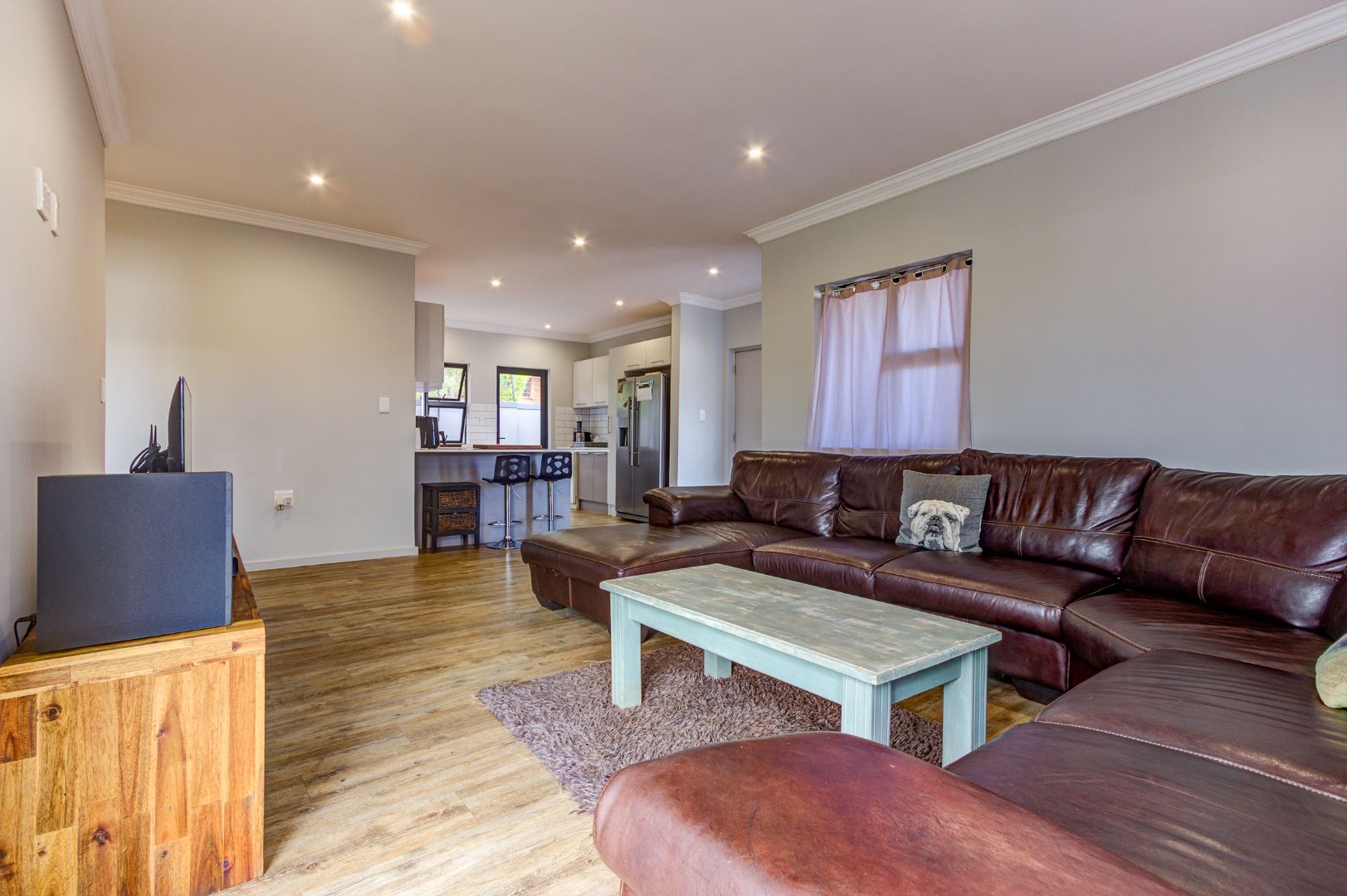 Step inside to discover an inviting open-plan layout, seamlessly connecting the living spaces. The spacious lounge area is bathed in natural light from multiple windows and sliding doors, featuring durable wood-look flooring, elegant crown molding, and modern recessed lighting. This area provides direct access to the outdoor space.