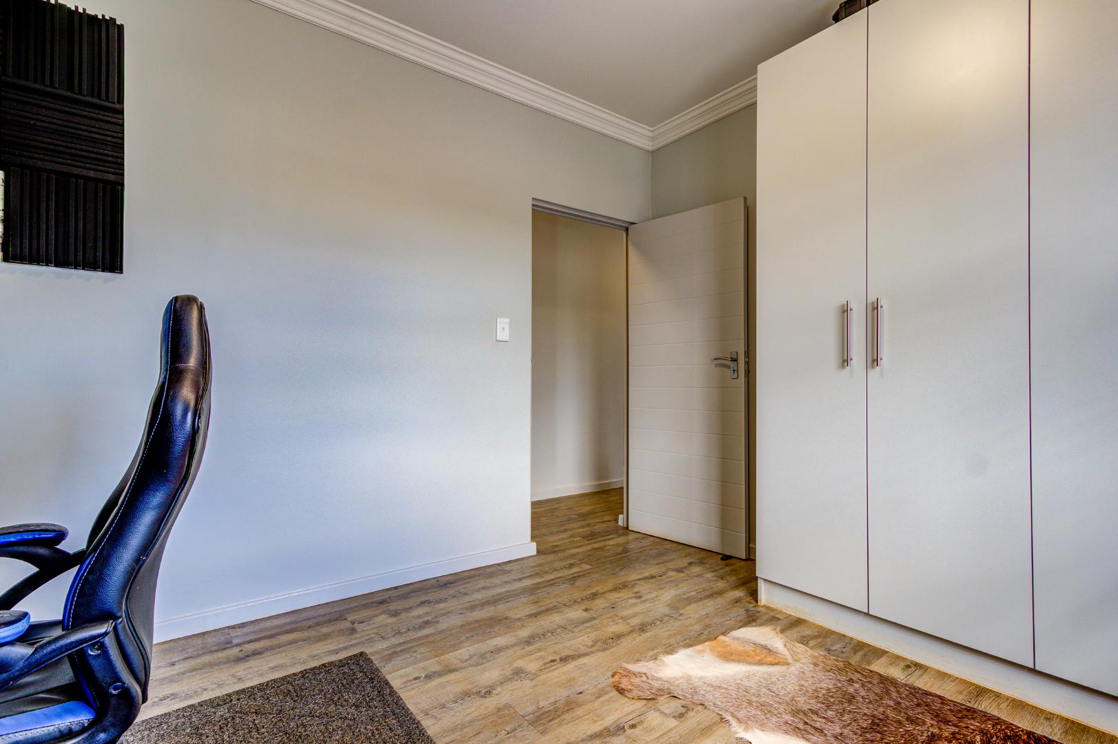 Outdoor living is enhanced by direct access from the open plan living and kitchen area, complemented by an awning. The property is situated on a 517 sqm erf with a floor size of 158 sqm. Security is paramount within this gated community, featuring an access gate, electric fencing, and an intercom system. Situated within a Complex and a Secure Enclosure allows for double security for the family, ensuring peace of mind. Furthermore, the home is equipped with solar panels (rental) and an energy efficient heat pump geyser, promoting energy efficiency.