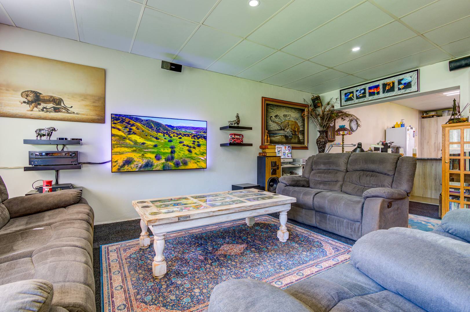 Designed for both relaxation and functionality, the home includes two inviting lounges, a dedicated dining room, and an additional family TV room, ensuring diverse living spaces for every occasion. Practical amenities such as a study, a well-equipped kitchen with a pantry, a separate laundry room, and generous storage facilities enhance daily convenience. The property embraces a pet-friendly ethos, making it an ideal haven for animal lovers.