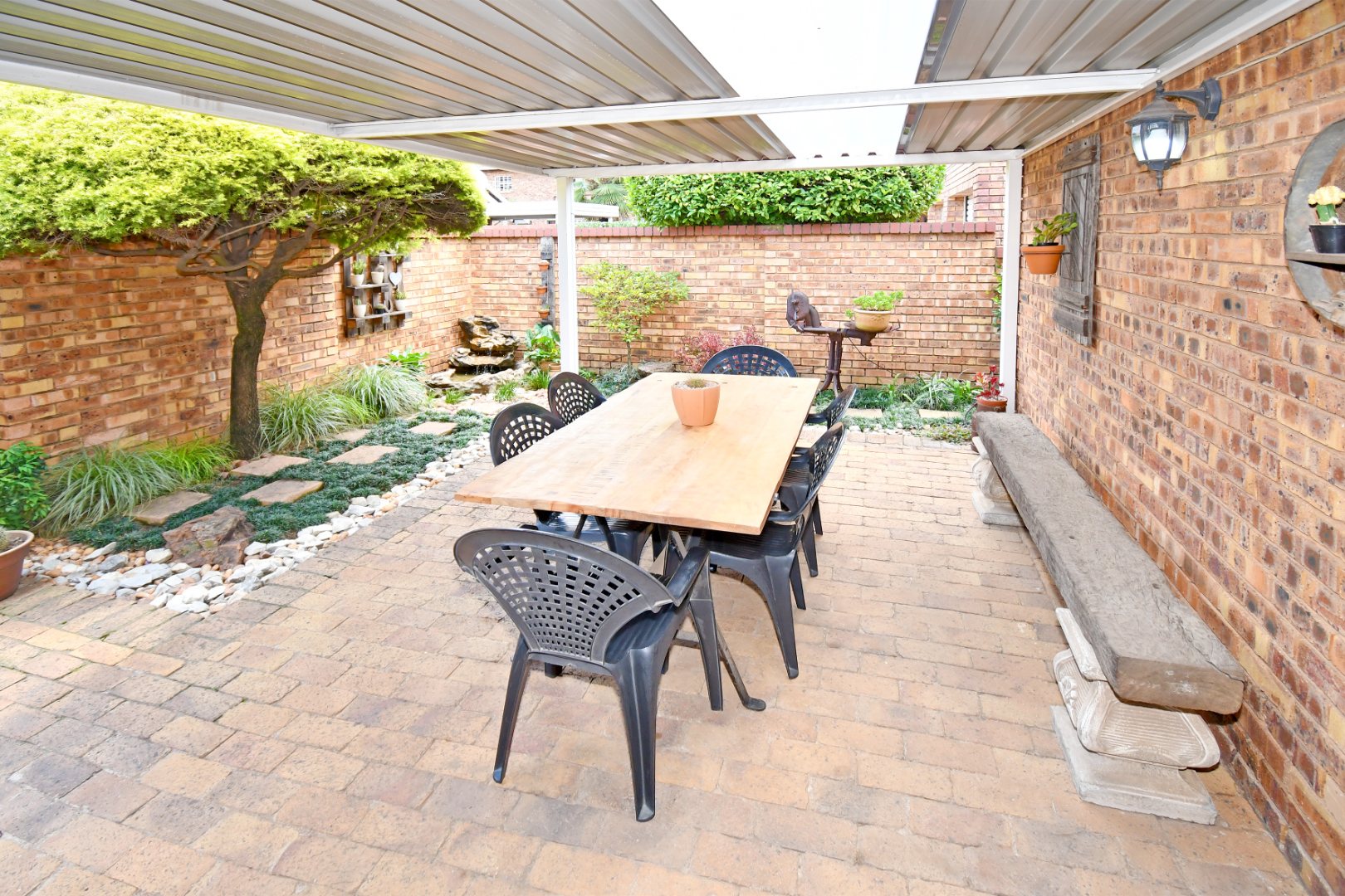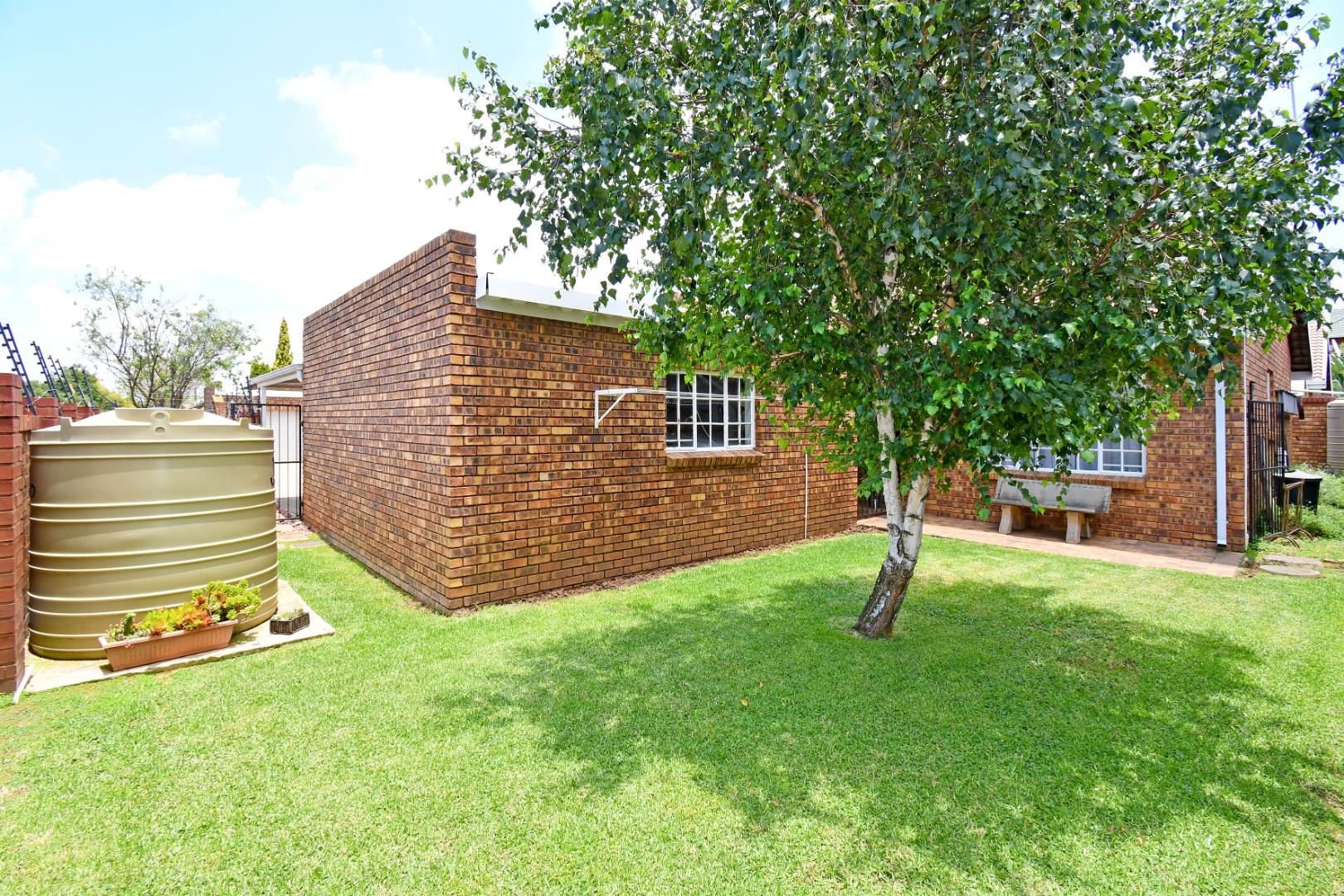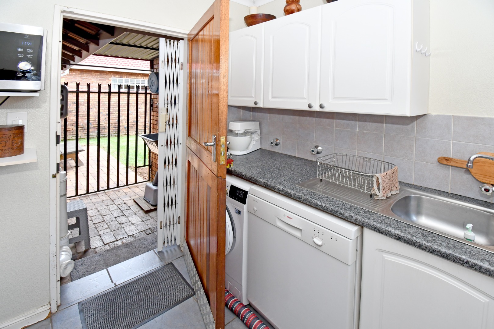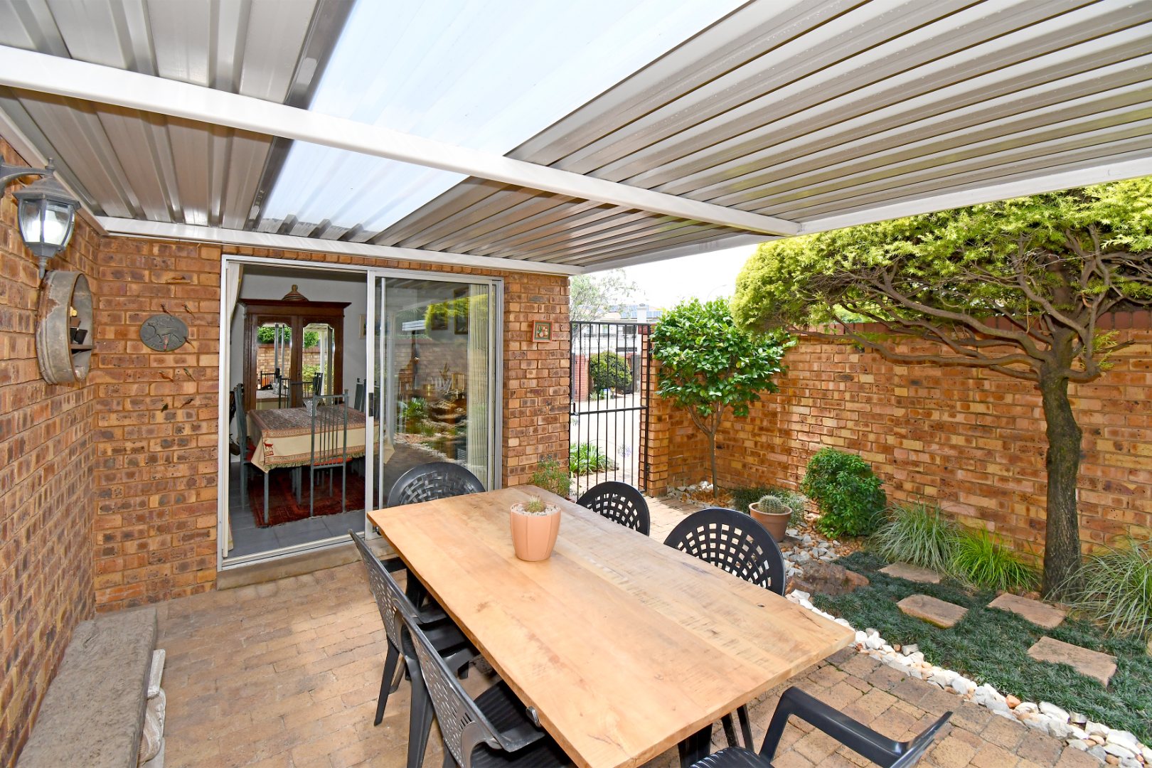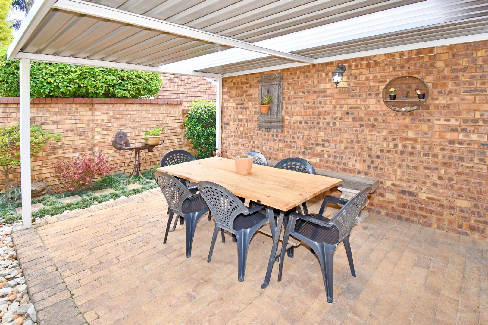 Three comfortable bedrooms include a main with an en-suite bathroom. Outdoor living features a private, covered patio, ideal for relaxation, flowing into a low-maintenance, landscaped garden. The property is totally walled, offering privacy and a secure environment for pets. Security is paramount, with an alarm system, electric fencing, and burglar bars ensuring peace of mind.
