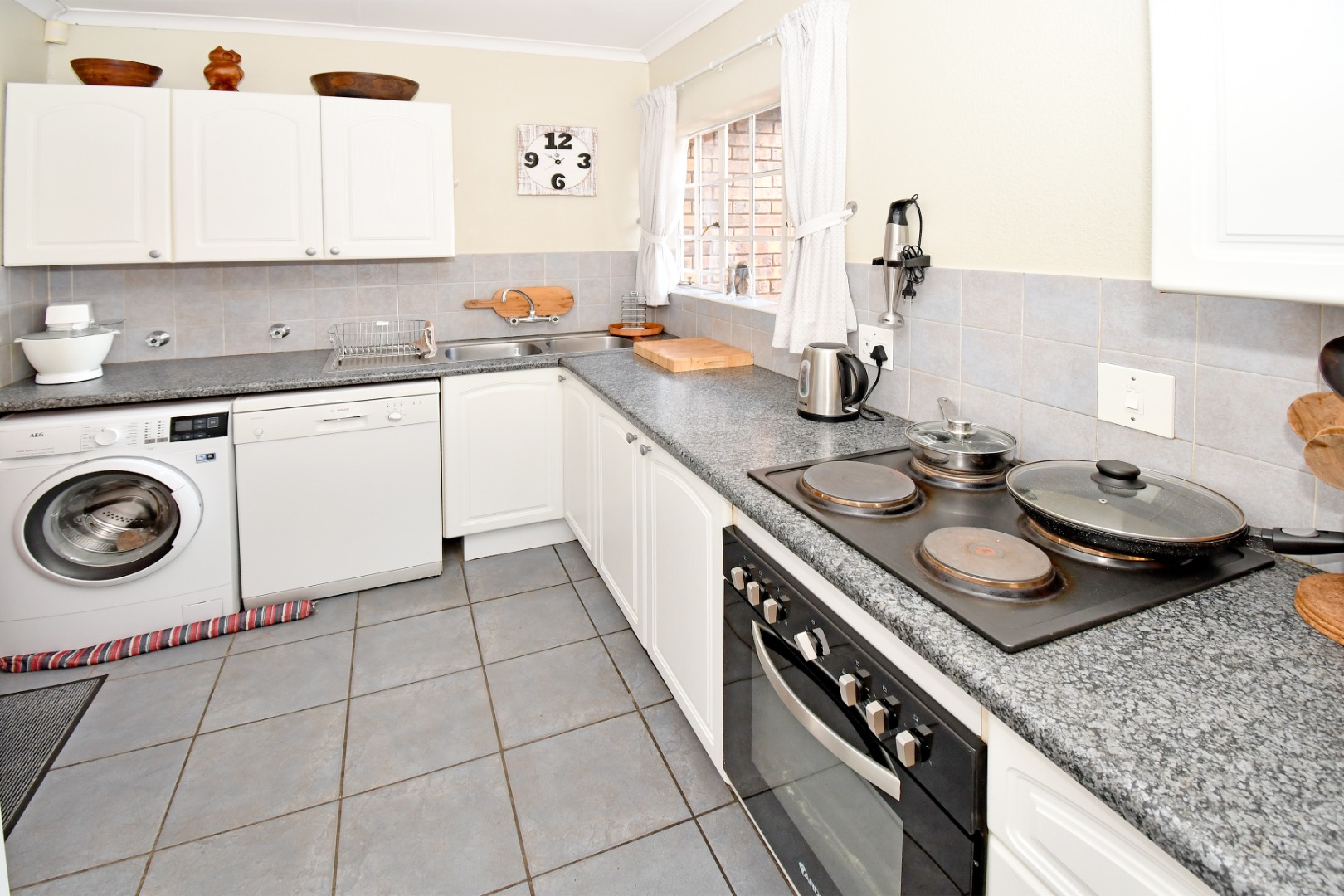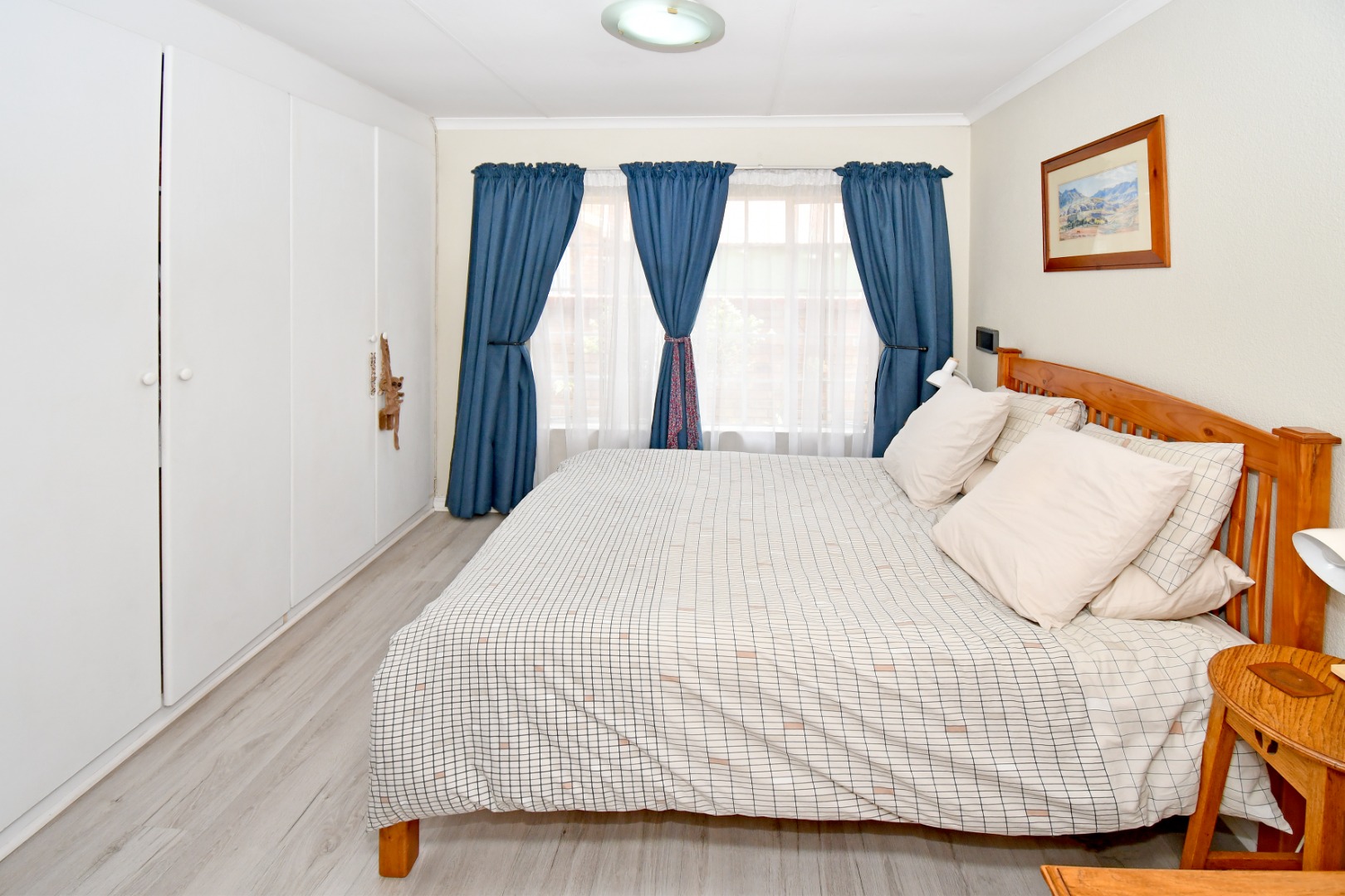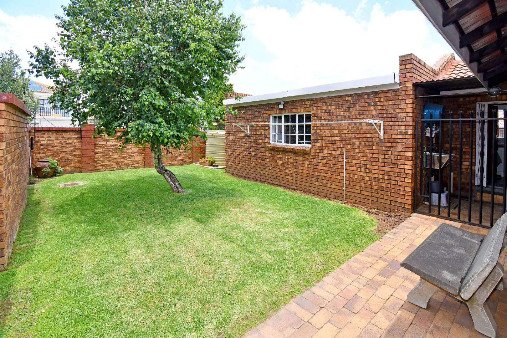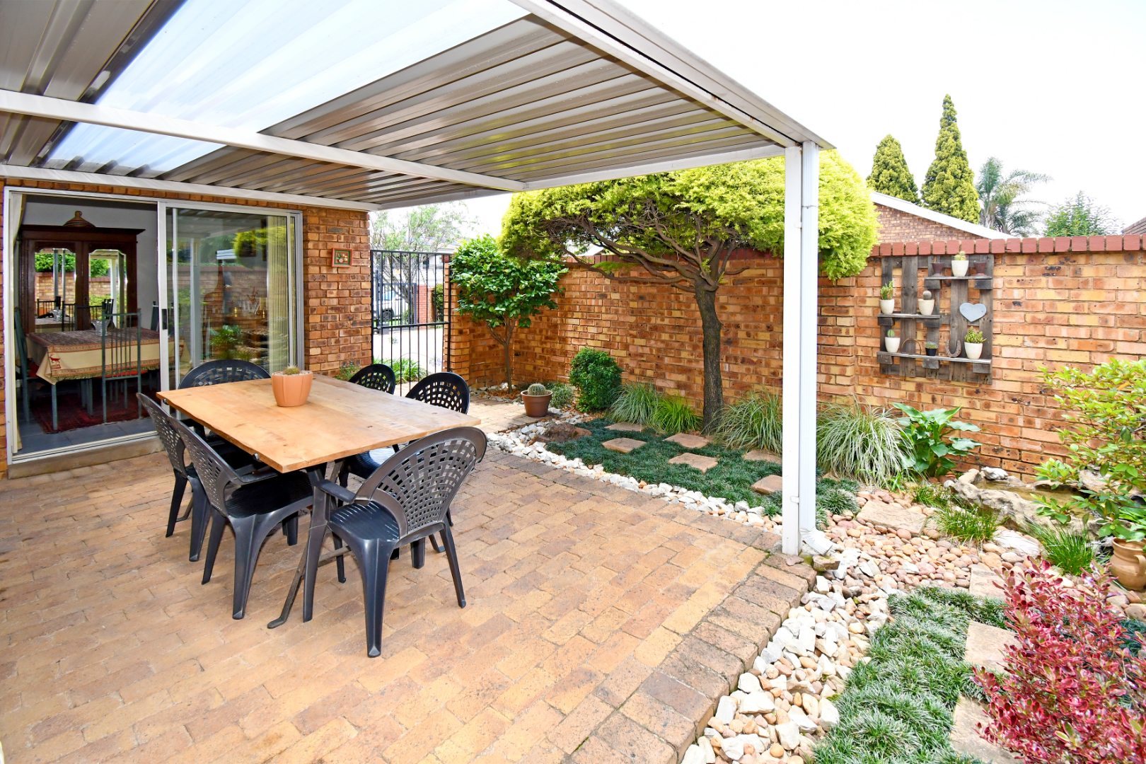 Three comfortable bedrooms include a main with an en-suite bathroom. Outdoor living features a private, covered patio, ideal for relaxation, flowing into a low-maintenance, landscaped garden. The property is totally walled, offering privacy and a secure environment for pets. Security is paramount, with an alarm system, electric fencing, and burglar bars ensuring peace of mind.