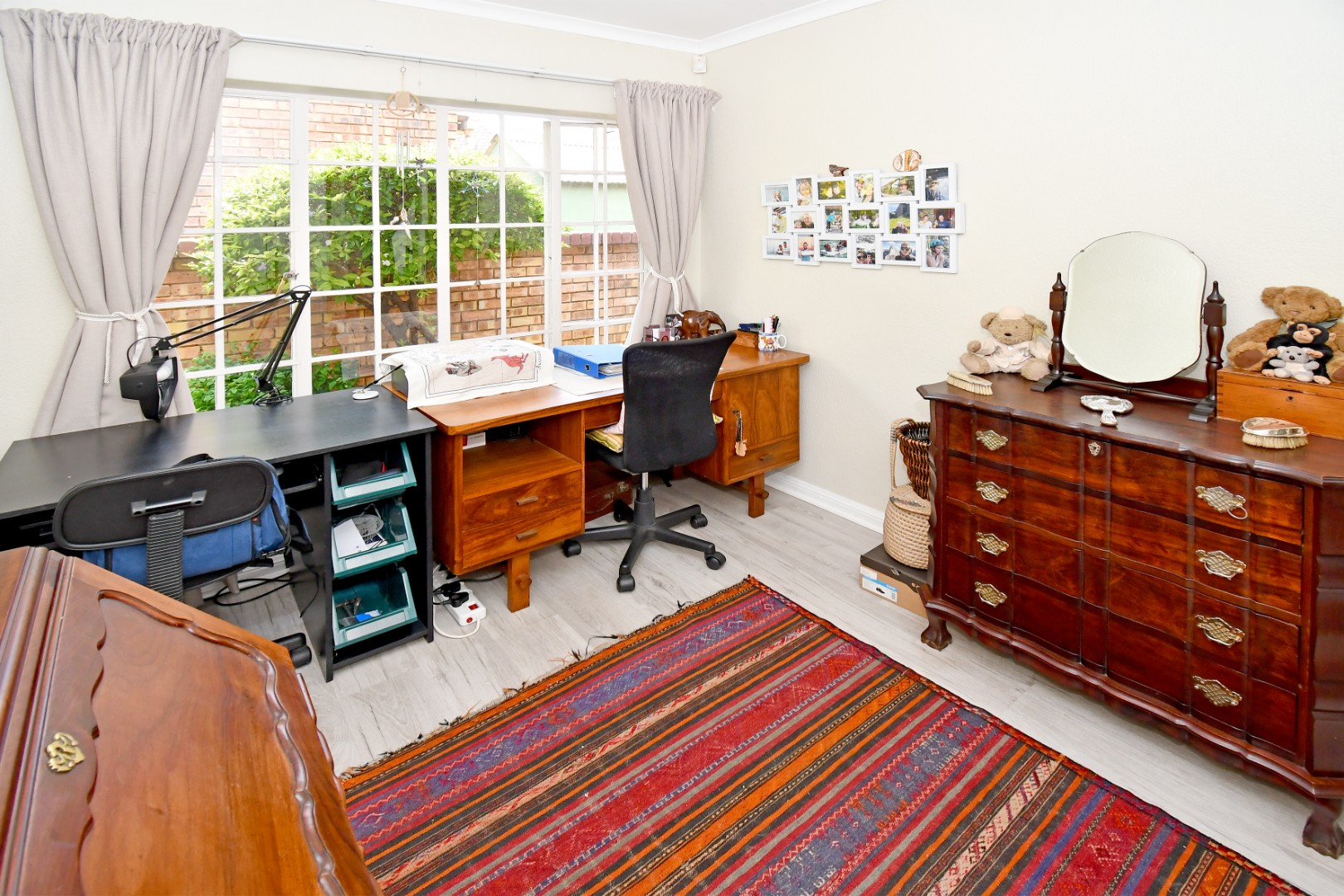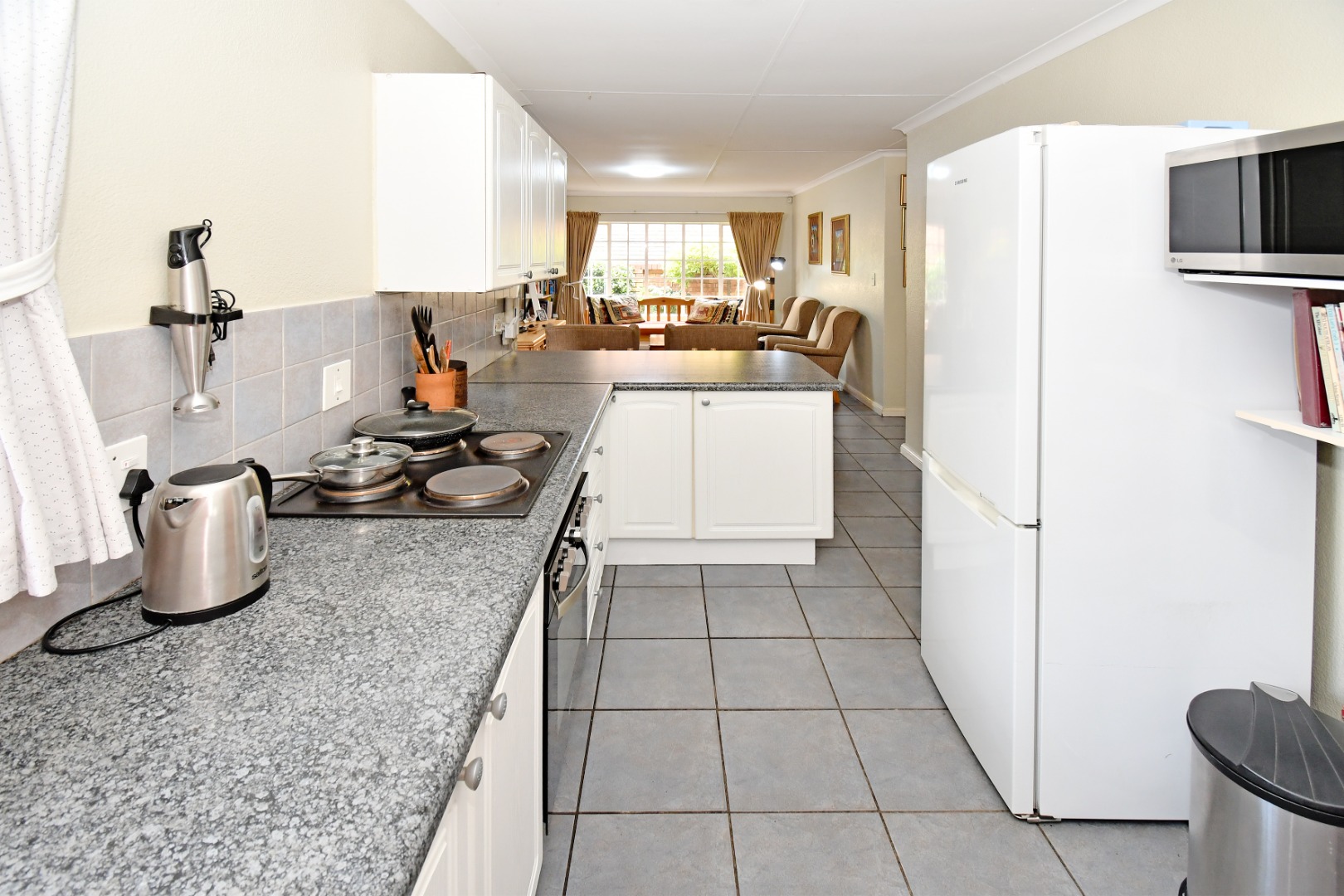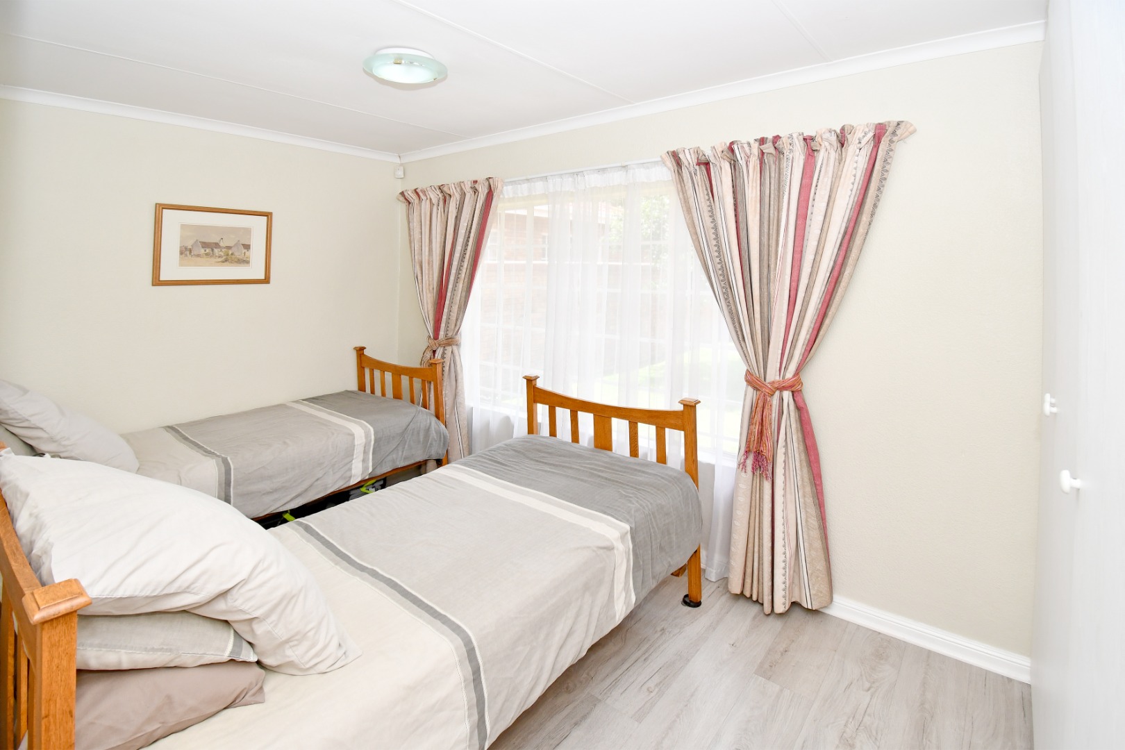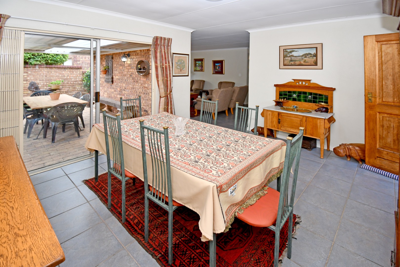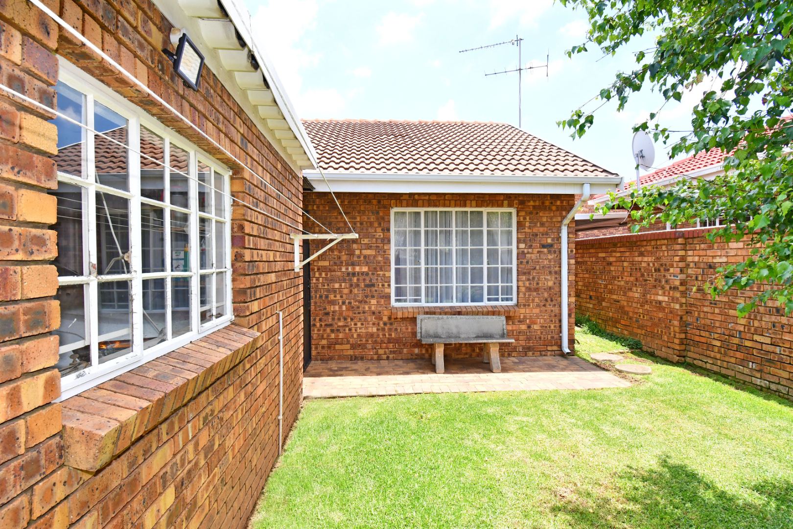 Three comfortable bedrooms include a main with an en-suite bathroom. Outdoor living features a private, covered patio, ideal for relaxation, flowing into a low-maintenance, landscaped garden. The property is totally walled, offering privacy and a secure environment for pets. Security is paramount, with an alarm system, electric fencing, and burglar bars ensuring peace of mind.