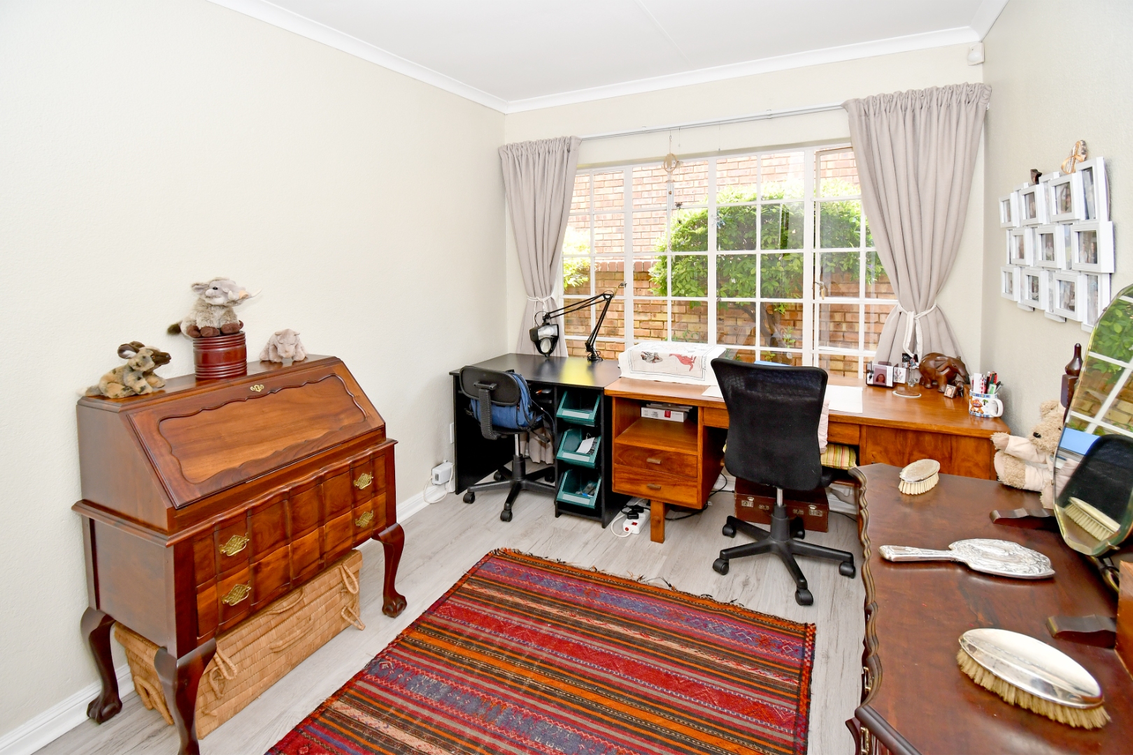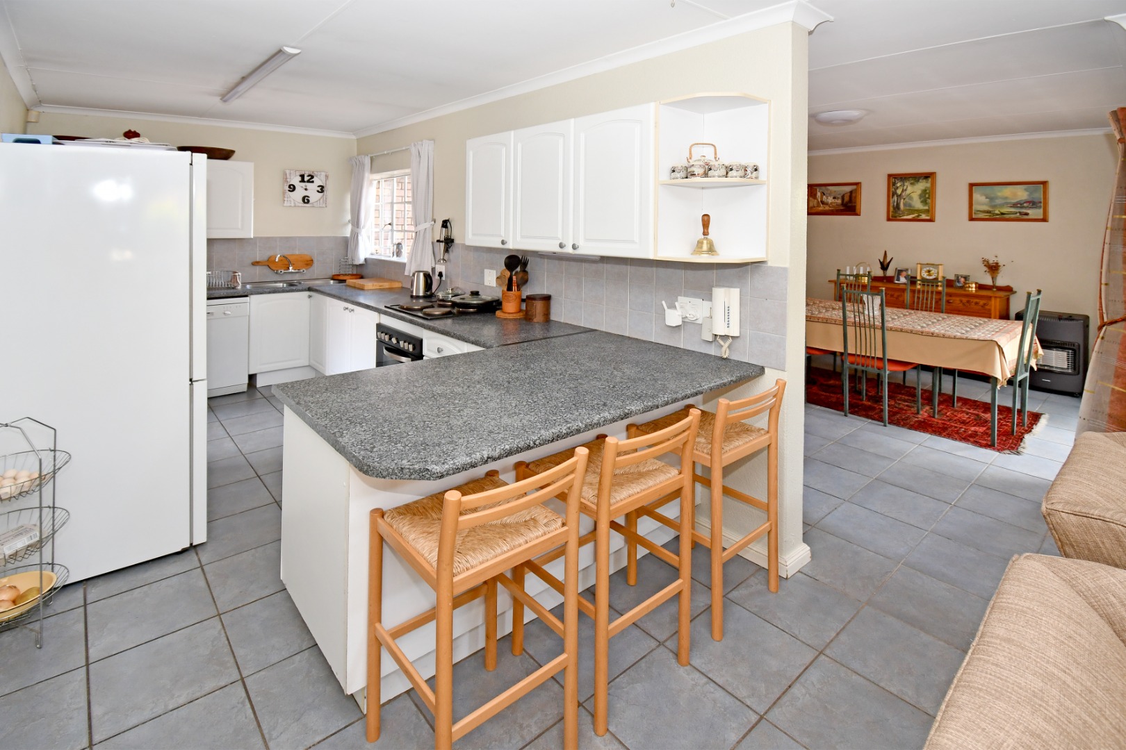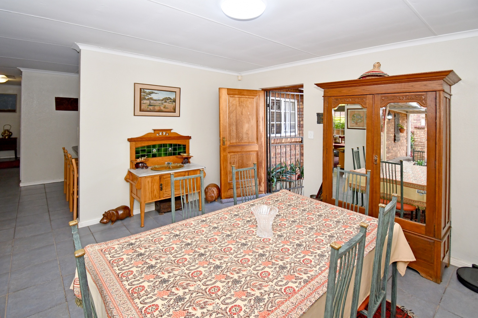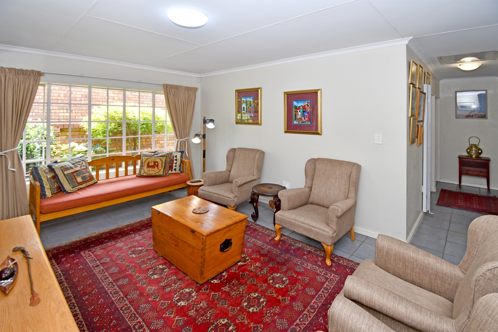 Three comfortable bedrooms include a main with an en-suite bathroom. Outdoor living features a private, covered patio, ideal for relaxation, flowing into a low-maintenance, landscaped garden. The property is totally walled, offering privacy and a secure environment for pets. Security is paramount, with an alarm system, electric fencing, and burglar bars ensuring peace of mind.