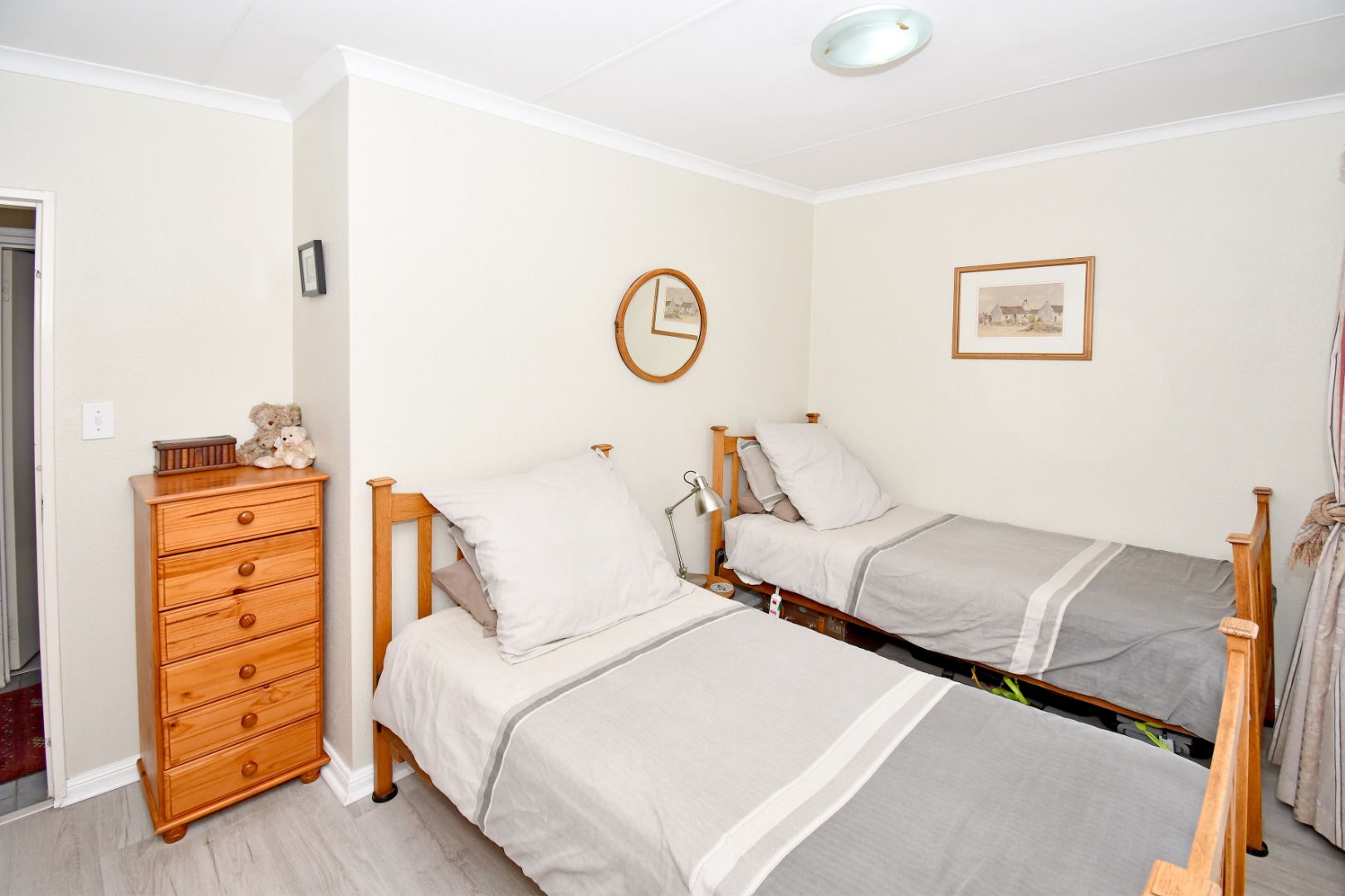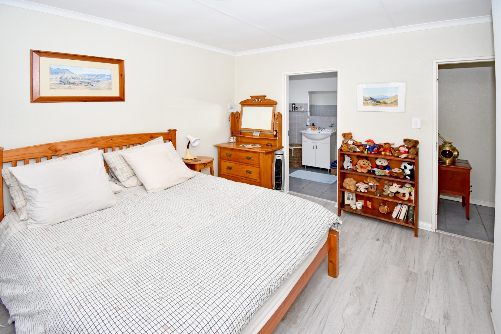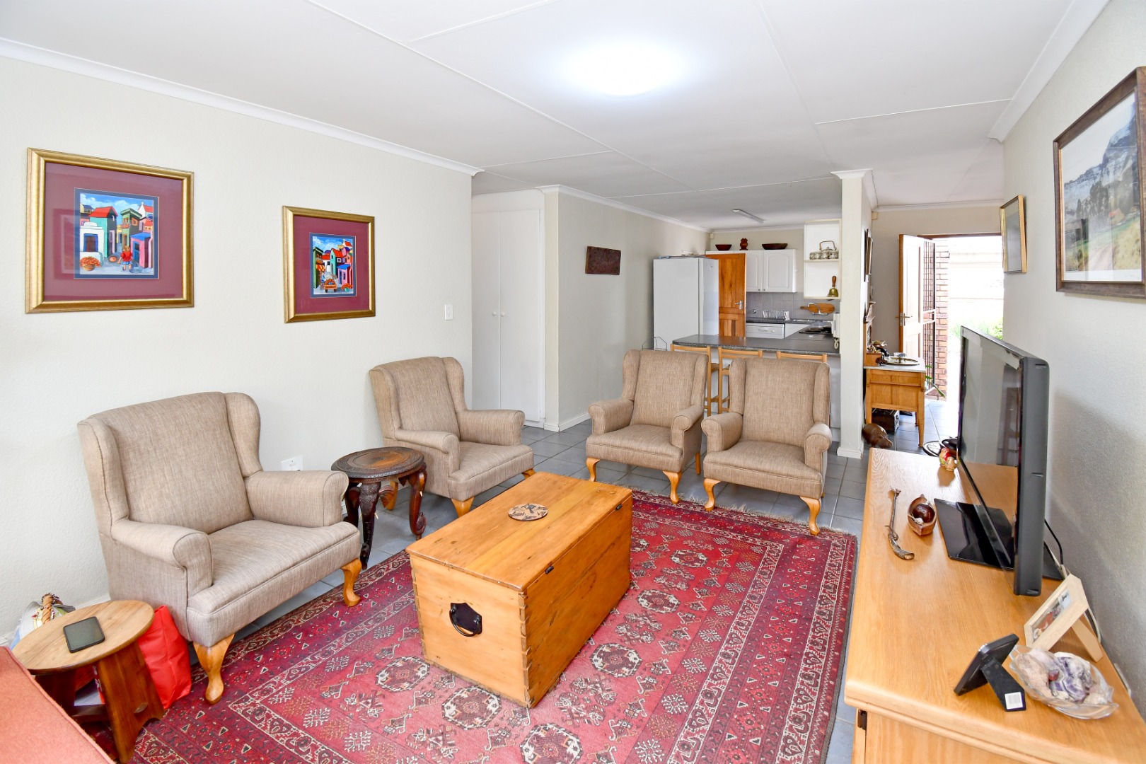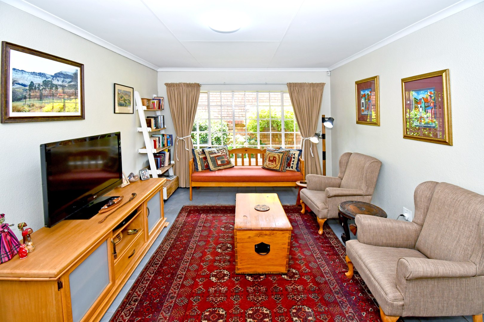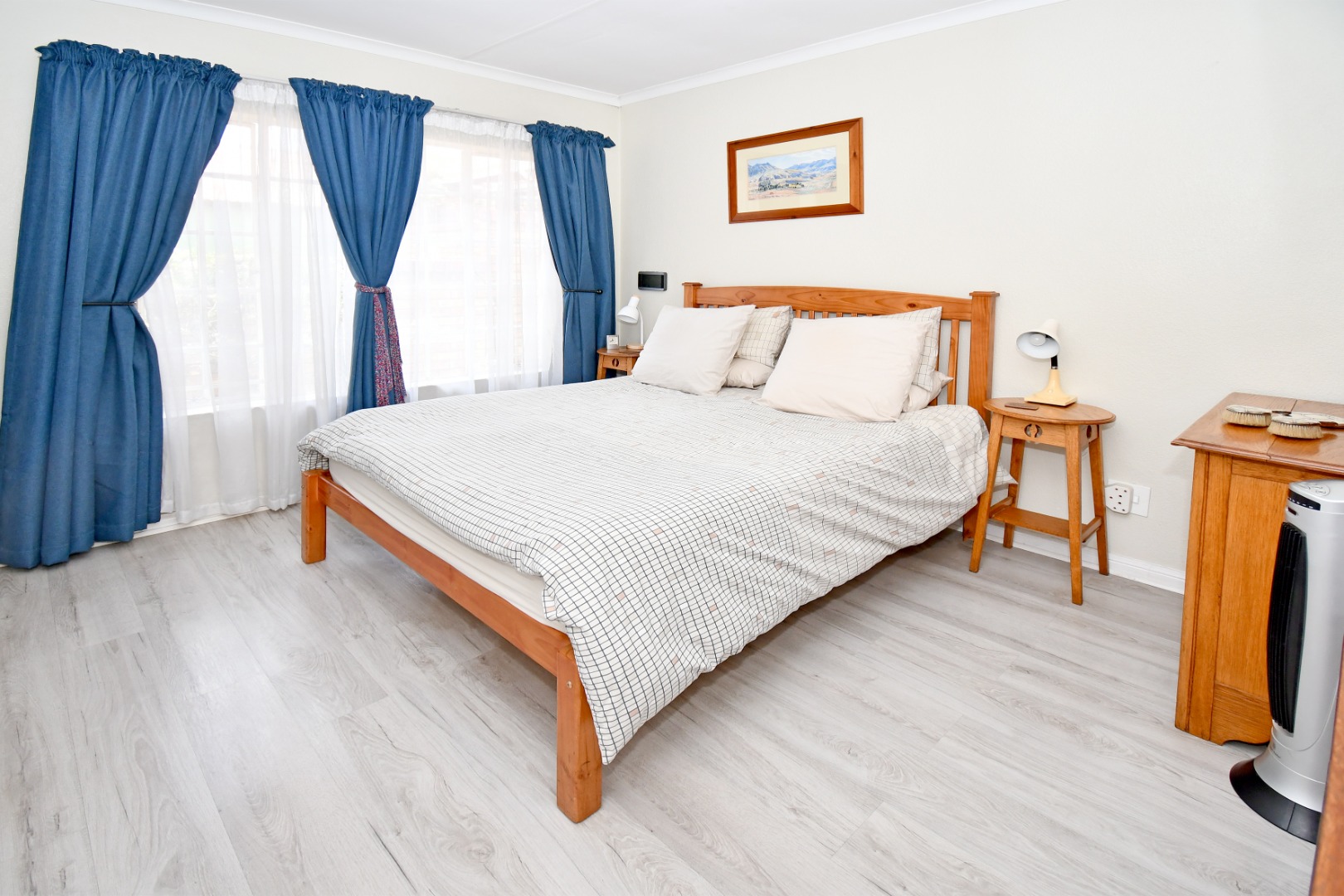 Three comfortable bedrooms include a main with an en-suite bathroom. Outdoor living features a private, covered patio, ideal for relaxation, flowing into a low-maintenance, landscaped garden. The property is totally walled, offering privacy and a secure environment for pets. Security is paramount, with an alarm system, electric fencing, and burglar bars ensuring peace of mind.