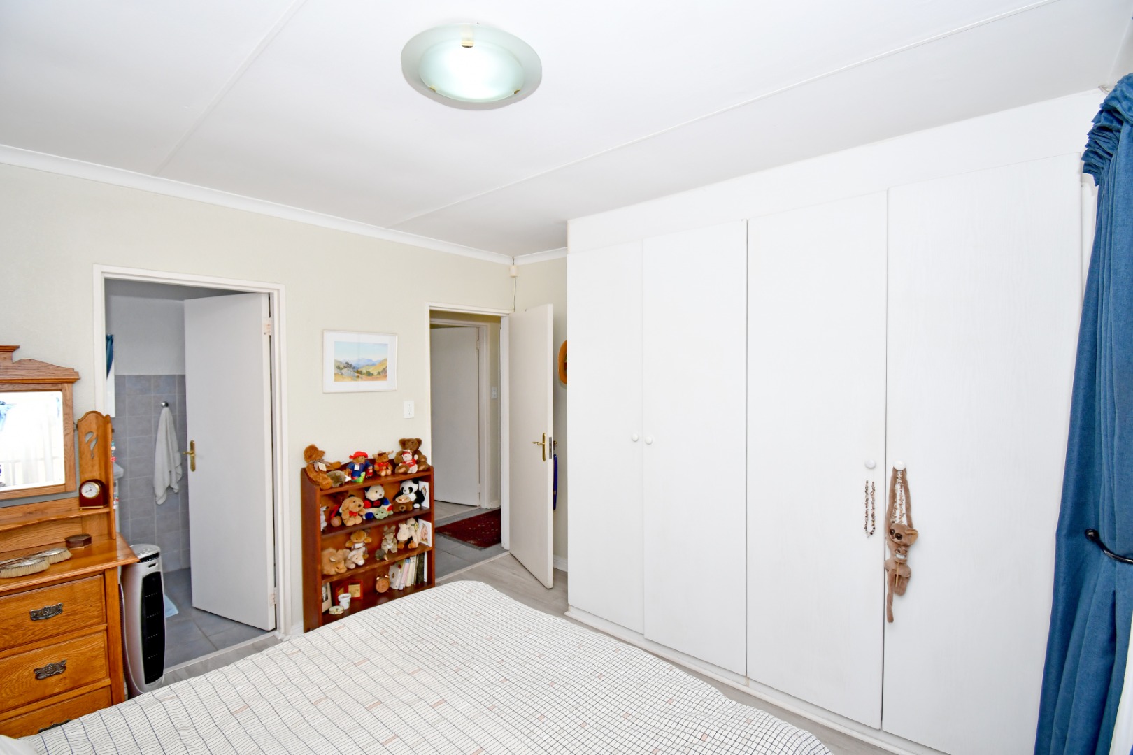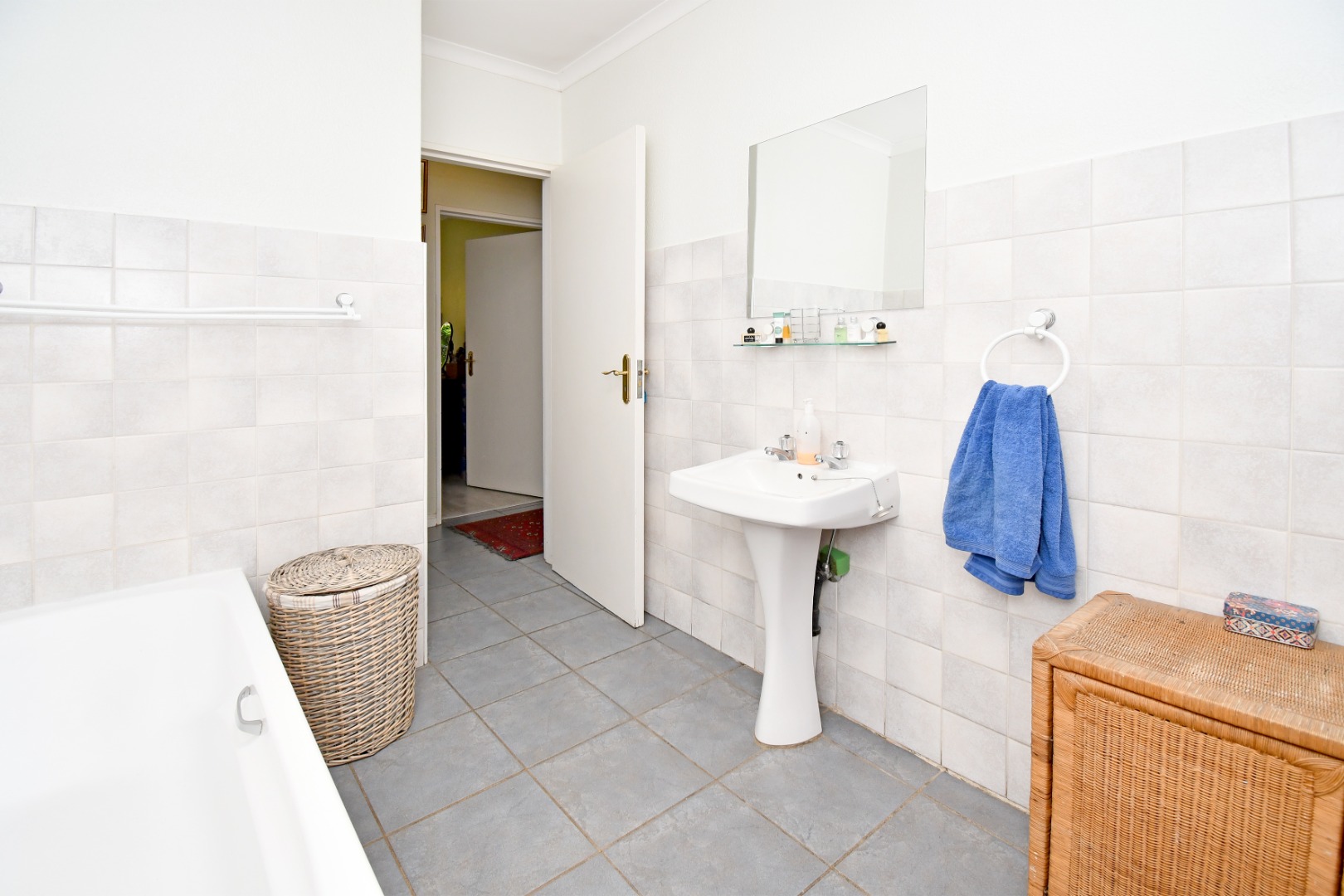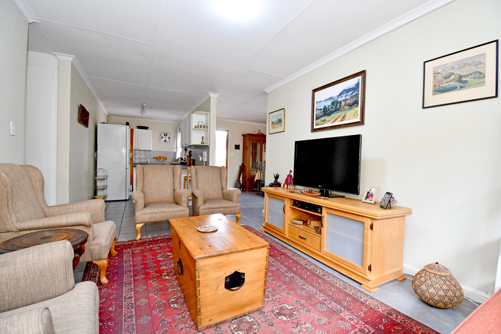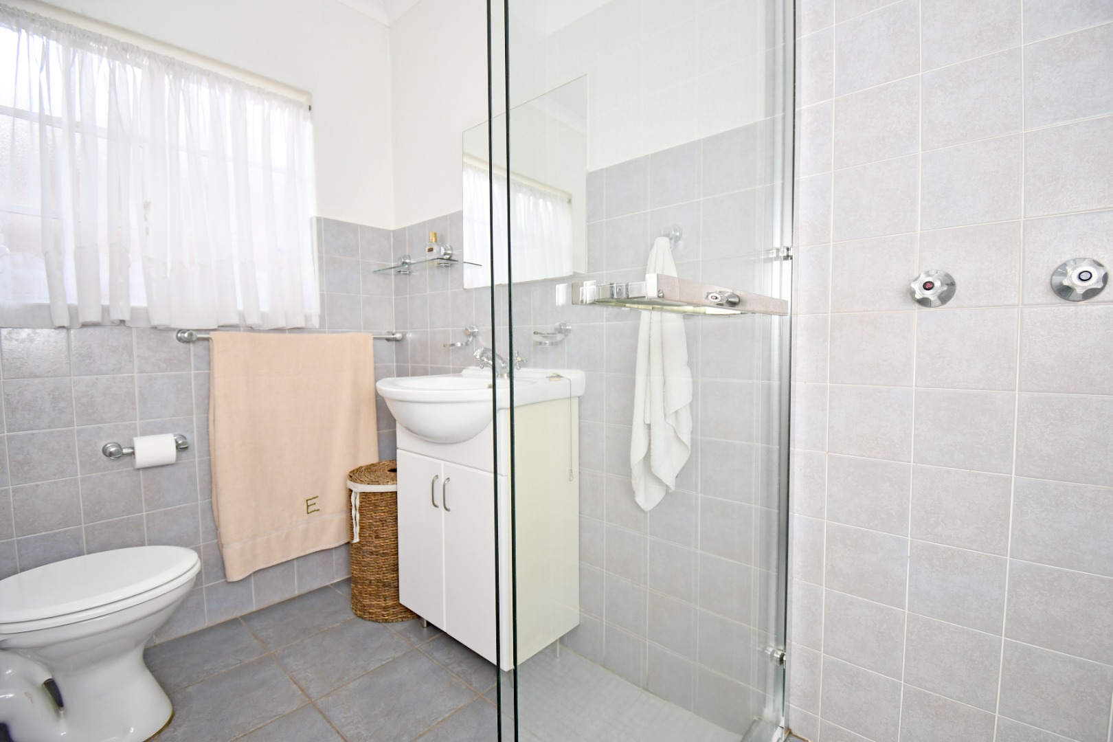 Three comfortable bedrooms include a main with an en-suite bathroom. Outdoor living features a private, covered patio, ideal for relaxation, flowing into a low-maintenance, landscaped garden. The property is totally walled, offering privacy and a secure environment for pets. Security is paramount, with an alarm system, electric fencing, and burglar bars ensuring peace of mind.