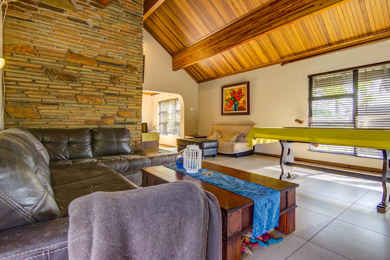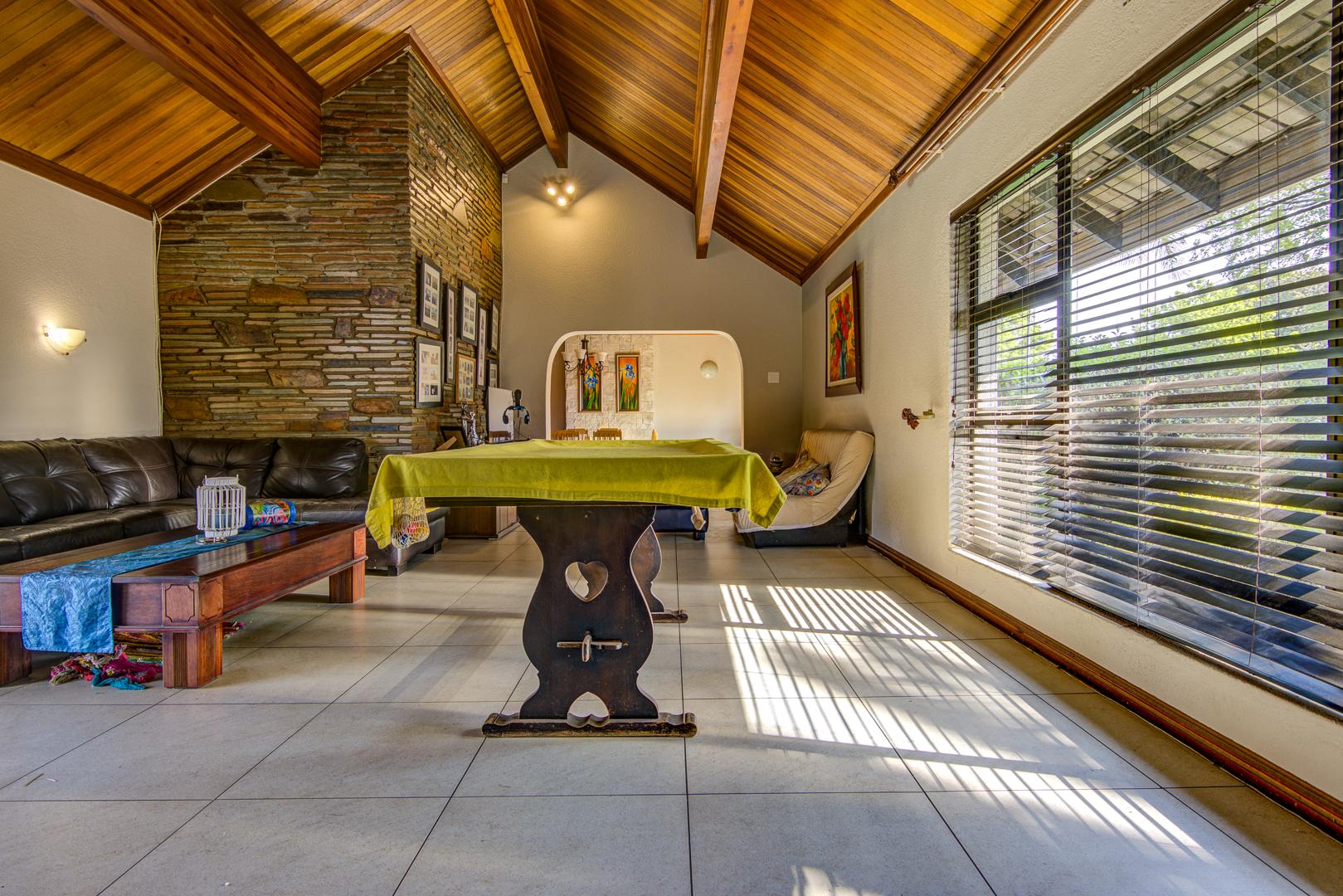 Step inside to a meticulously designed interior featuring two expansive lounges and a dedicated dining room, perfect for both intimate family gatherings and grand entertaining. The dining area boasts a distinctive wooden slatted ceiling and a captivating stone-clad accent wall, adding unique character. The functional kitchen, equipped with extensive wooden cabinetry, tiled flooring, and a convenient pass-through window, offers abundant storage and preparation space, catering to culinary enthusiasts.
