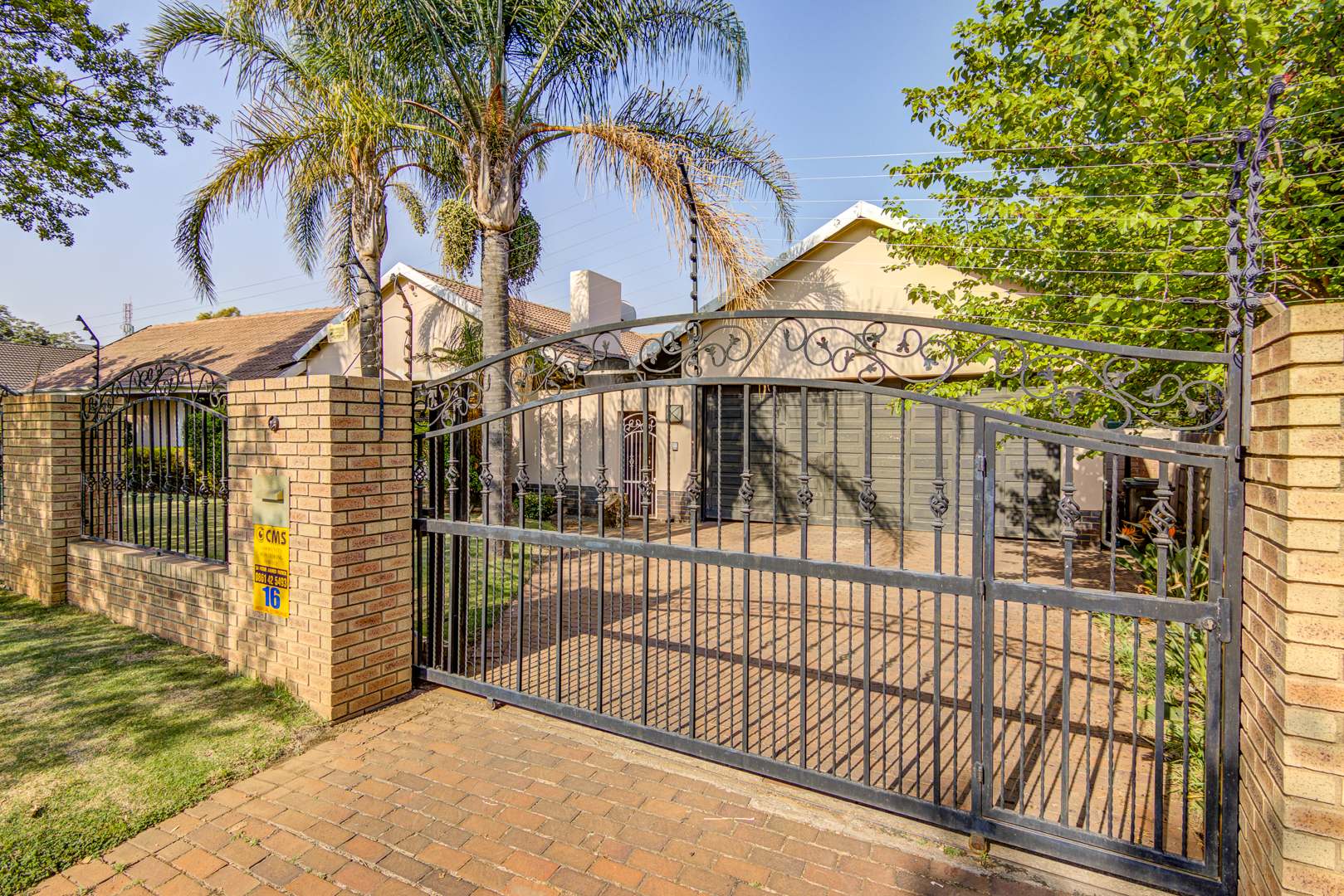 Discover an exquisite family residence nestled in the esteemed suburb of Farrarmere, Benoni, South Africa. This magnificent property, spanning a generous 992 sqm erf with a substantial 390 sqm under roof, offers a lifestyle of unparalleled comfort and sophisticated living. The grand entrance, secured by an ornate wrought iron gate, brick pillars, and electric fencing, is framed by mature palm trees and a brick-paved driveway, leading to a double garage and covered carport, providing ample secure parking for up to four vehicles.