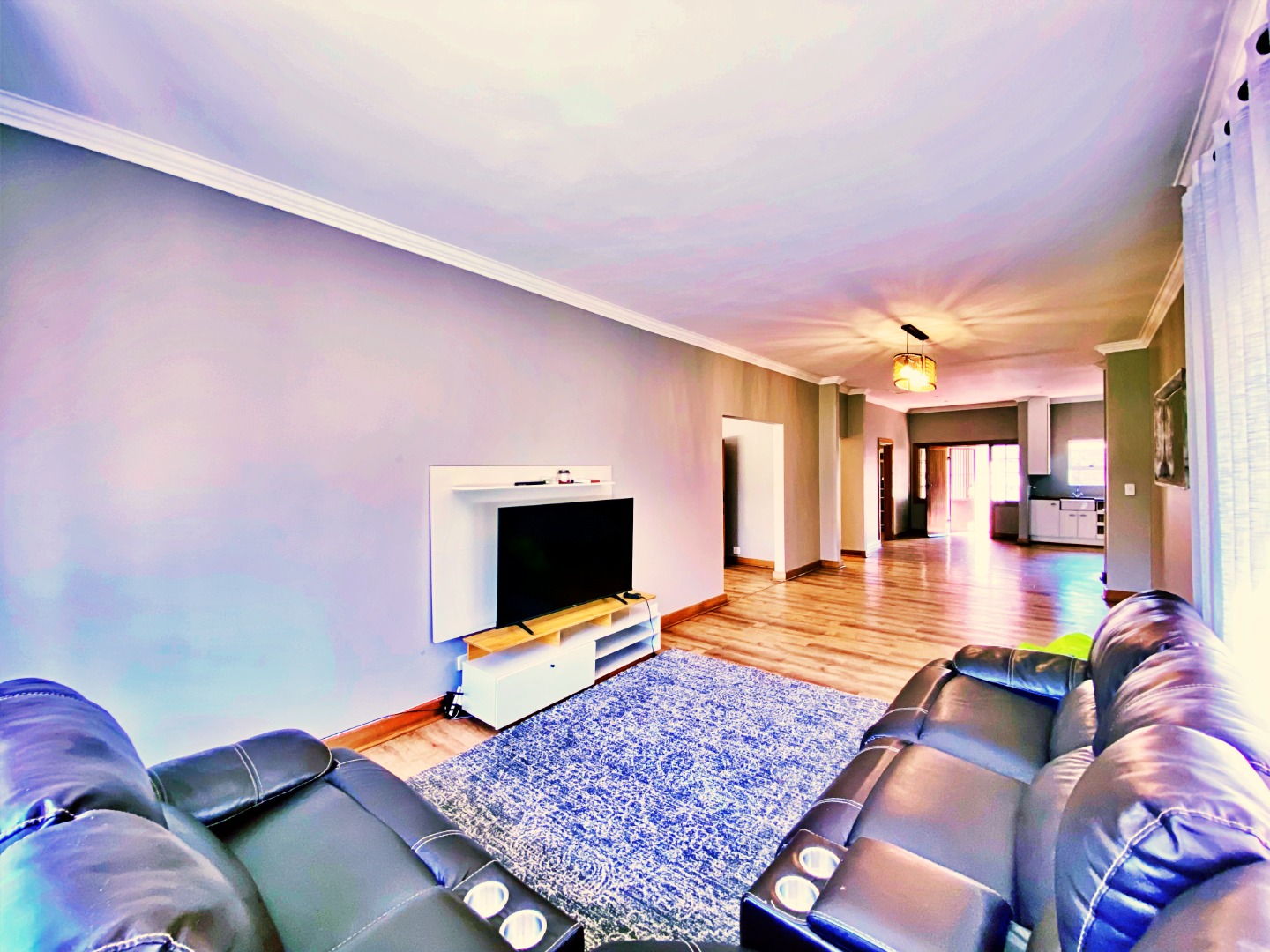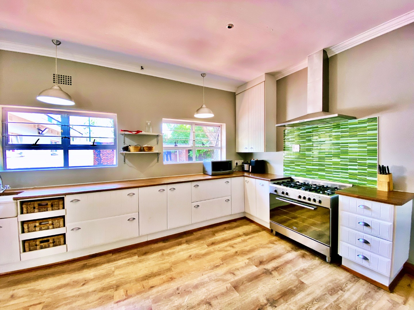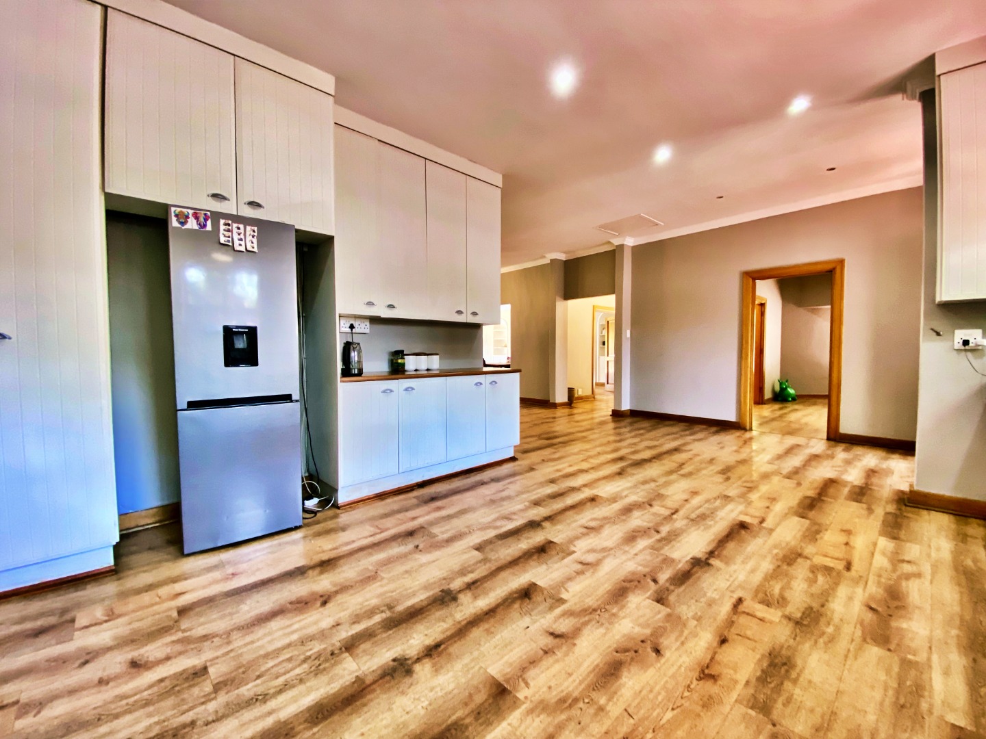 Step inside to discover a spacious open-plan living area that flows effortlessly between the lounge, dining room, and kitchen — ideal for family gatherings and relaxed entertaining. The country-style kitchen features a gas hob, ample cupboard space, and a separate laundry for added convenience.