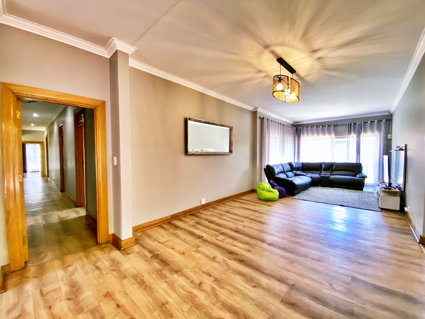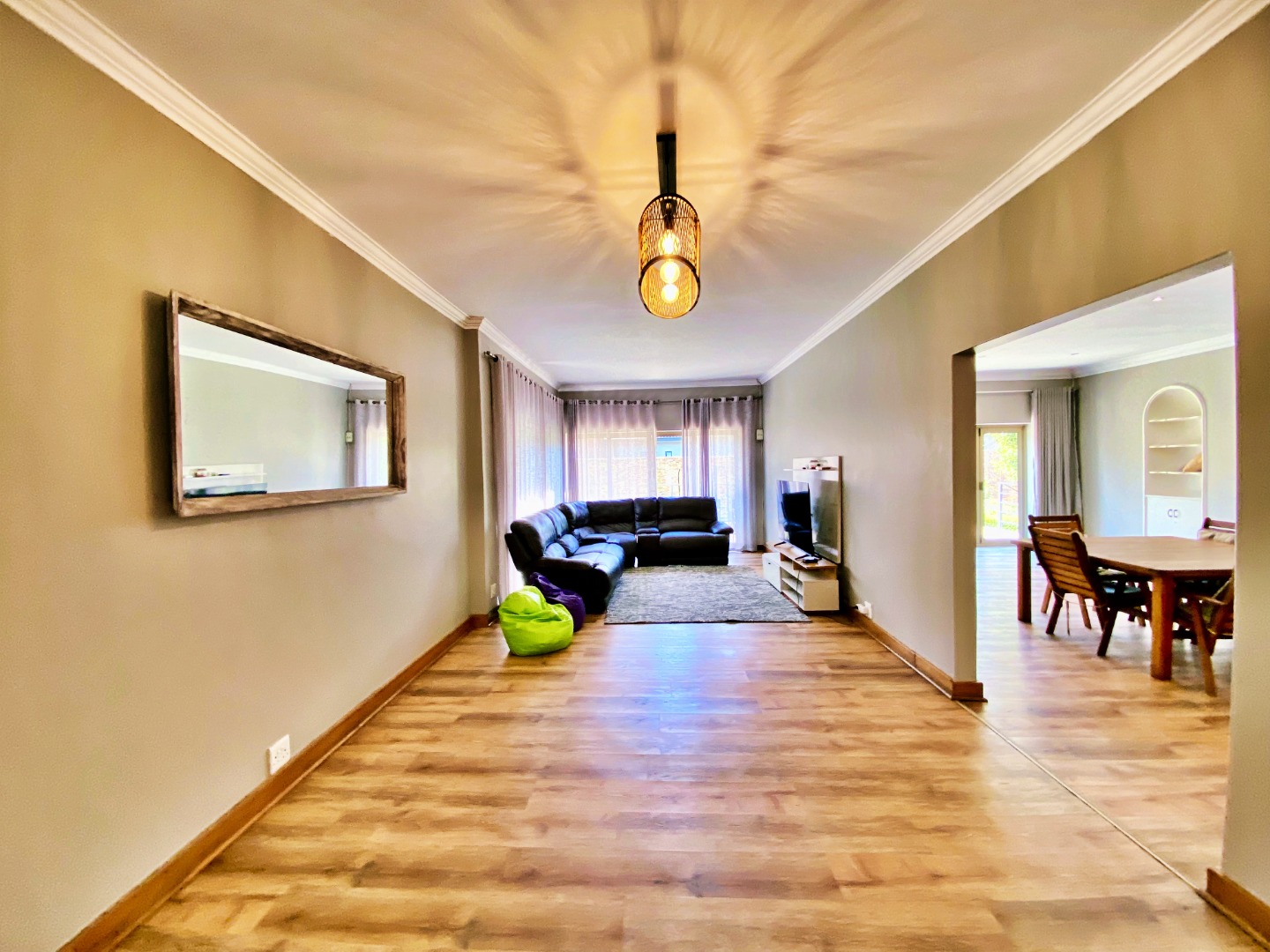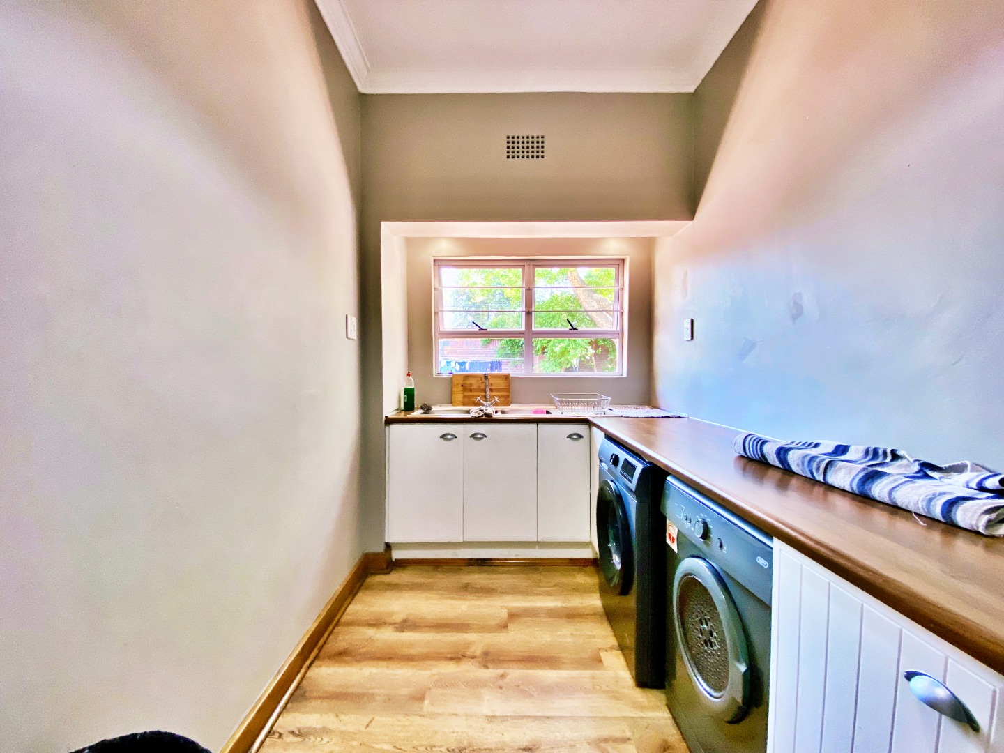 Step inside to discover a spacious open-plan living area that flows effortlessly between the lounge, dining room, and kitchen — ideal for family gatherings and relaxed entertaining. The country-style kitchen features a gas hob, ample cupboard space, and a separate laundry for added convenience.