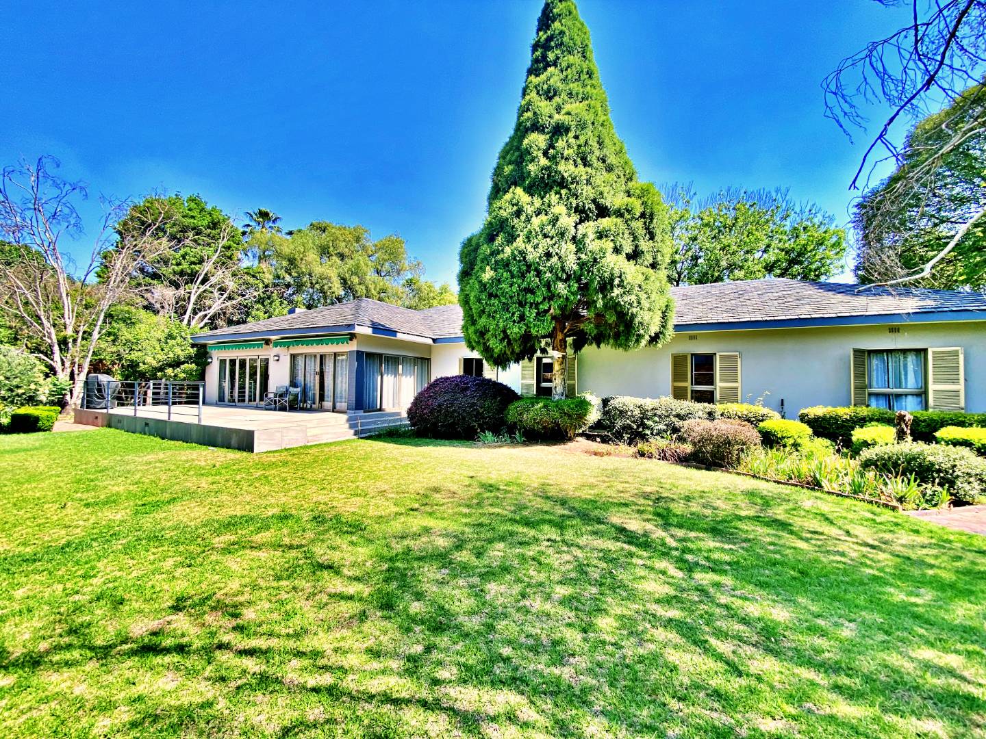 A dedicated study provides the perfect work-from-home space, while a separate TV room opens through sliding/stacker doors onto a covered patio, where you can unwind and enjoy views of the lush, tree-filled garden — a true retreat of peace and privacy.