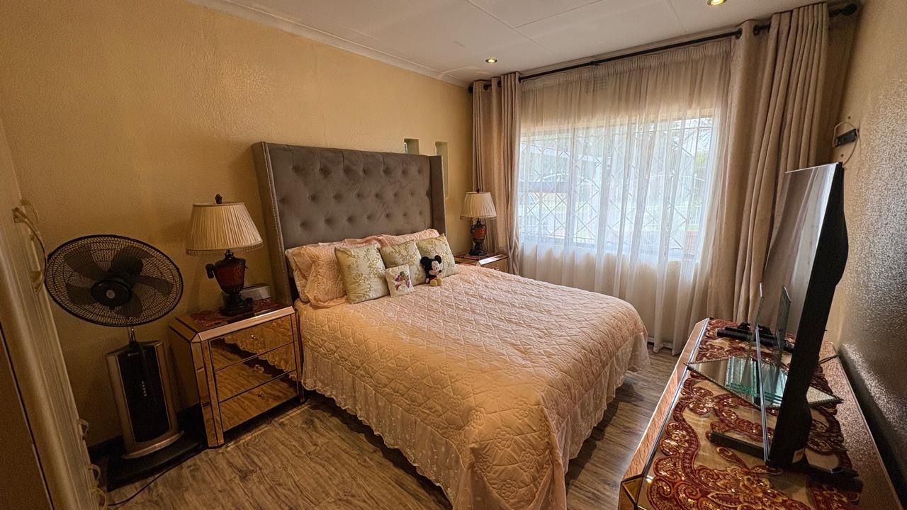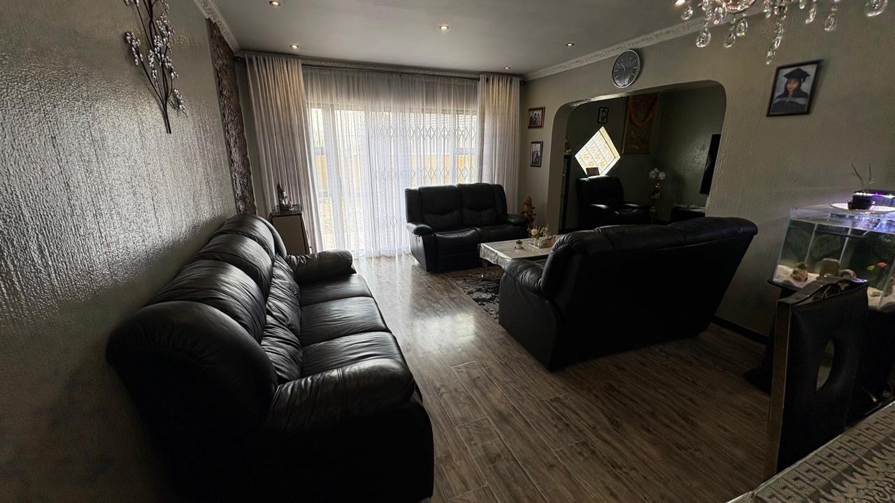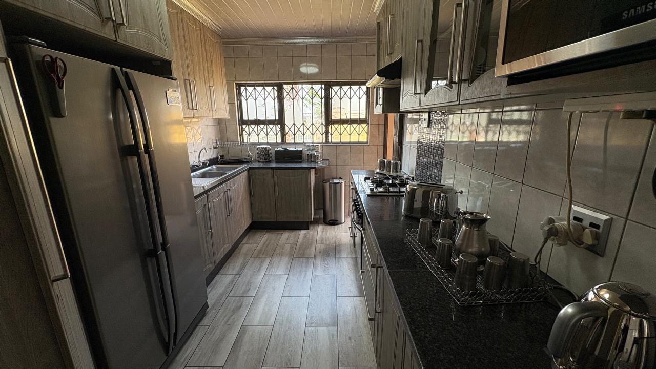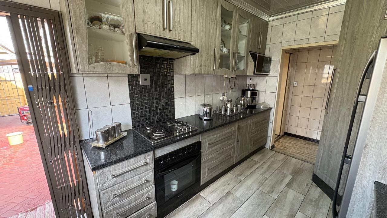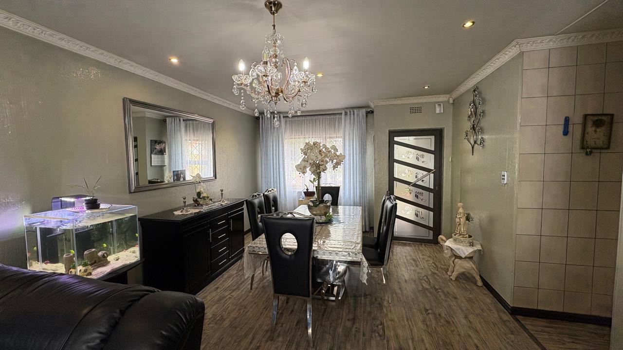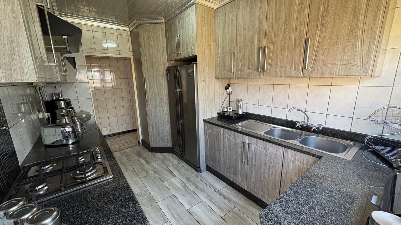 Step into this inviting home featuring a spacious open-plan living and dining area, with modern laminated flooring and elegant chandelier lighting. The property boasts two comfortable lounges, providing ample space for relaxation and entertainment. The well-appointed kitchen is a highlight, equipped with ample cupboard space and has granite countertops. There is a gas hob. This stylish kitchen also has space for a double door fridge.