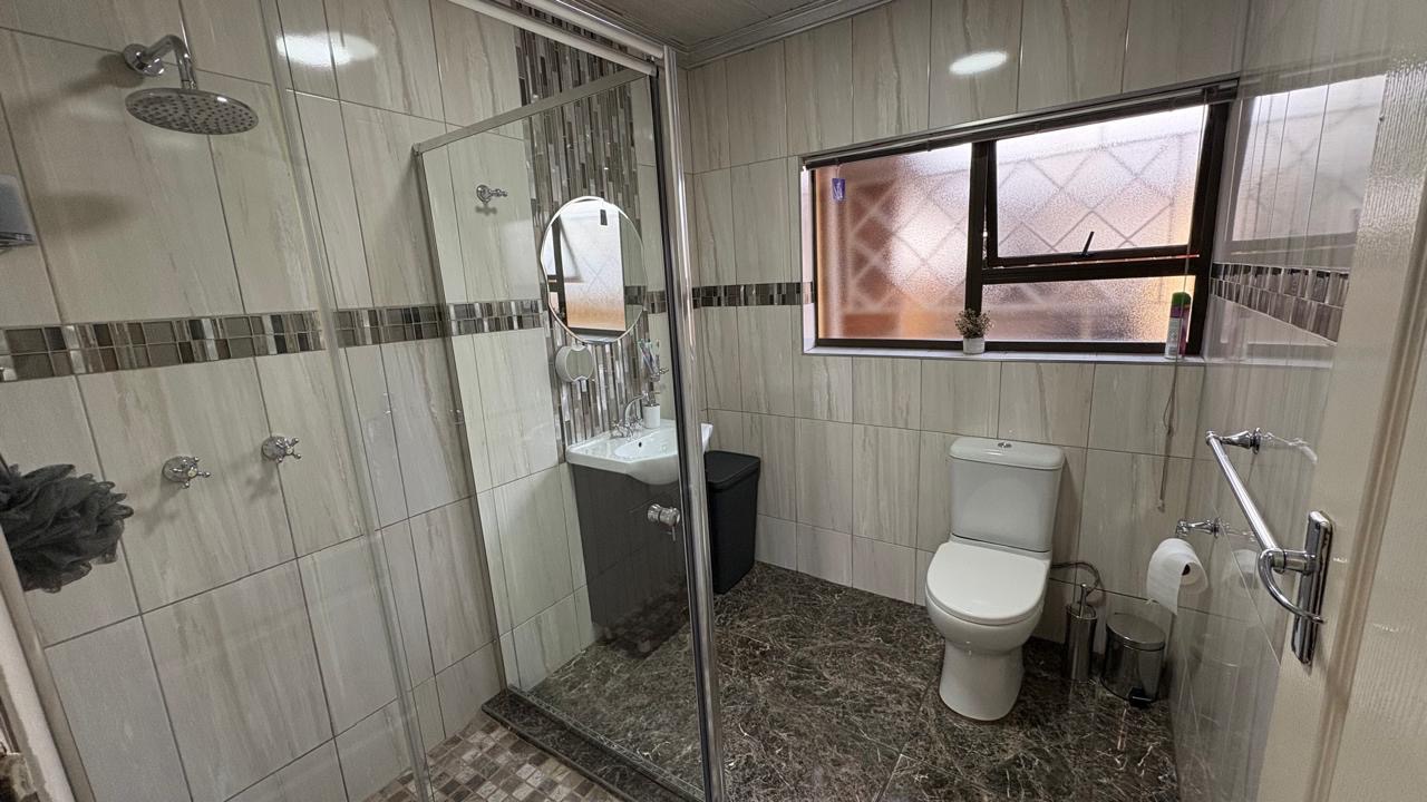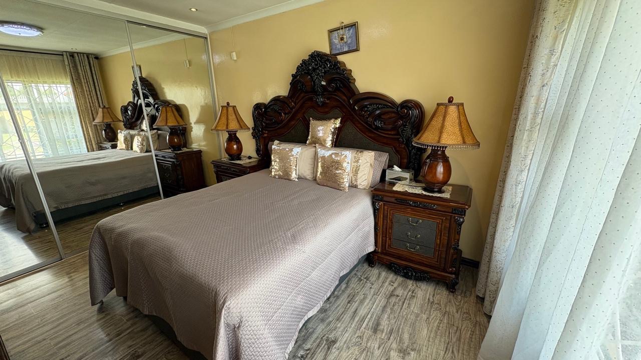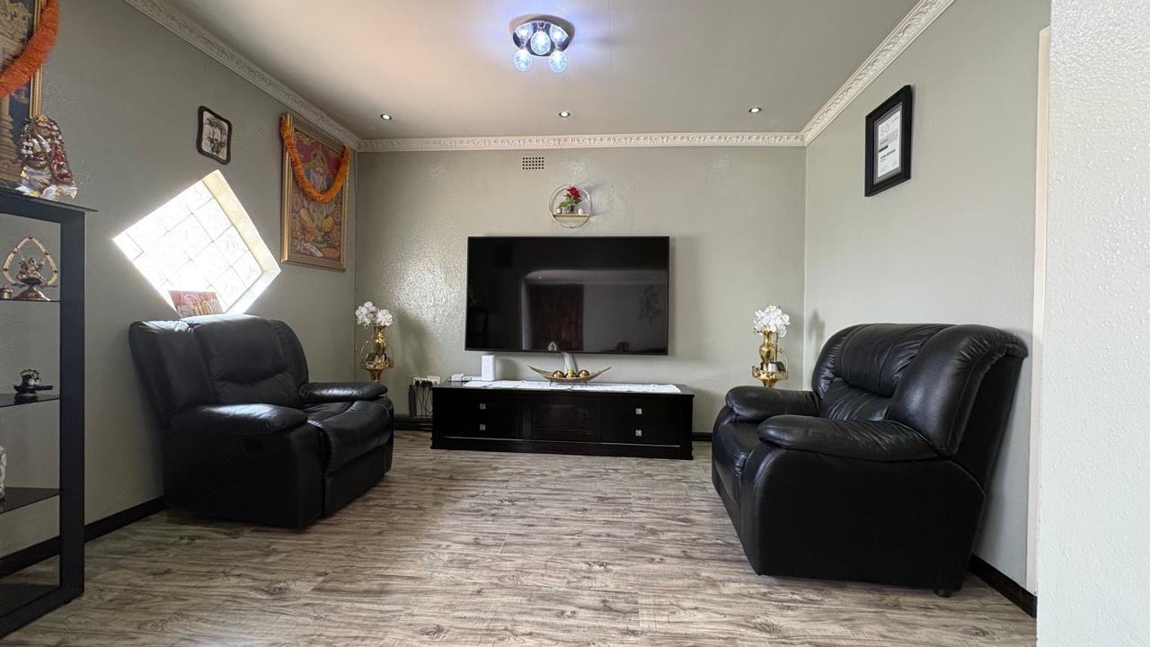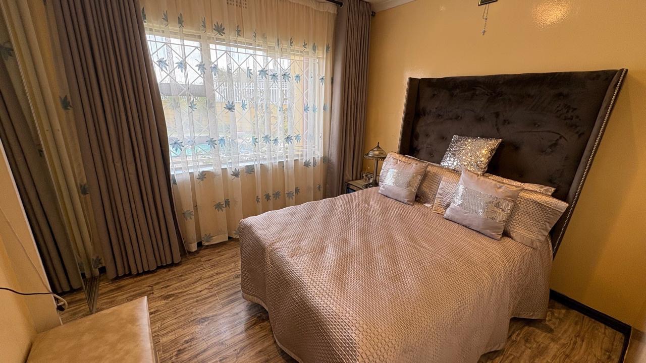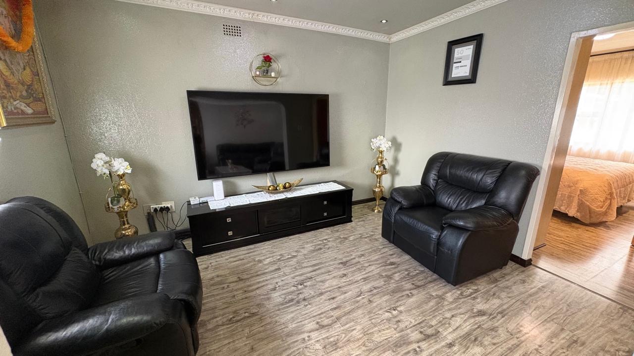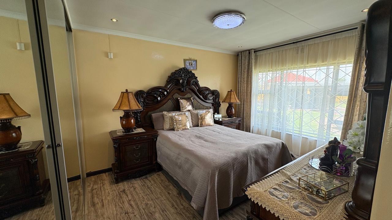 Step into this inviting home featuring a spacious open-plan living and dining area, with modern laminated flooring and elegant chandelier lighting. The property boasts two comfortable lounges, providing ample space for relaxation and entertainment. The well-appointed kitchen is a highlight, equipped with ample cupboard space and has granite countertops. There is a gas hob. This stylish kitchen also has space for a double door fridge.