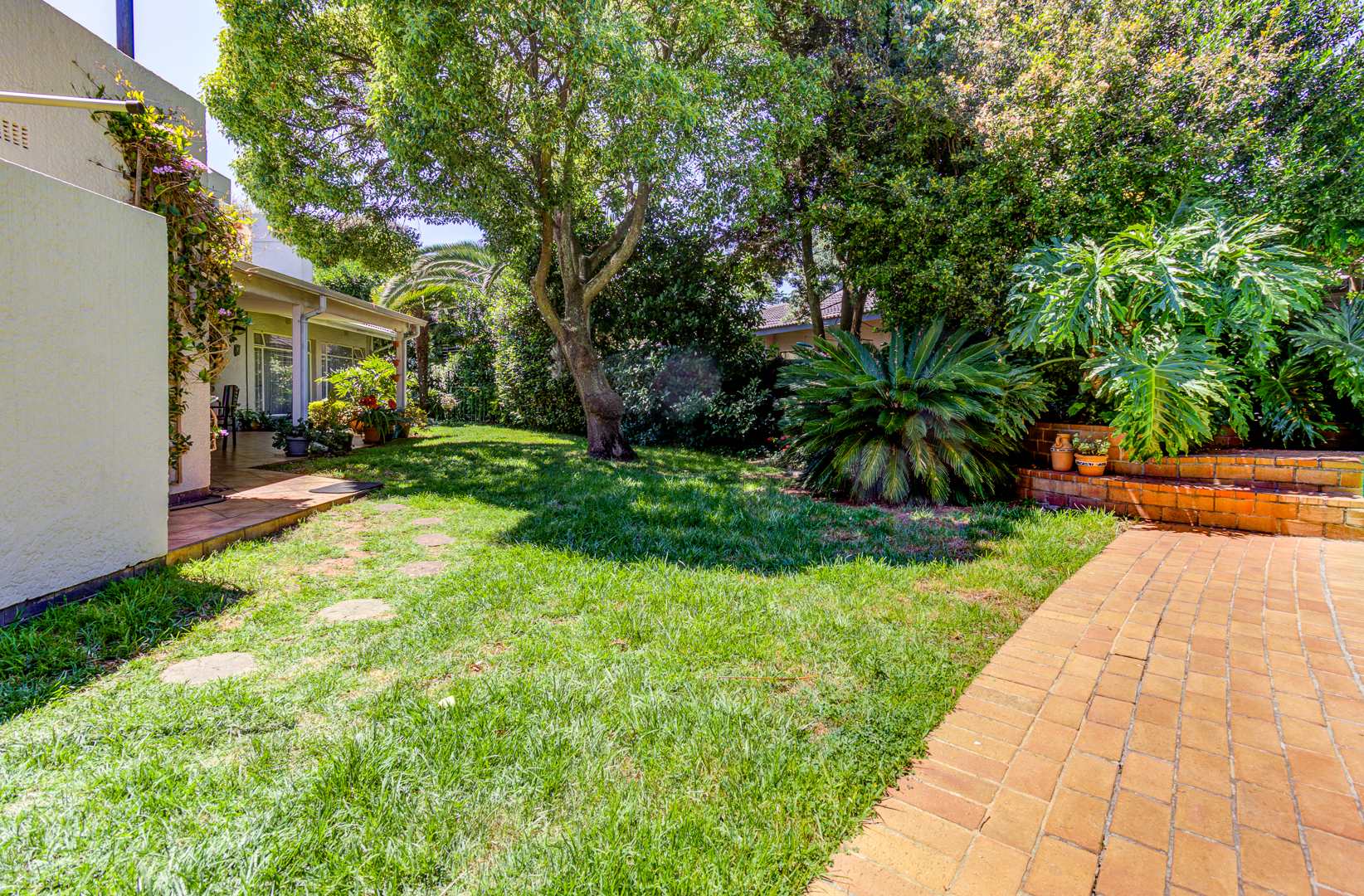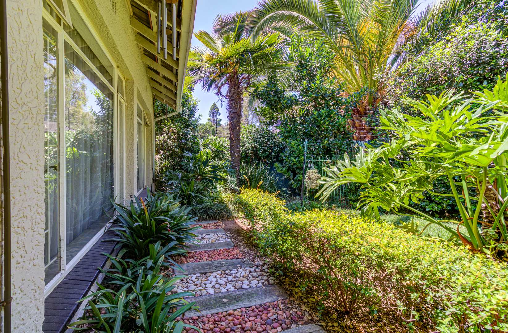 The expansive outdoor area is a true highlight, offering a private sanctuary amidst the bustling suburban environment. The meticulously manicured lawn and dense, mature greenery provide a serene backdrop for outdoor activities and quiet enjoyment. Numerous large windows and glass doors throughout the home invite abundant natural light, seamlessly connecting the interior with the beautiful garden surroundings. The double garage ensures secure vehicle accommodation and additional utility space.
