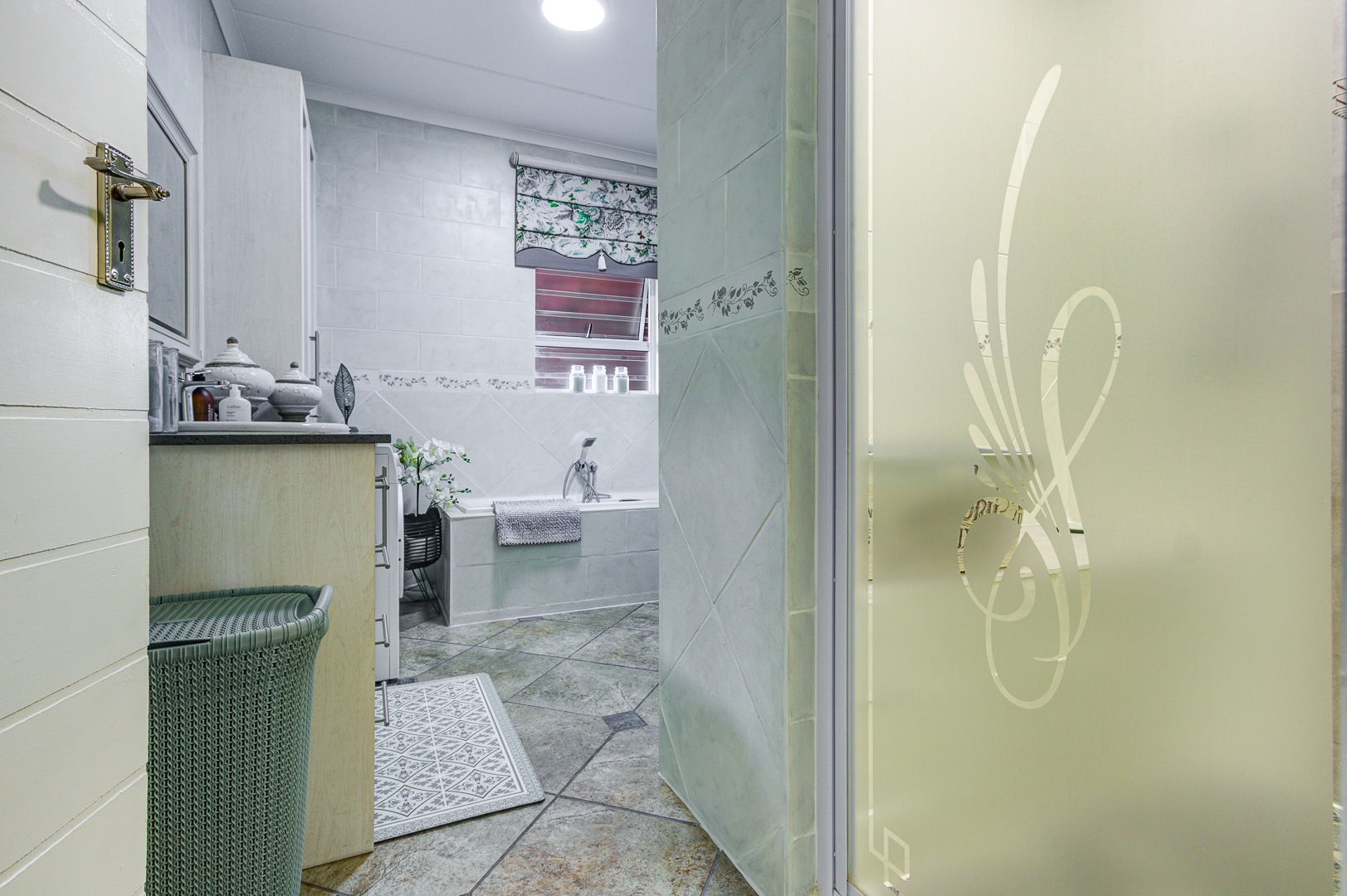 The tranquil bedroom serves as a serene retreat, featuring ample natural light, classic wooden accents, and elegant white Trellidor shutters, with a double locking mechanism, for refined light control. The well-appointed bathroom boasts a contemporary bathtub with a hand shower and a separate, private shower enclosure, ensuring both convenience and luxury. Thoughtful design elements throughout the interior contribute to a refined living experience.
