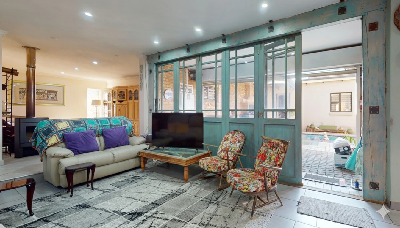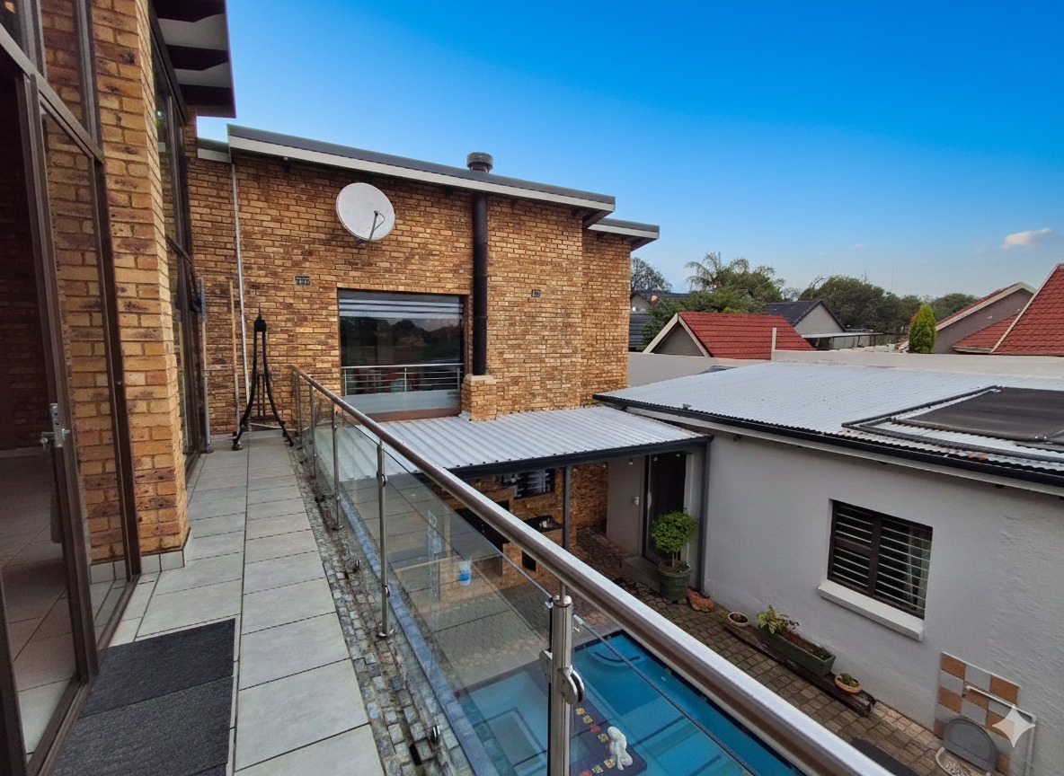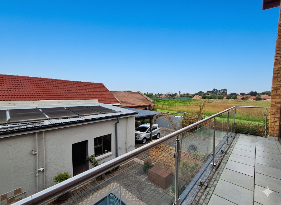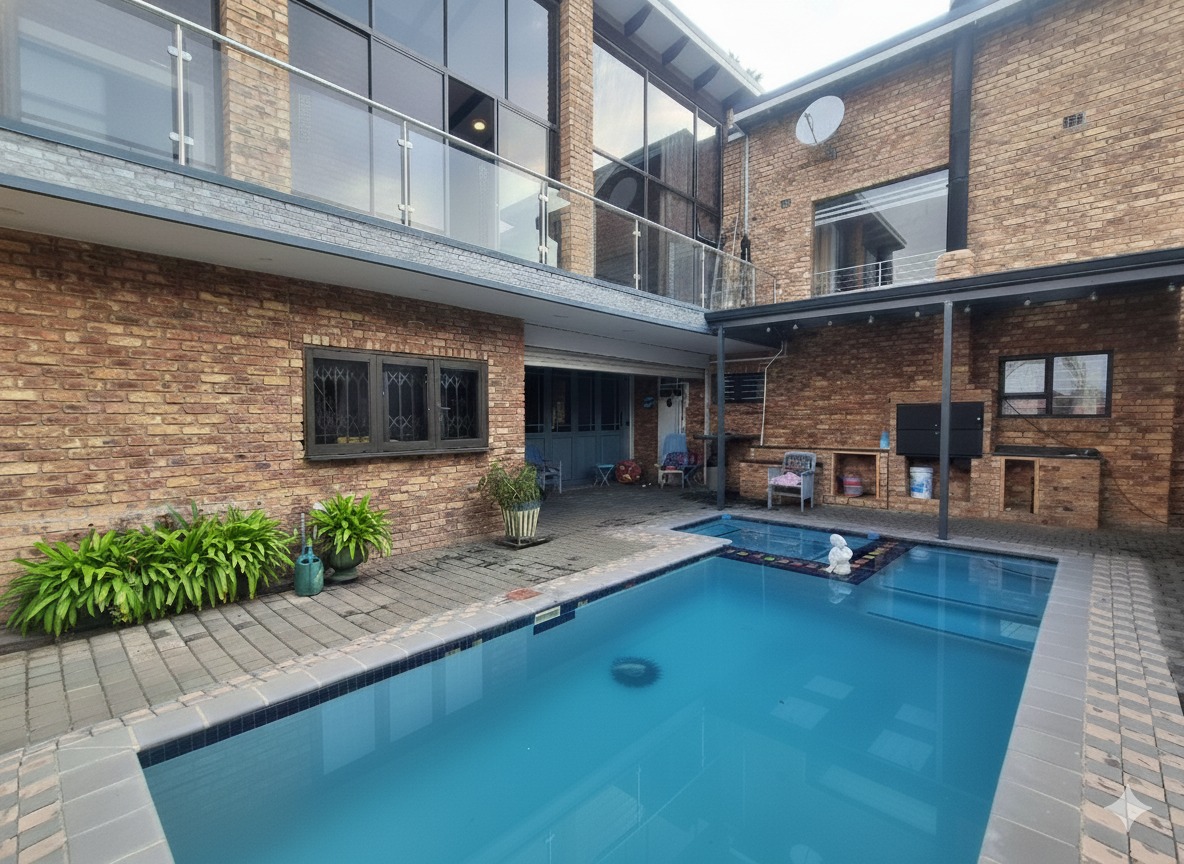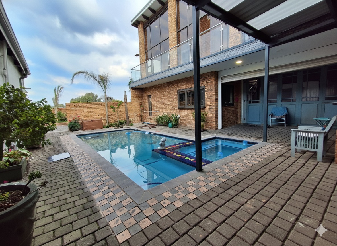 Discover this exceptional 5-bedroom, 6-bathroom residence nestled within a secure complex in the sought-after Rynfield, Benoni. Boasting a generous 660 sqm under roof on an 800 sqm erf, this home immediately impresses with its striking modern design, extensive glass elements, and durable brick exterior, ensuring excellent kerb appeal. The interior offers versatile living with two spacious lounges, two dining rooms, and two fully equipped kitchens, providing ample space for family life and entertaining. The vibrant entryway, featuring unique patterned floor tiles and a warm wooden door, sets an inviting tone. Each of the five bedrooms is complemented by six well-appointed bathrooms, ensuring comfort and privacy for all residents. The kitchens are designed for functionality and style, offering extensive storage, granite countertops, and modern tiled flooring. Natural light floods the living spaces, enhancing the contemporary feel. Step outside to a private outdoor oasis, perfect for relaxation and entertainment. Enjoy the swimming pool with an adjoining jacuzzi, set within a low-maintenance paved courtyard. The property also features a dedicated braai room and a modern balcony with glass railings, ideal for enjoying the scenic views. A well-maintained garden and paved driveway complete the exterior. Security and sustainability are paramount in this home. It benefits from being in a security complex, with additional features like electric fencing, an access gate, alarm system, CCTV, burglar bars, and a security gate. Eco-conscious living is supported by solar panels, a battery inverter, a solar geyser, and a rainwater harvesting system. Fibre connectivity is also available. Rynfield offers a desirable suburban lifestyle in Benoni, known for its convenient amenities and community atmosphere. Key Features: * 5 Bedrooms, 6 Bathrooms * 2 Kitchens, 2 Lounges, 2 Dining Rooms * Private Swimming Pool with Jacuzzi * Solar Panels, Inverter & Solar Geyser * Rainwater Harvesting System * Secure Complex with CCTV & Alarm * Built-in Braai Room * Balcony with Scenic Views * 3 Garages & 1 Parking * Fibre Ready
